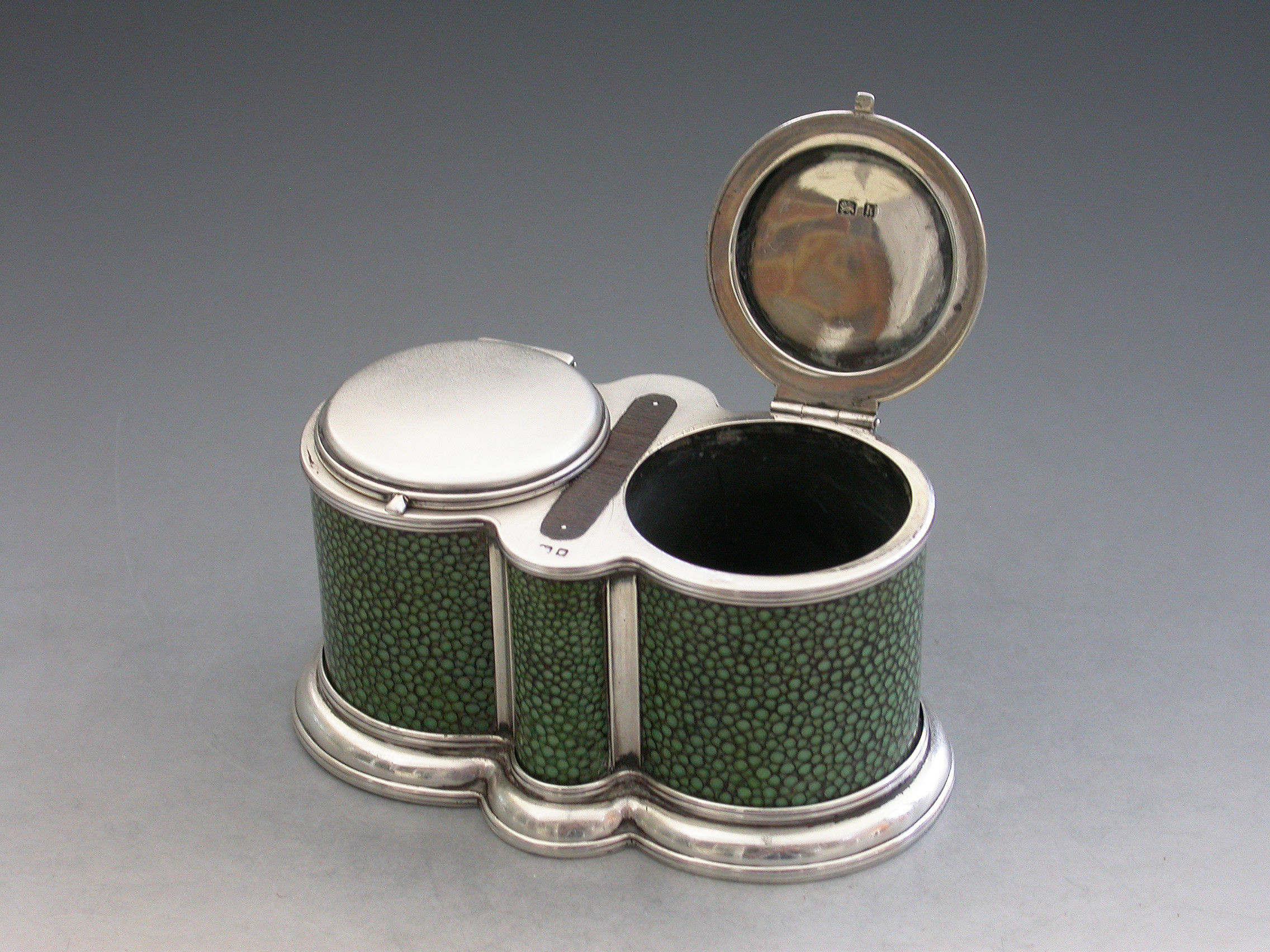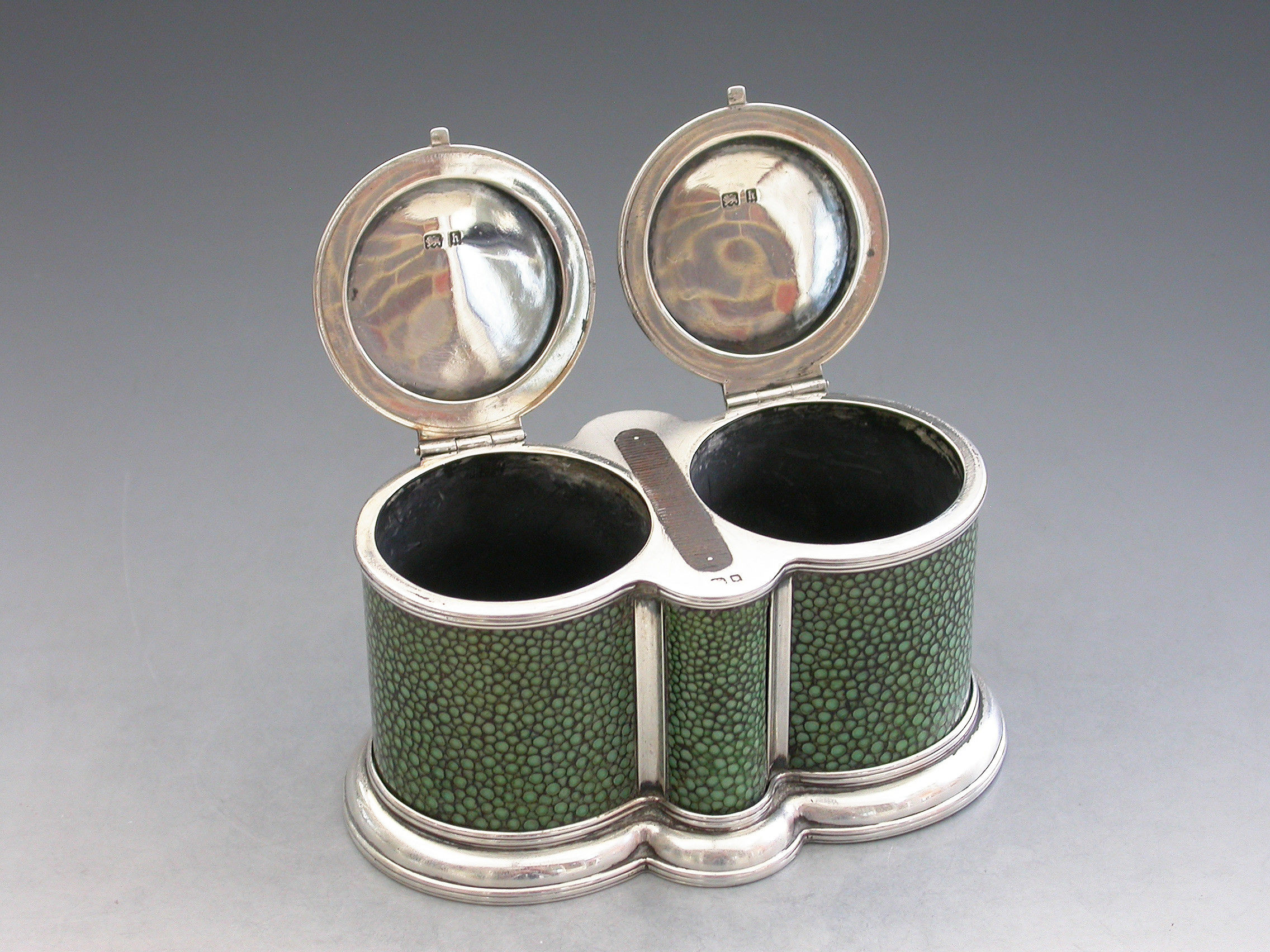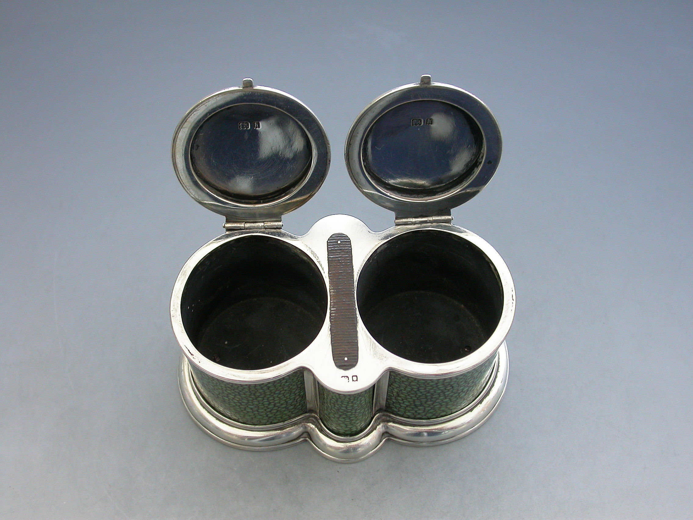 A good quality early 20th century shagreen mounted silver double Table Vesta Case of ""binocular"" form, on stepped reeded base, the two cylindrical compartments with flat hinged covers and with a steel striker set between them.
