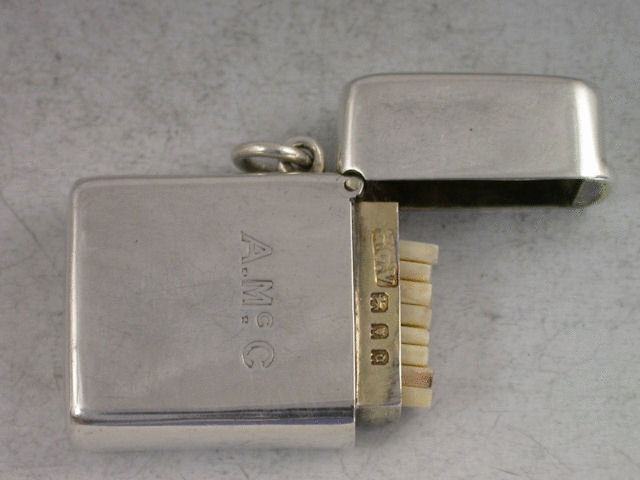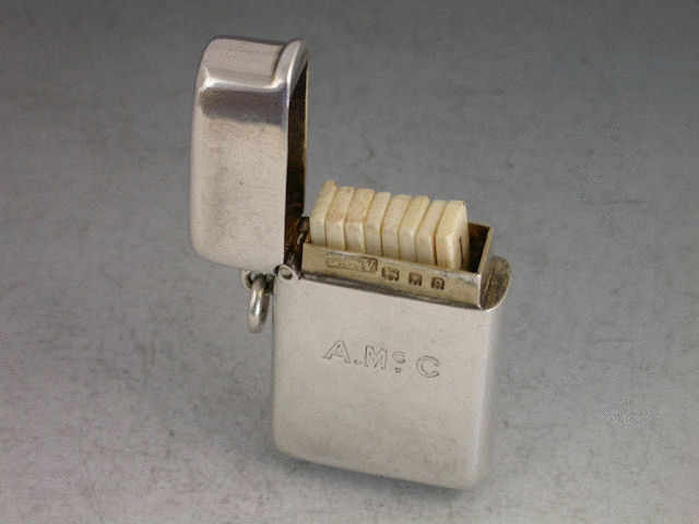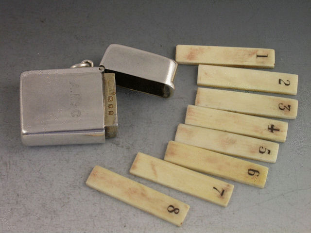A good early 20th century silver Butt Marker complete with 8 numbered ivory or bone pegs, the case of rounded rectangular form with hinged flip-top lid and attached suspension ring. Engraved with contemporary initials A.Mc.C.