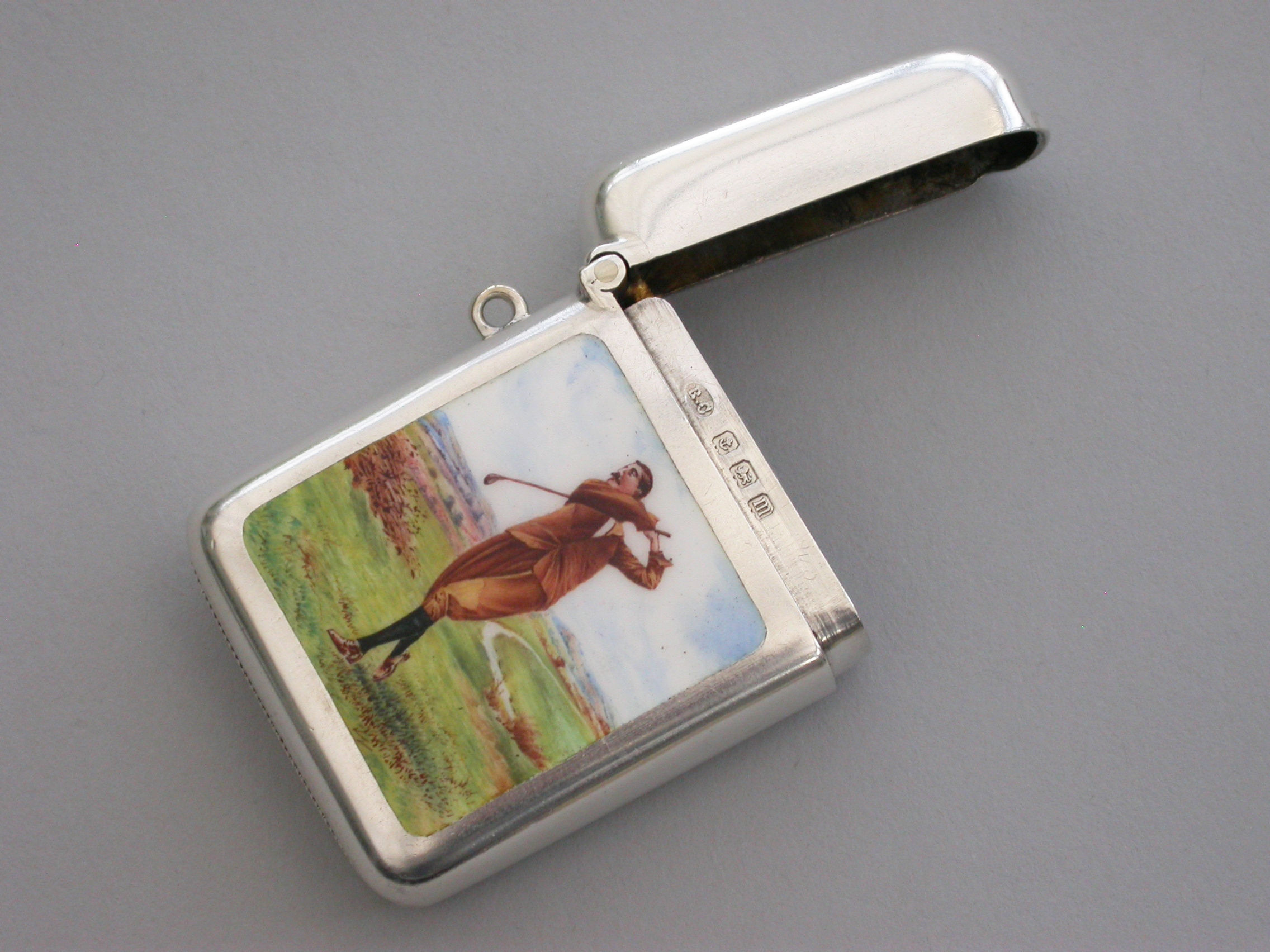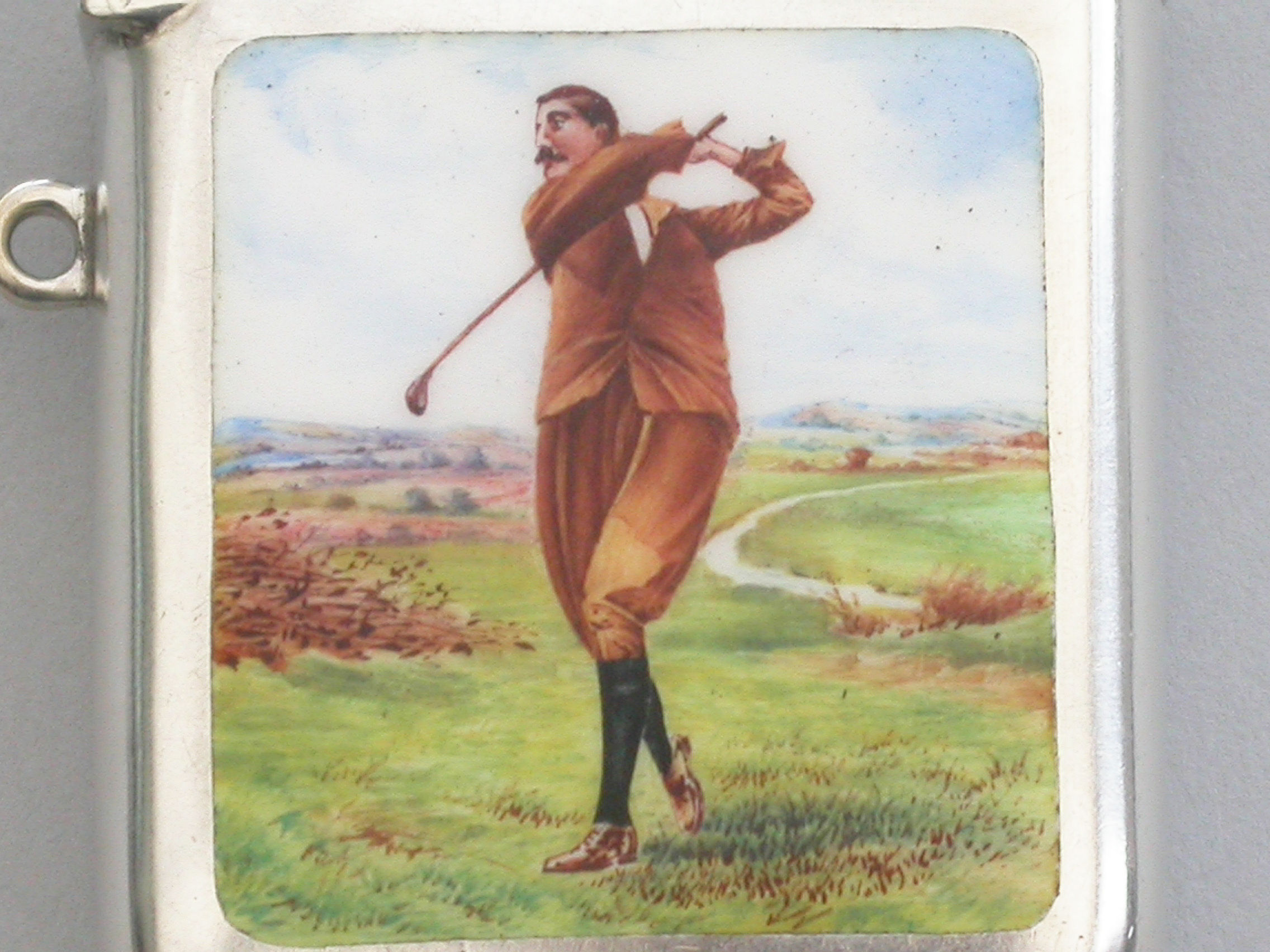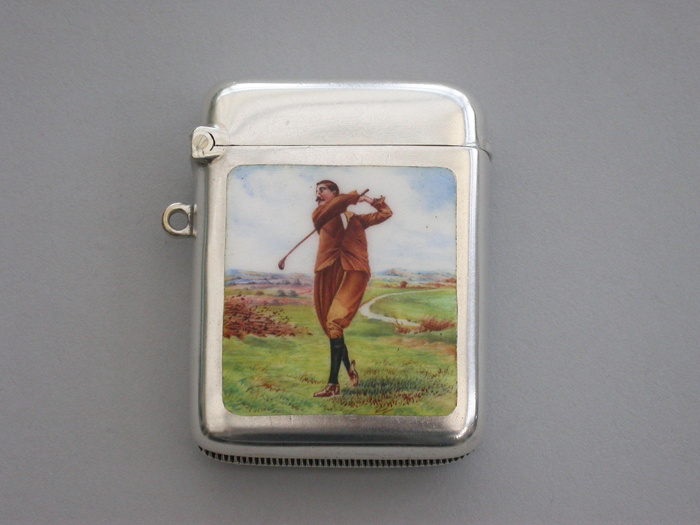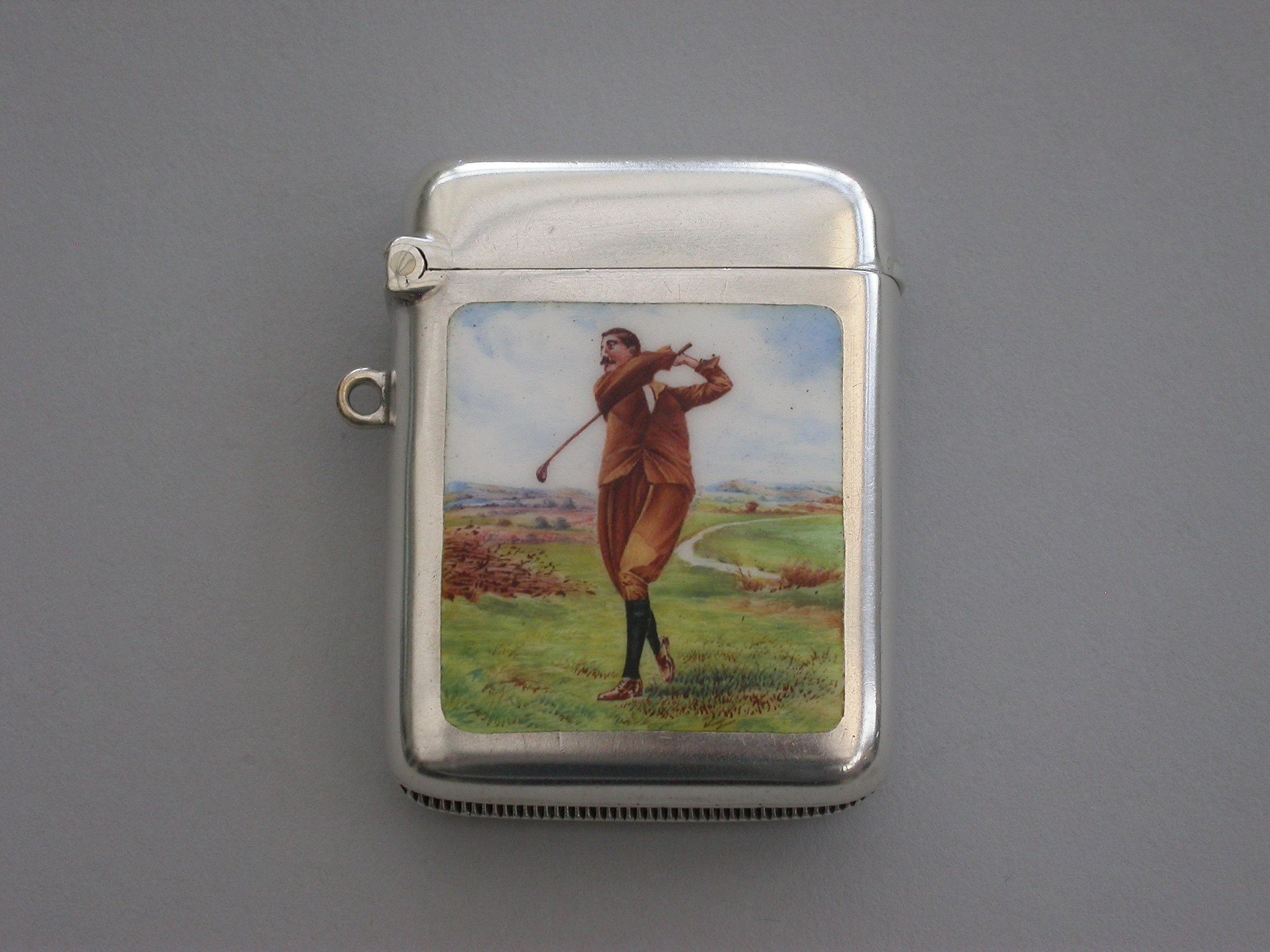A good quality early 20th century silver and enamel Vesta Case of rounded rectangular form with hinged flip-top lid and attached suspension ring, the face enamelled with a gentleman golfer in full swing.