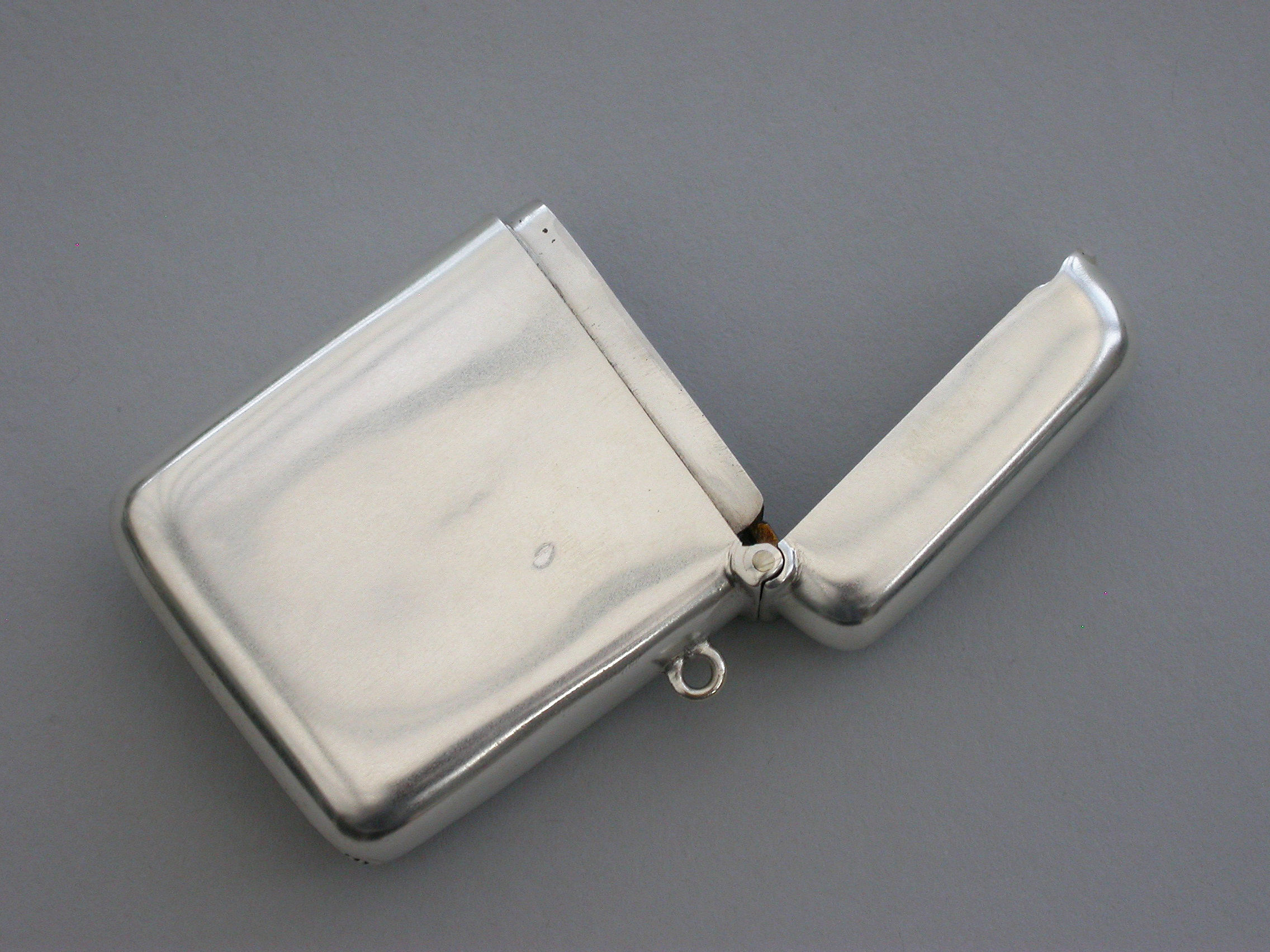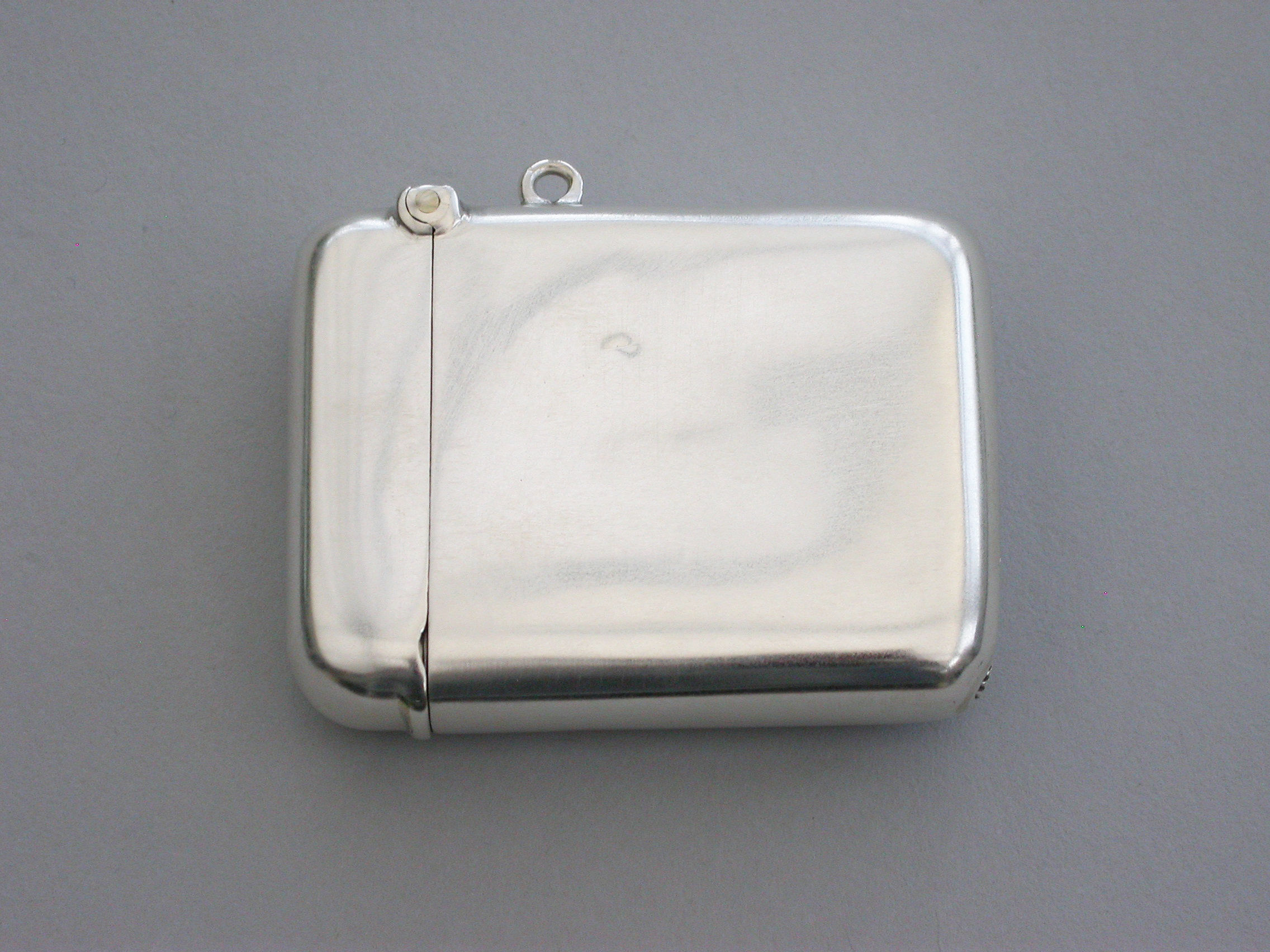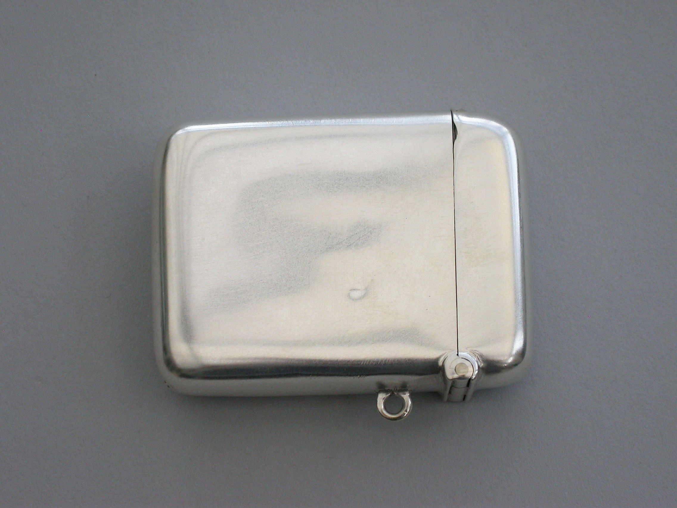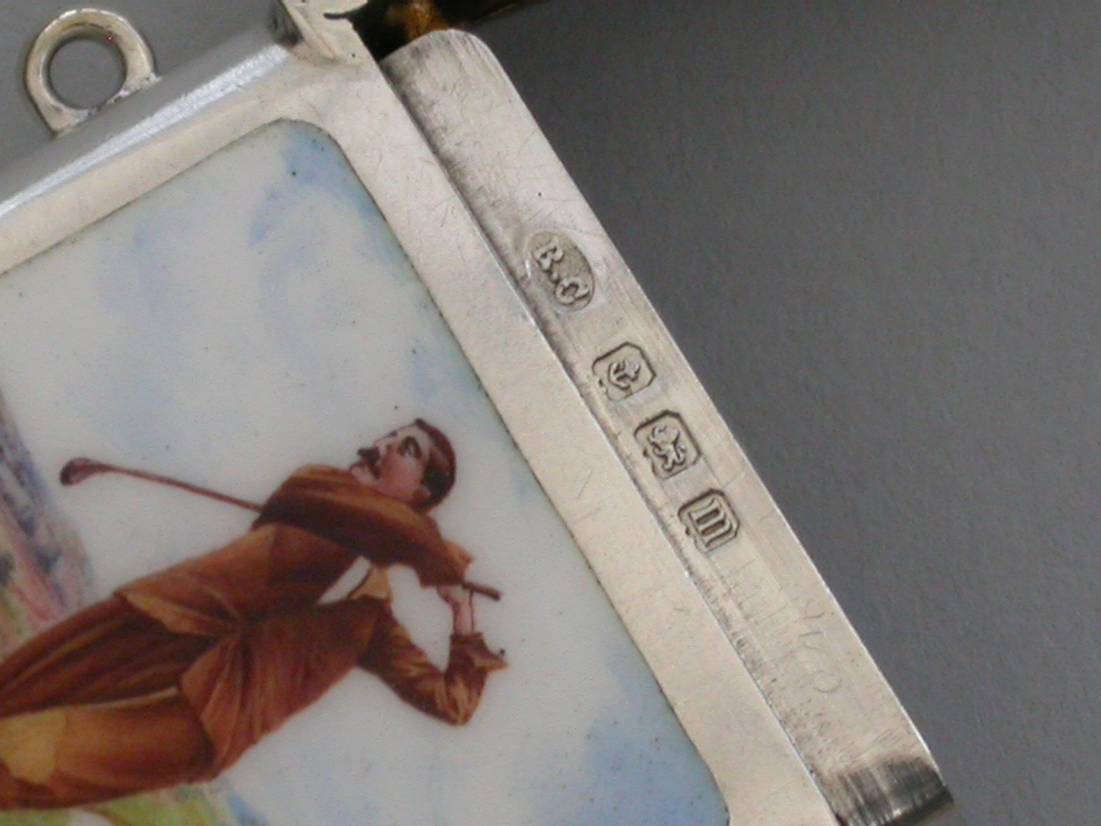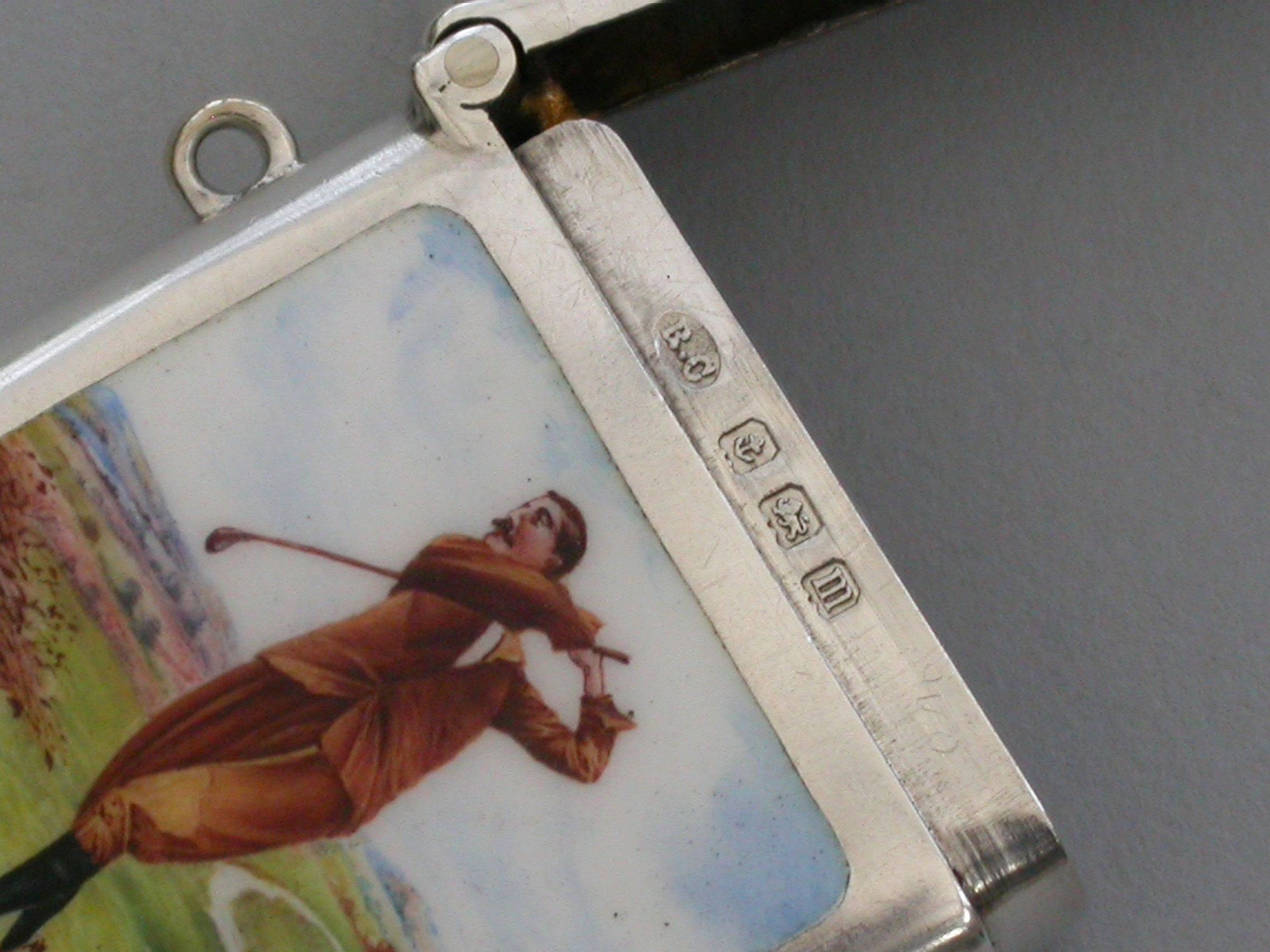 A good quality early 20th century silver and enamel Vesta Case of rounded rectangular form with hinged flip-top lid and attached suspension ring, the face enamelled with a gentleman golfer in full swing.