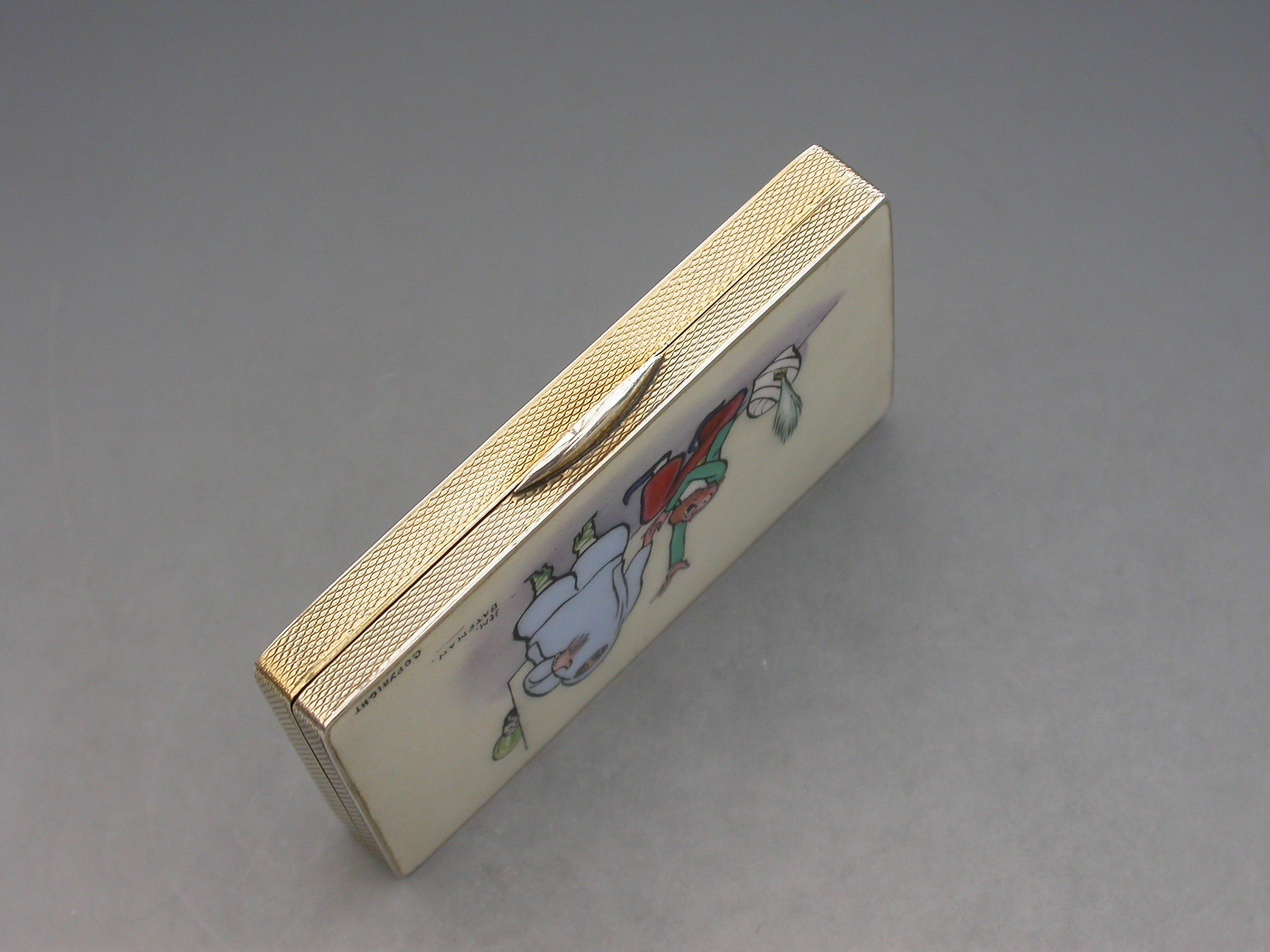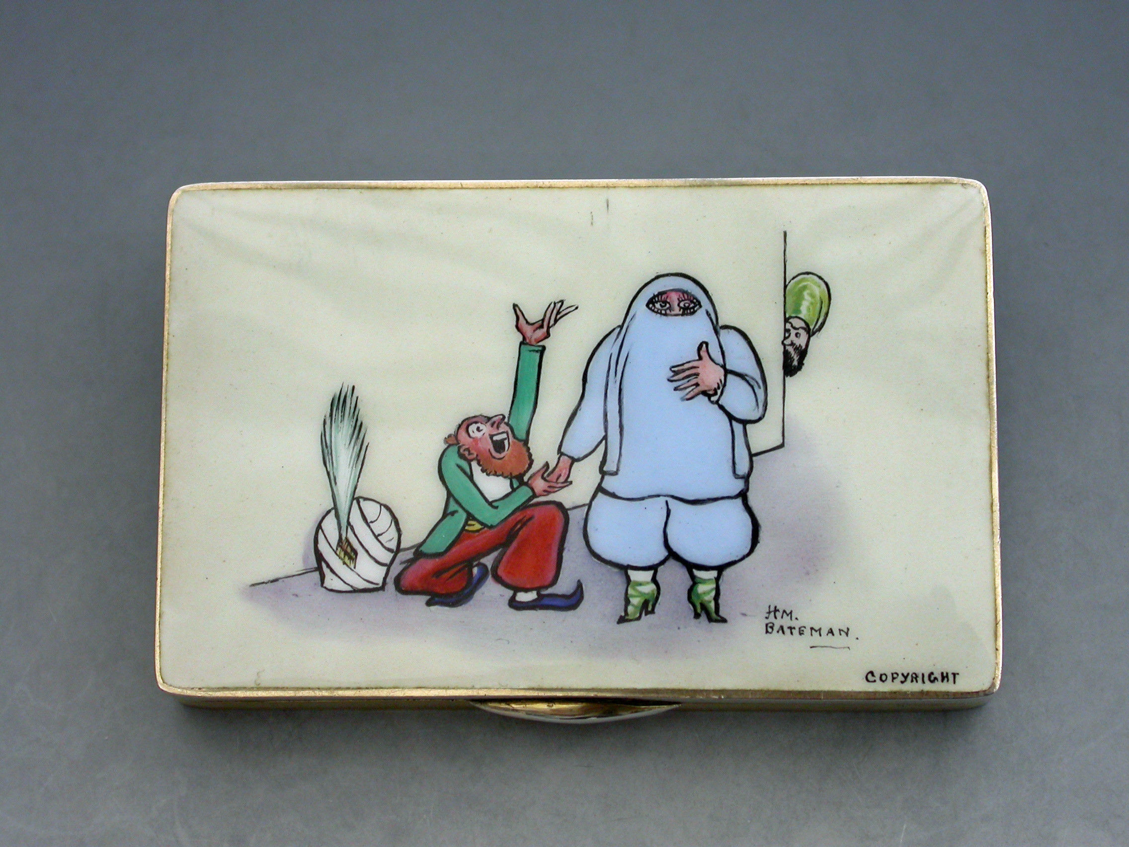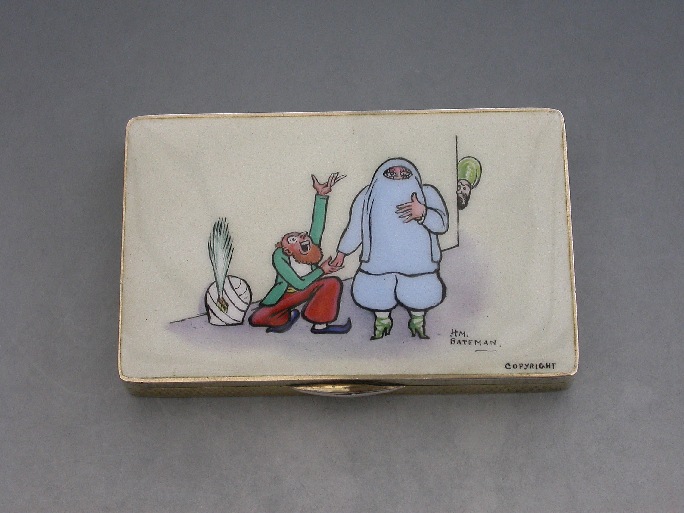 A rare early 20th century silver and enamel Snuff Box of rectangular form with engine turned base and sides, the lid inset with an enamel panel depicting a satirical cartoon by H M Bateman. Hinged lid and silver gilt interior.