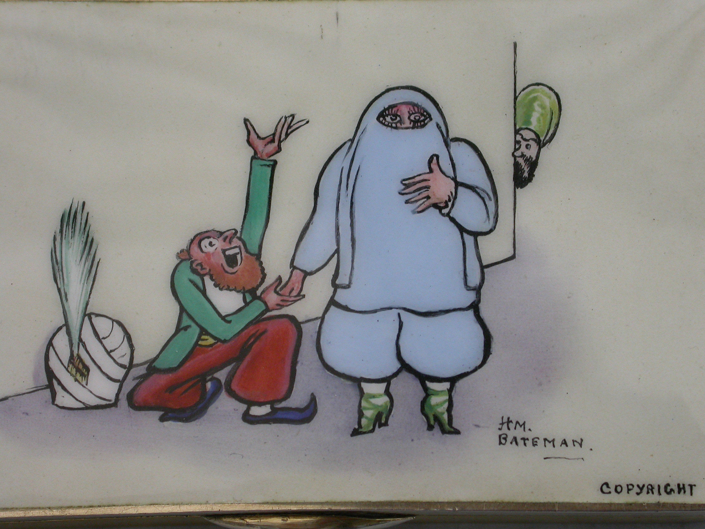 H. M. Bateman was noted for his ""The Man Who..."" series of cartoons, featuring comically exaggerated reactions to minor and usually upper-class social gaffes, such as ""The Man Who Lit His Cigar Before the Royal Toast"", ""The Man Who Threw a Snowball at St. Moritz"" and ""The Boy Who Breathed on the Glass at the British Museum."