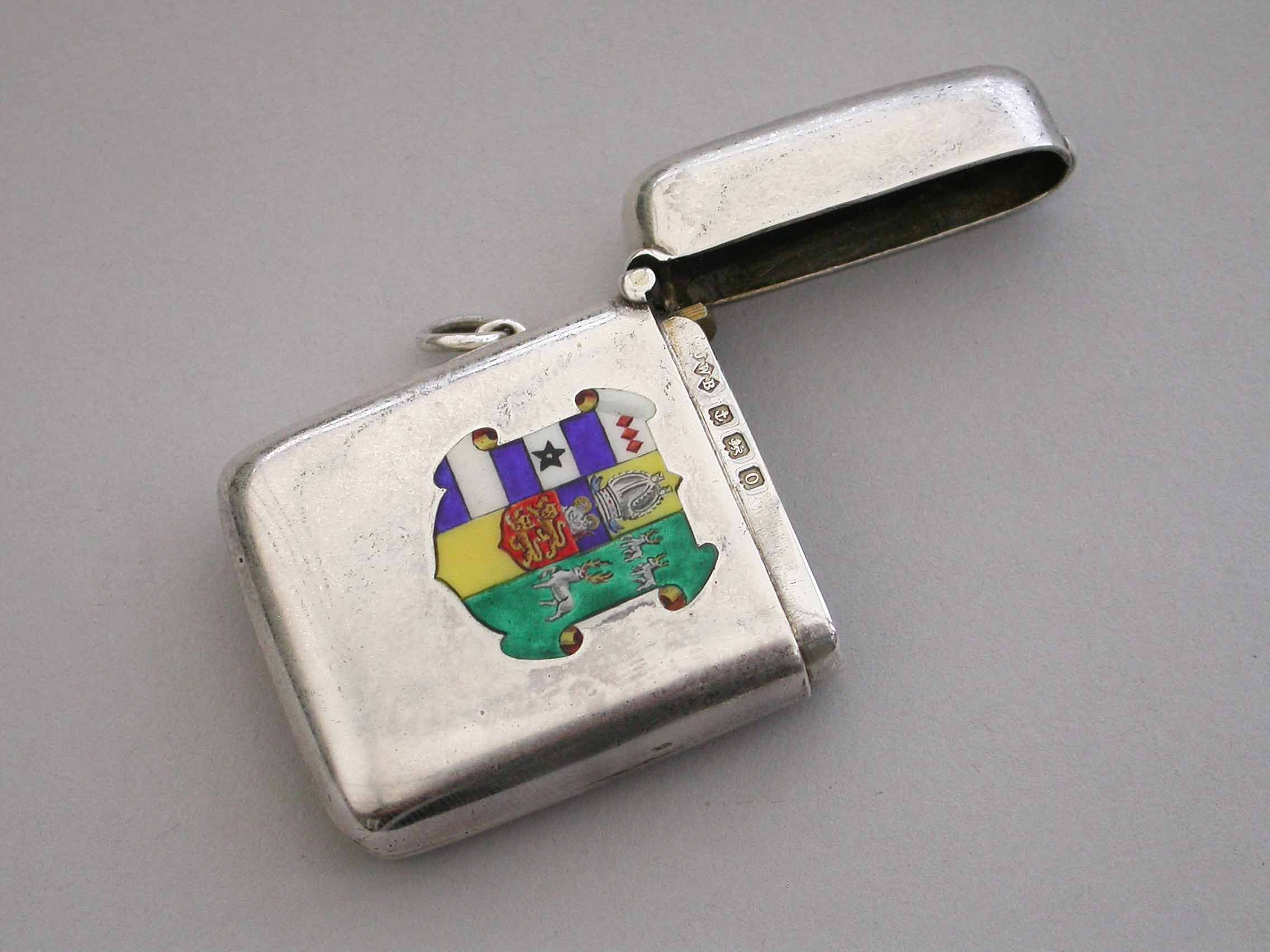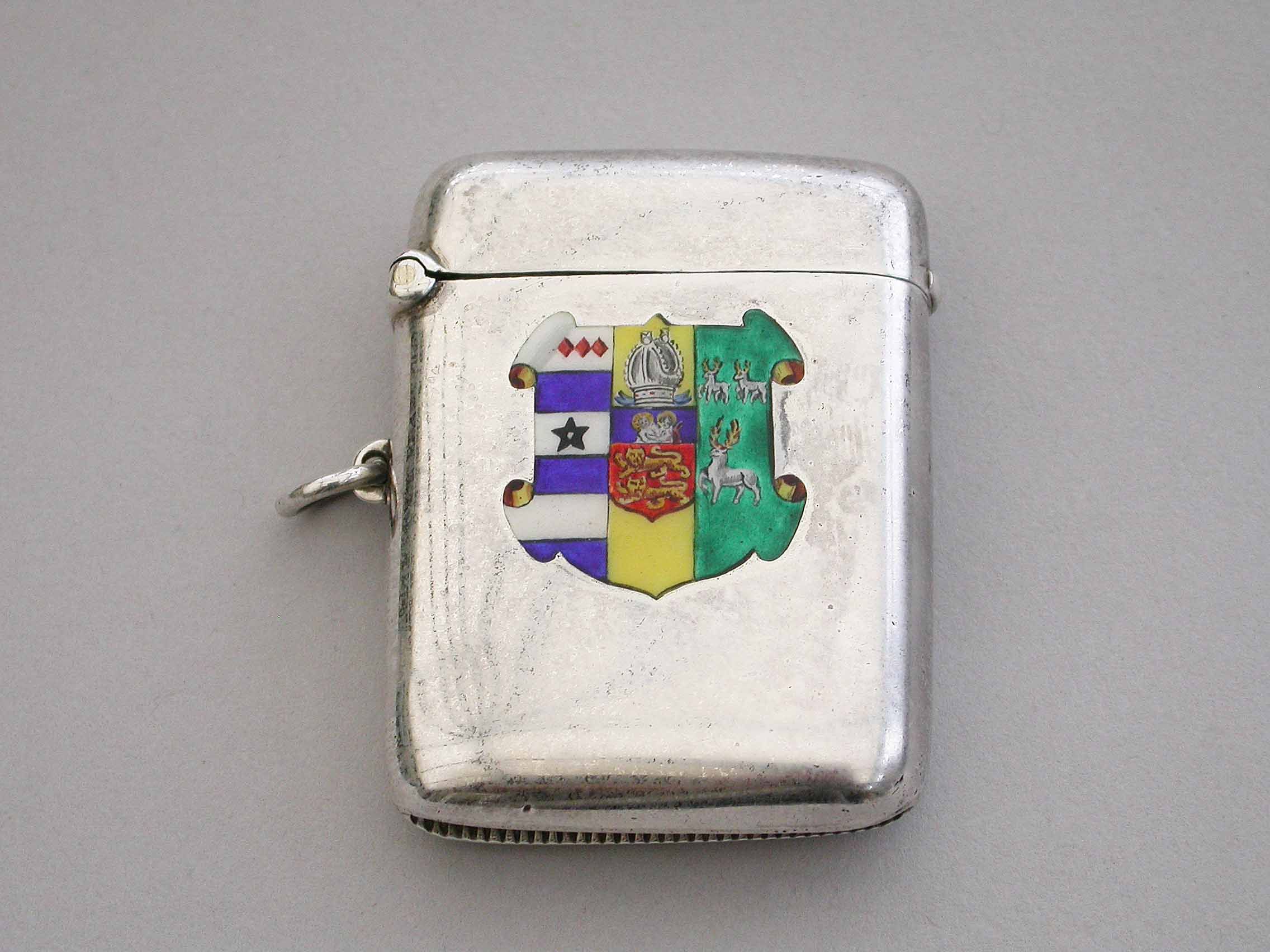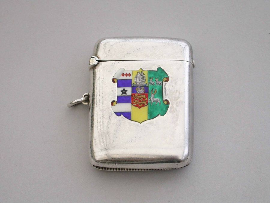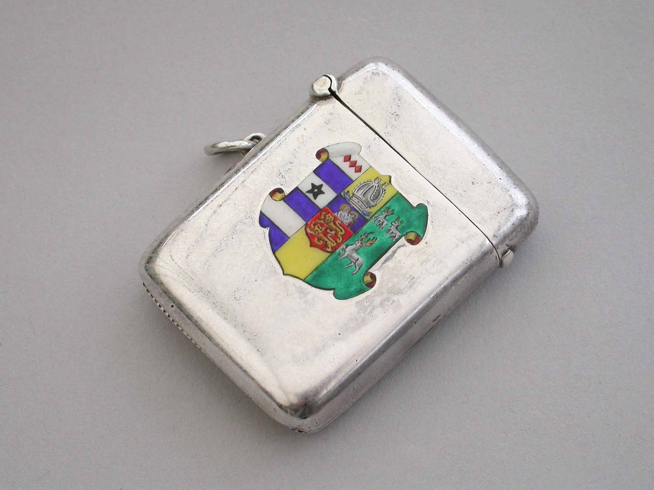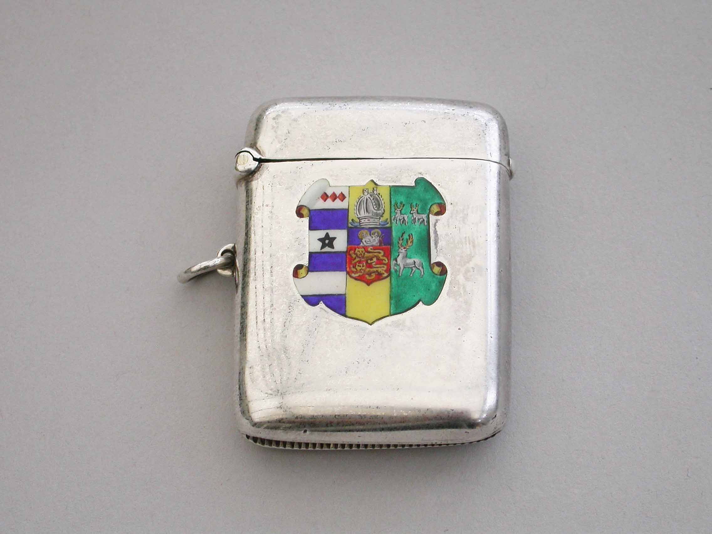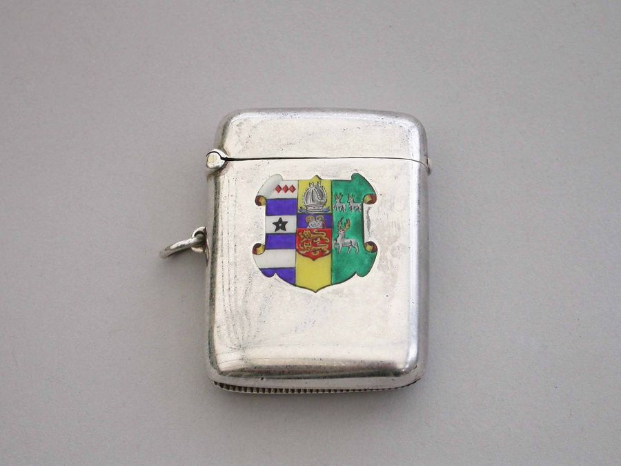 A good George V silver and enamel Vesta Case of rounded rectangular form with sprung hinged lid and attached suspension ring, the face enameled with the Coat of Arms of Lincoln College, Oxford University.