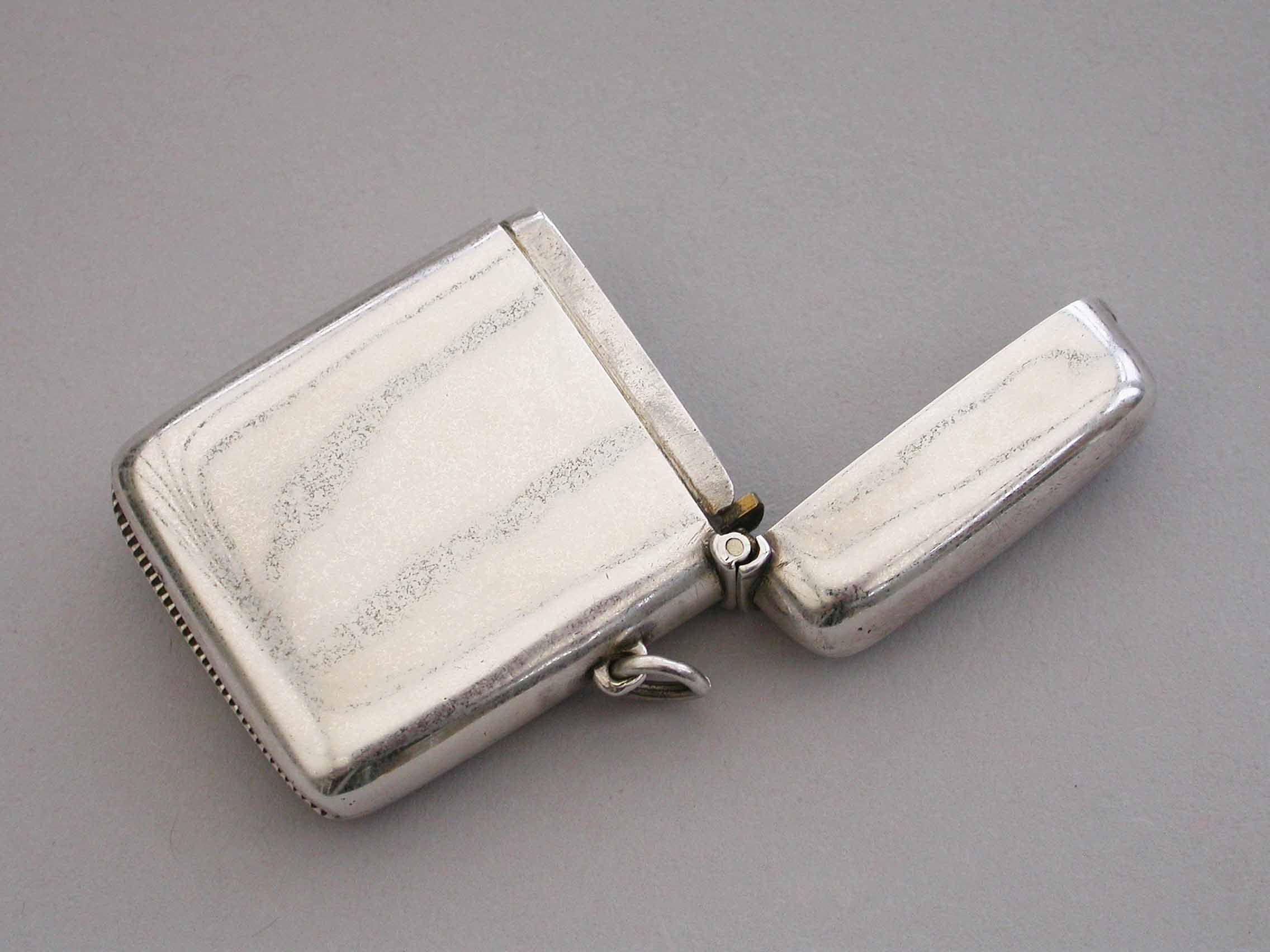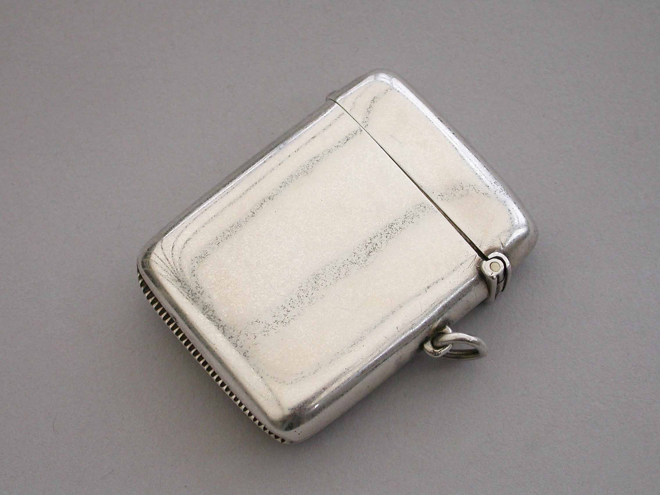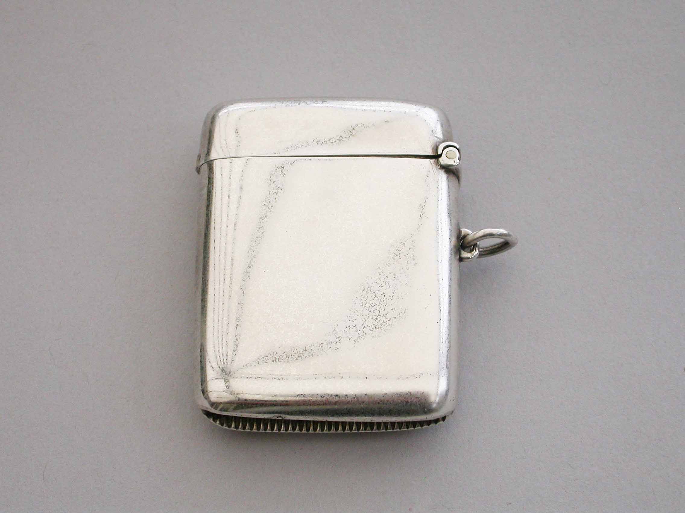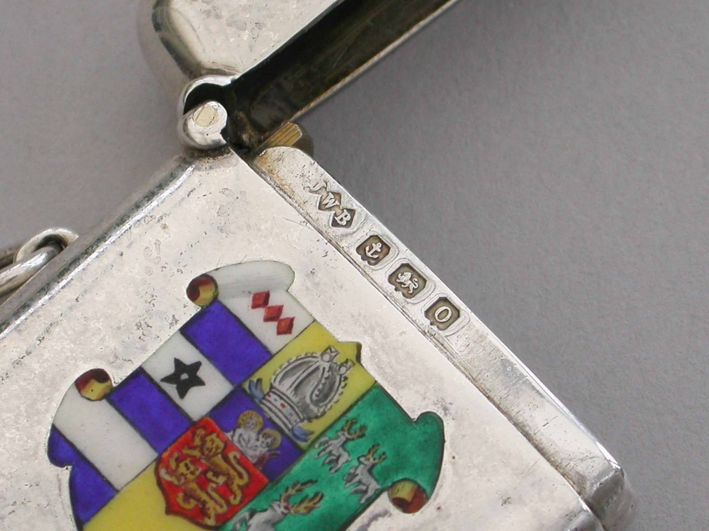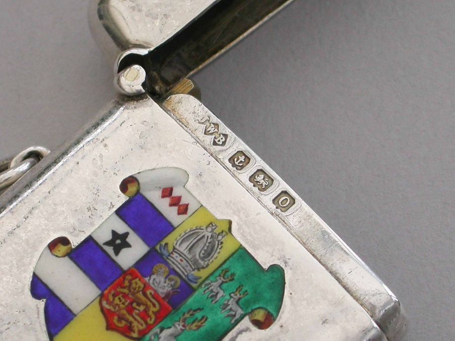 A good George V silver and enamel Vesta Case of rounded rectangular form with sprung hinged lid and attached suspension ring, the face enameled with the Coat of Arms of Lincoln College, Oxford University.