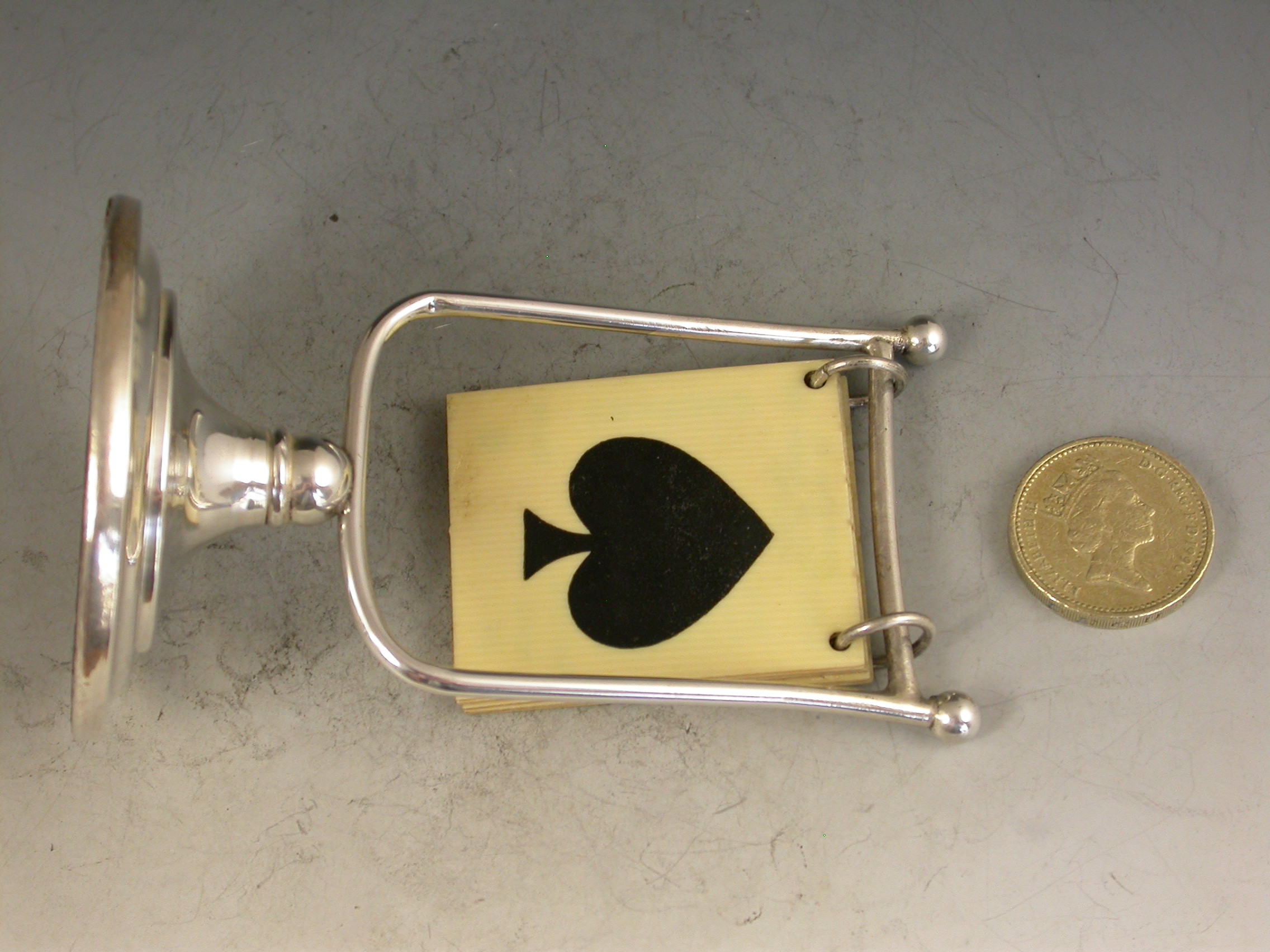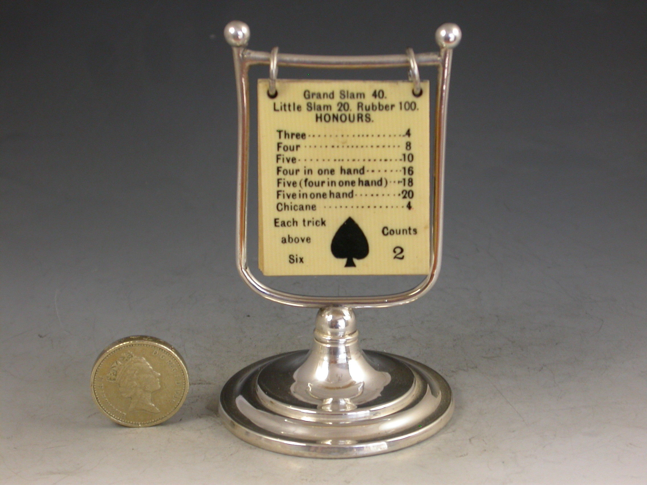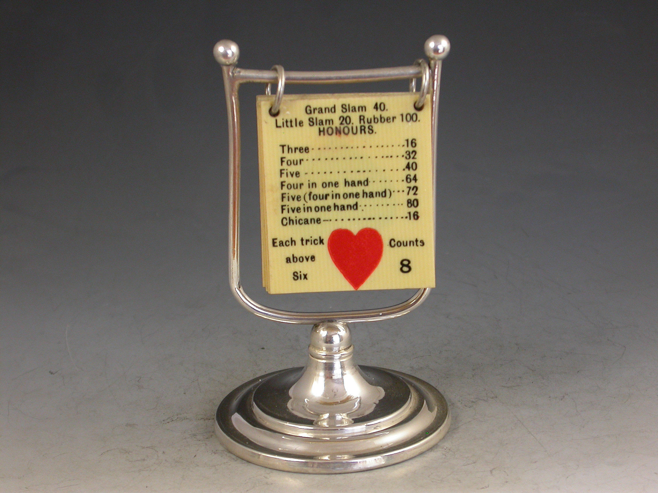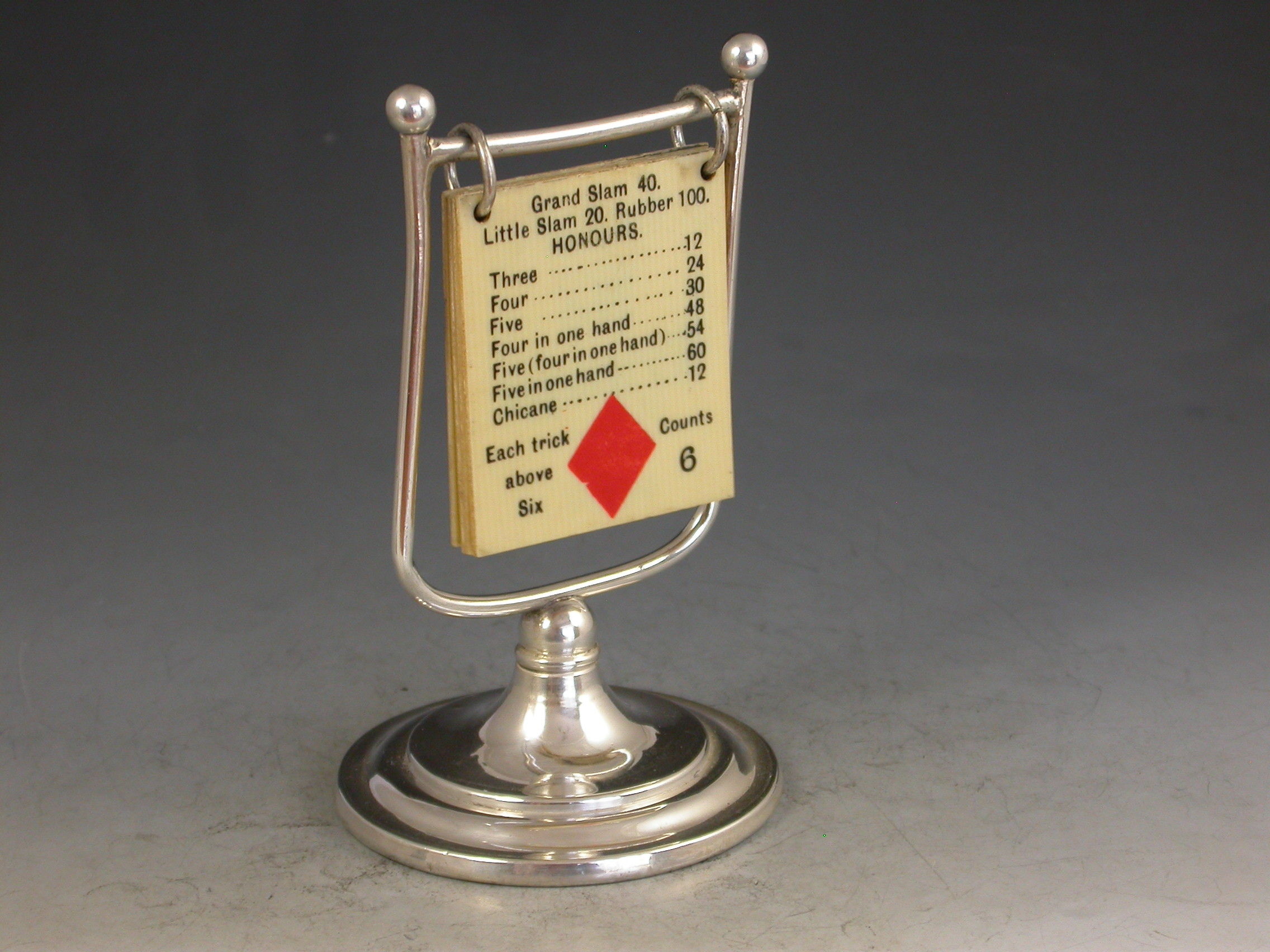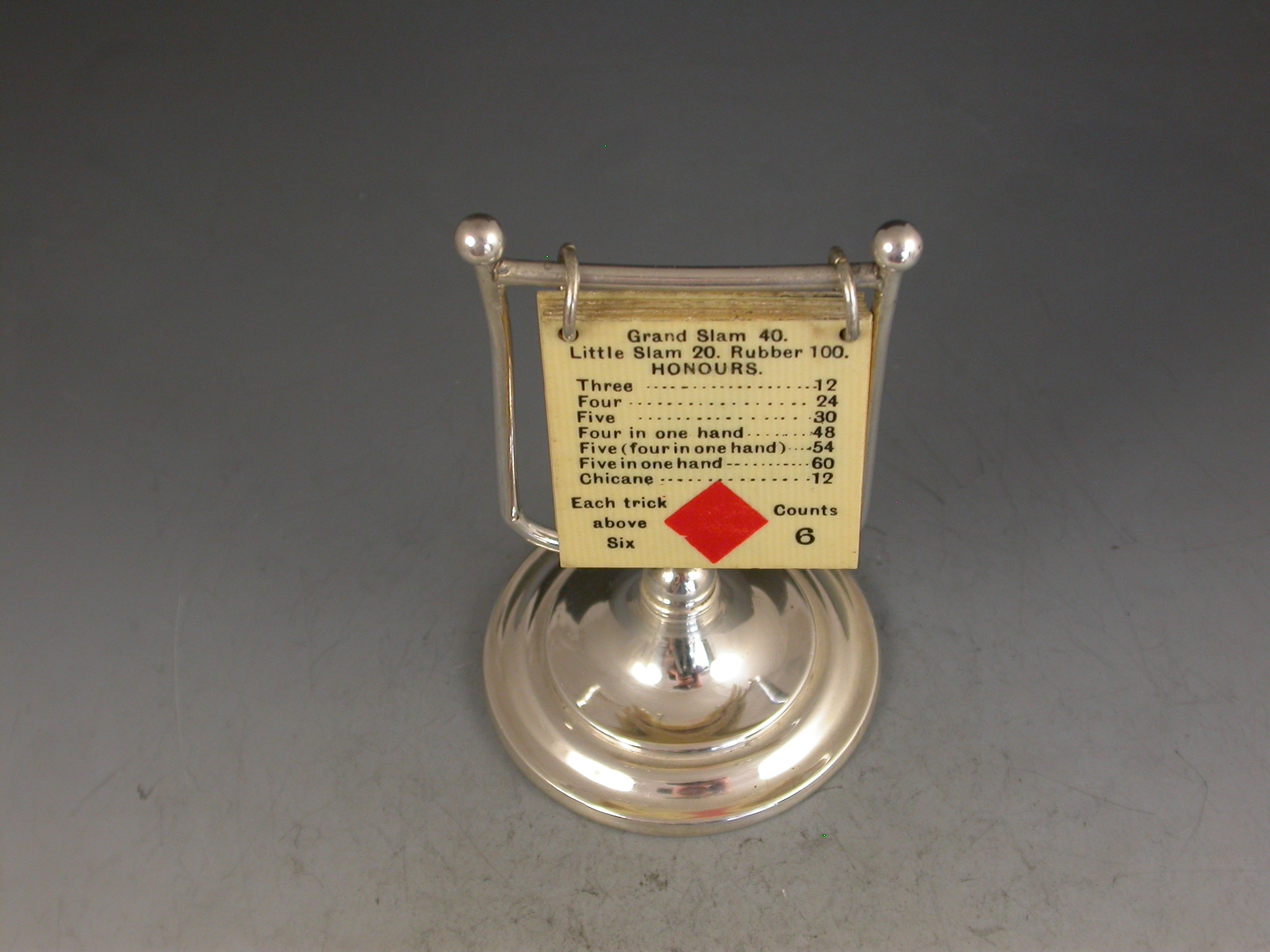A good early 20th century silver Trumps Marker set on a circular pedestal base and of larger than average size, the hanging ivory or celluloid pages painted with the four suits and no trumps, bridge points scoring cards to the reverse.