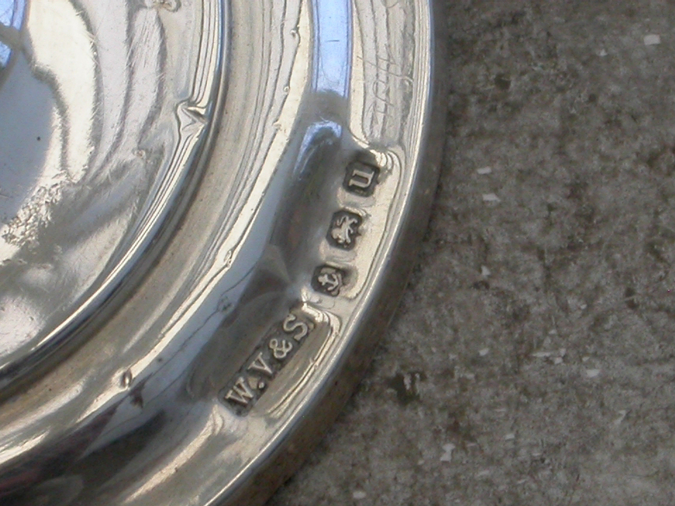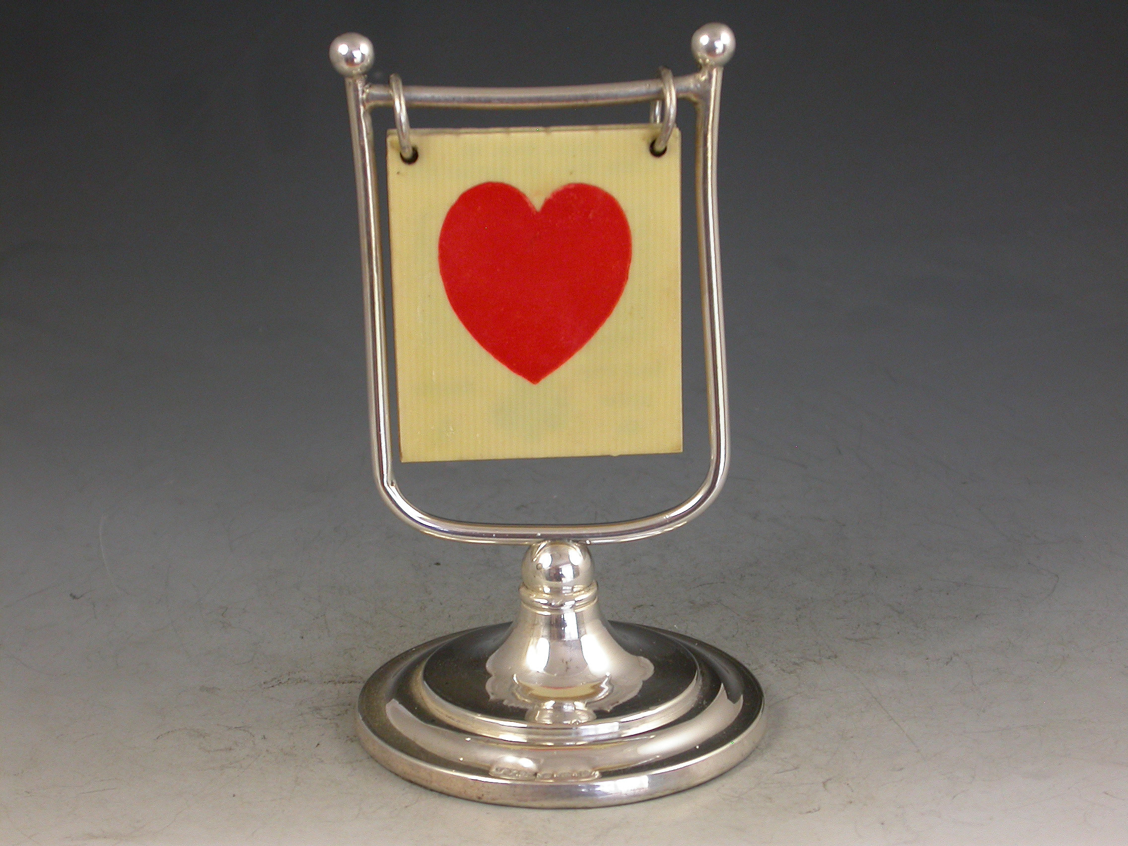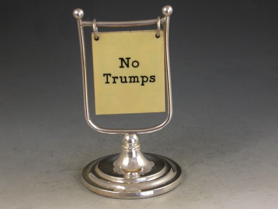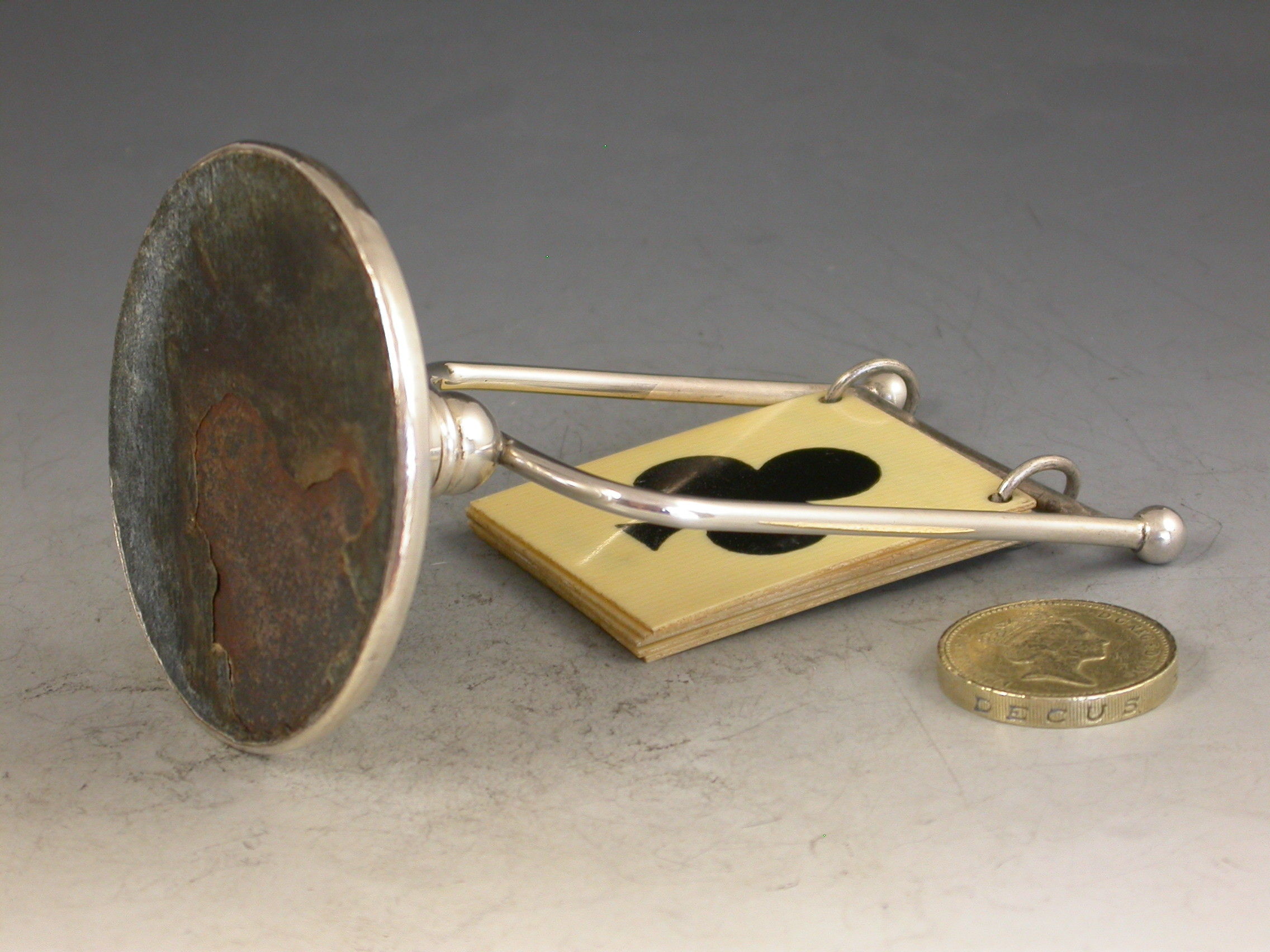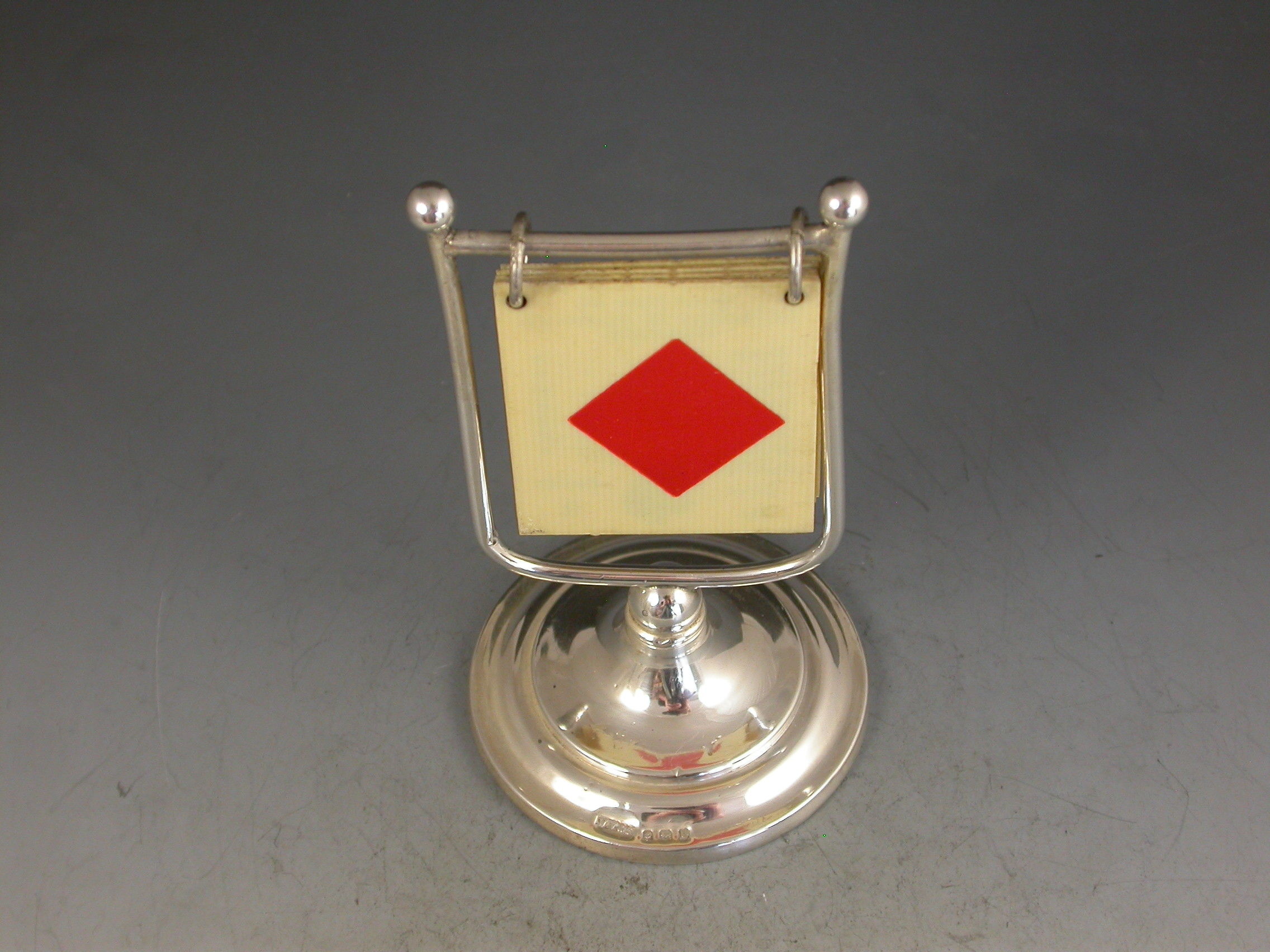 A good early 20th century silver Trumps Marker set on a circular pedestal base and of larger than average size, the hanging ivory or celluloid pages painted with the four suits and no trumps, bridge points scoring cards to the reverse.