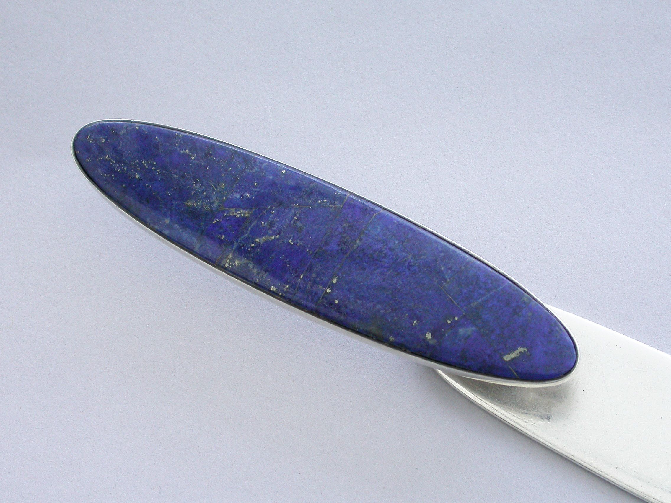 A good heavy quality George V silver Letter Opener in the Art Deco style, with plain tapered blade and raised oval handle set with a large piece of Lapis Lazuli.