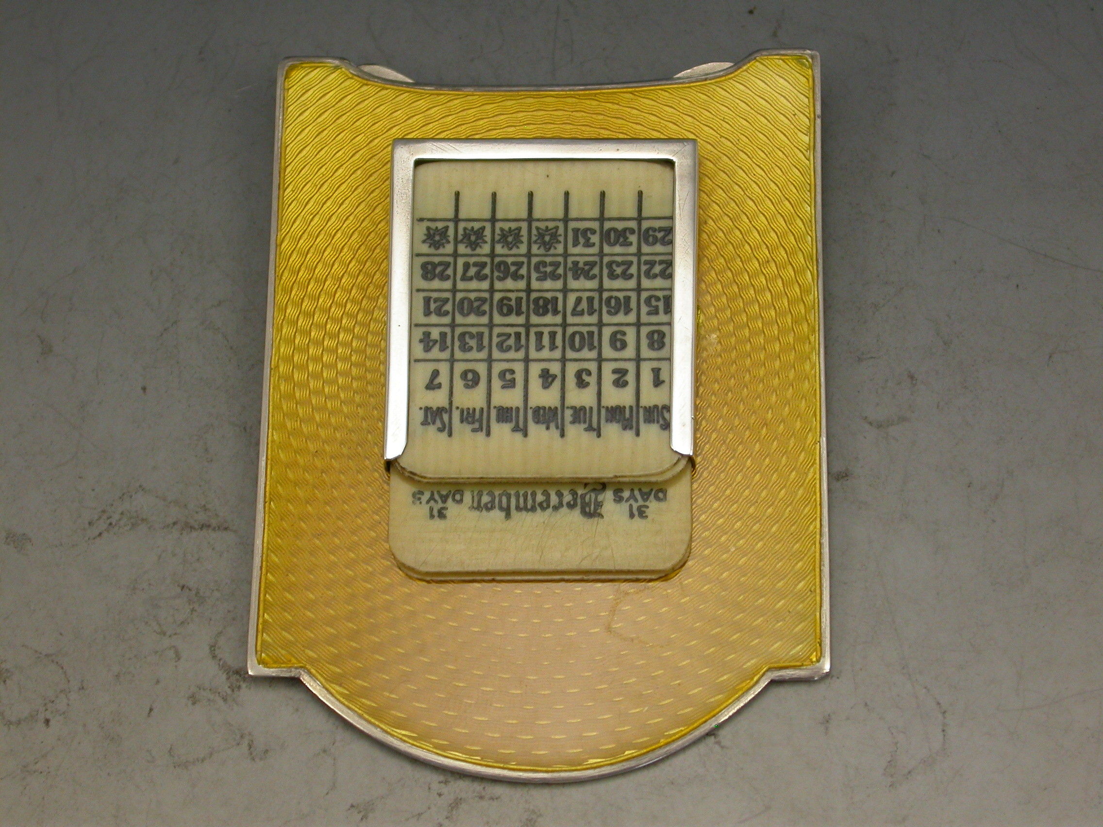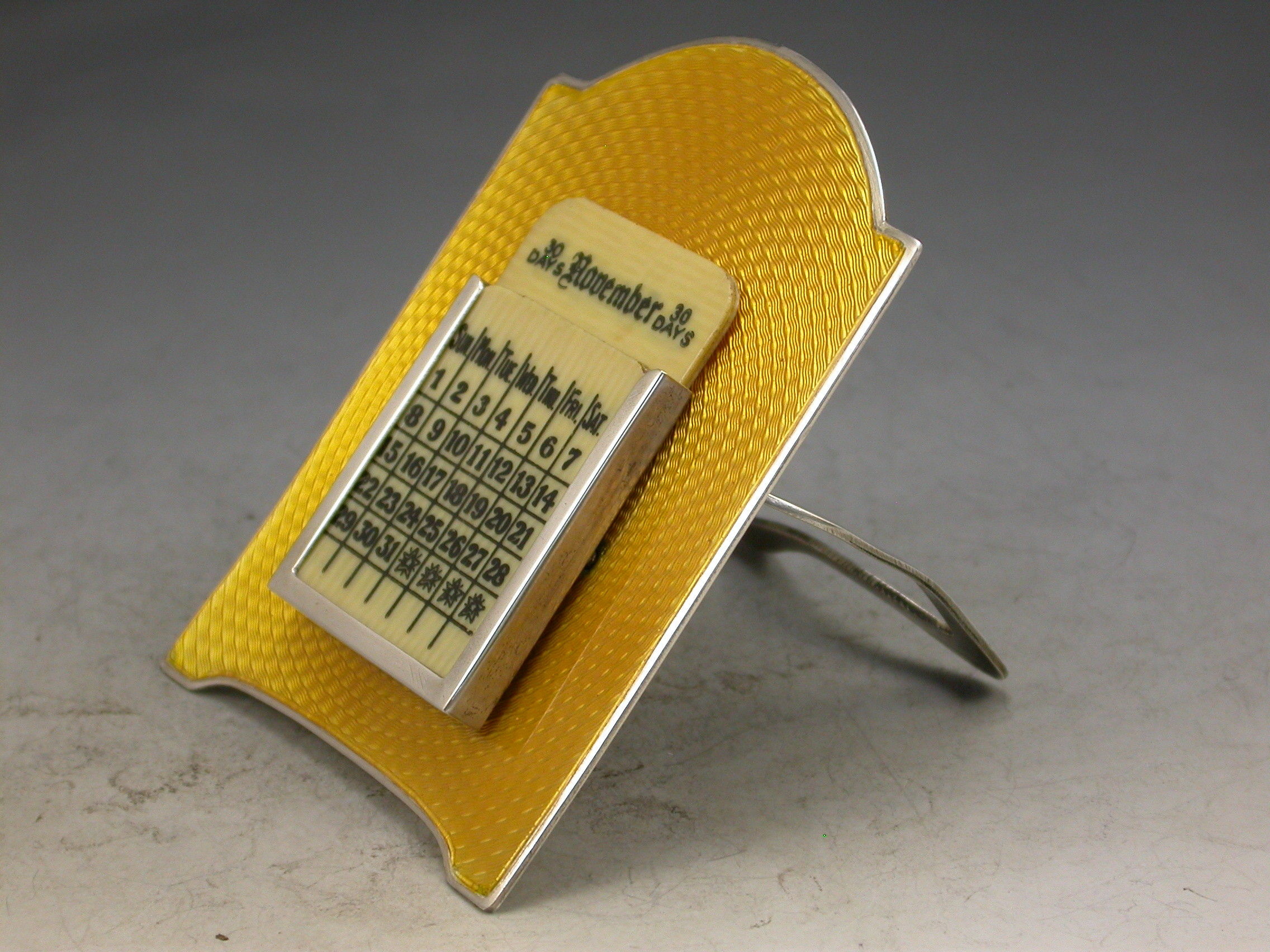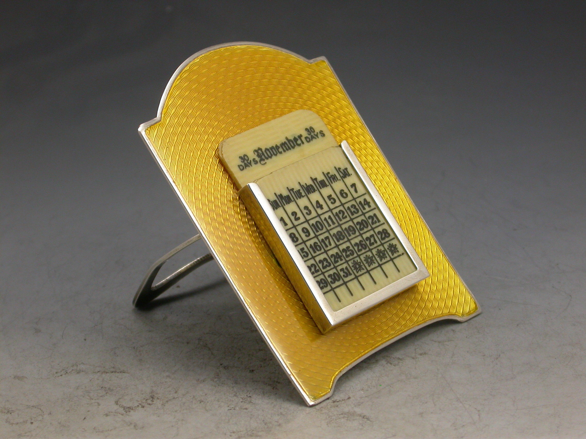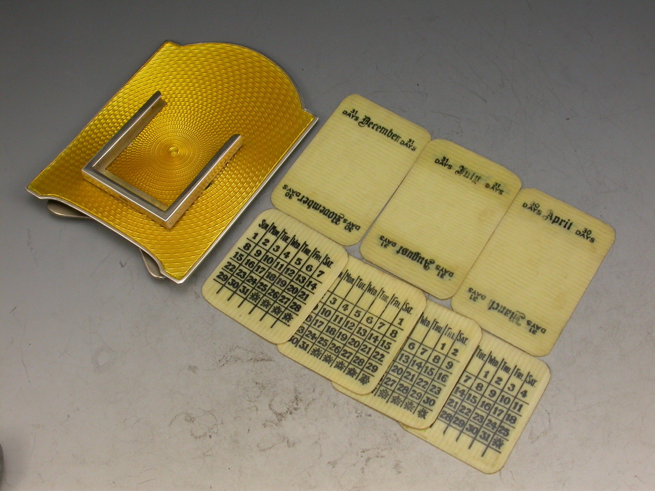 A nice quality George V silver & yellow guilloche enamel Perpetual Calender of easel form with hinged stand, a silver pocket applied to the face holding seven celluloid leaves printed with the months and days.