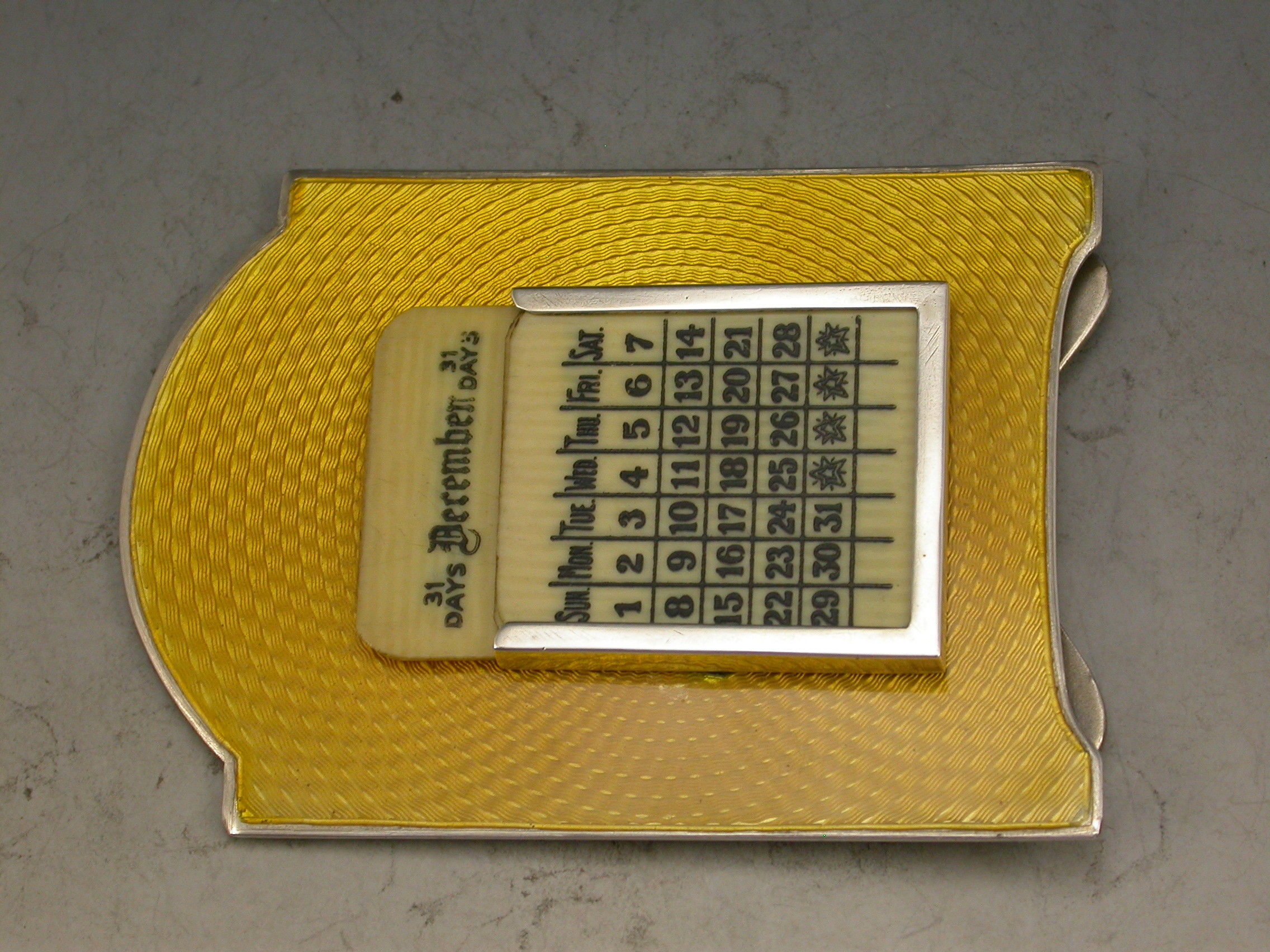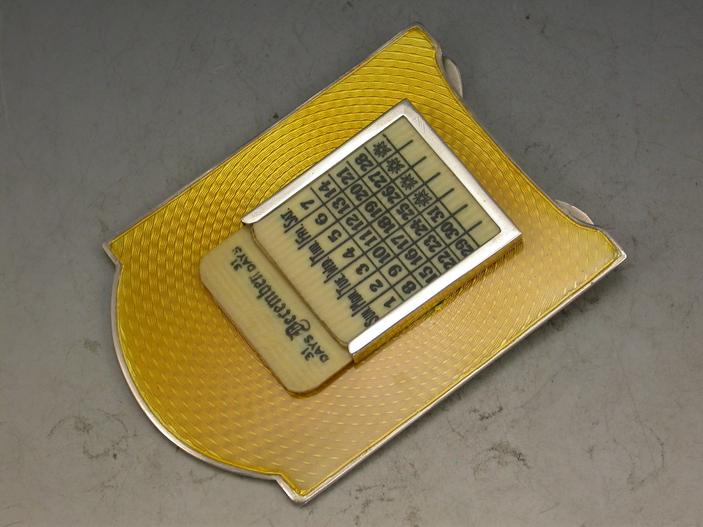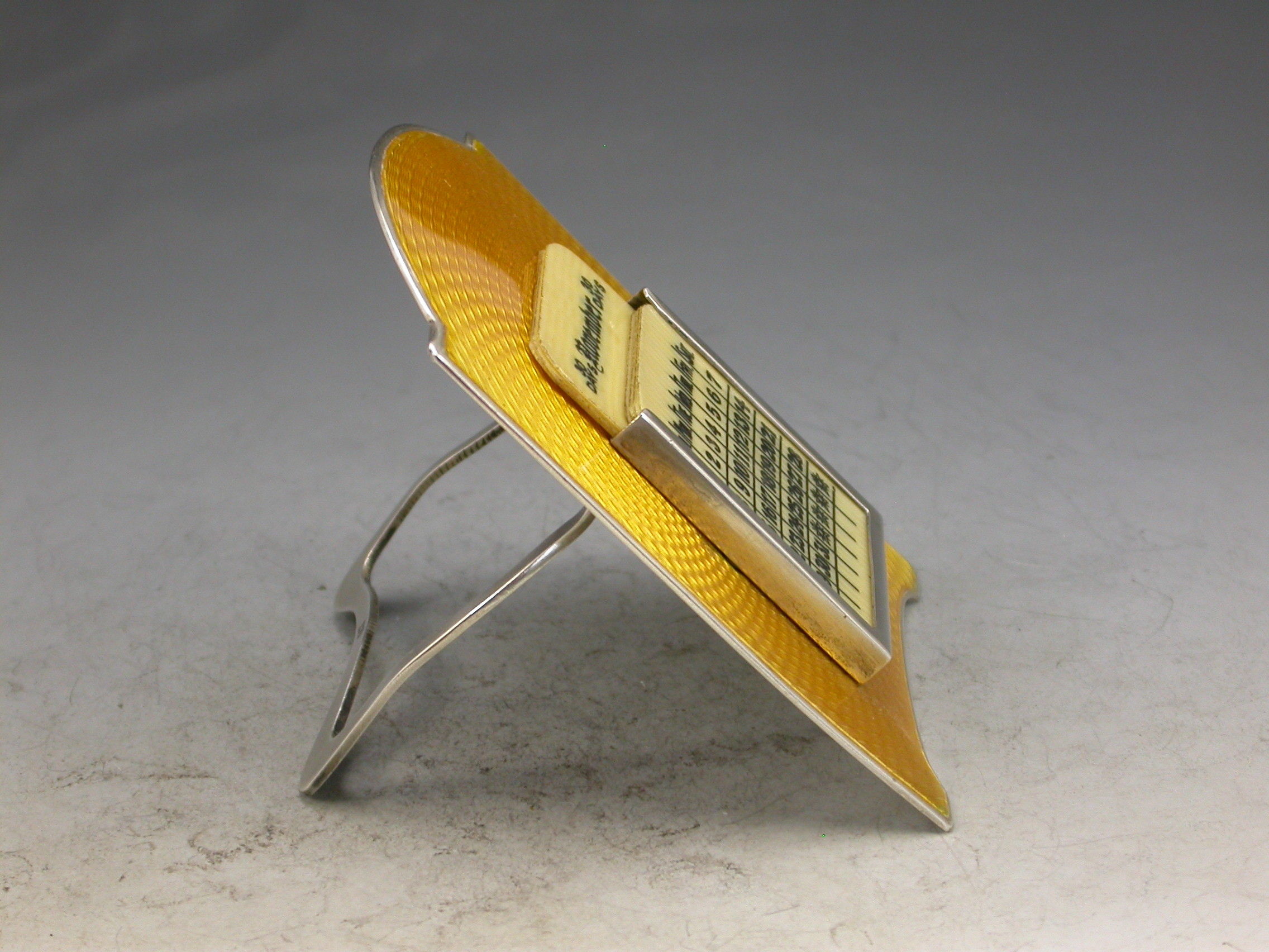 A nice quality George V silver & yellow guilloche enamel Perpetual Calender of easel form with hinged stand, a silver pocket applied to the face holding seven celluloid leaves printed with the months and days.