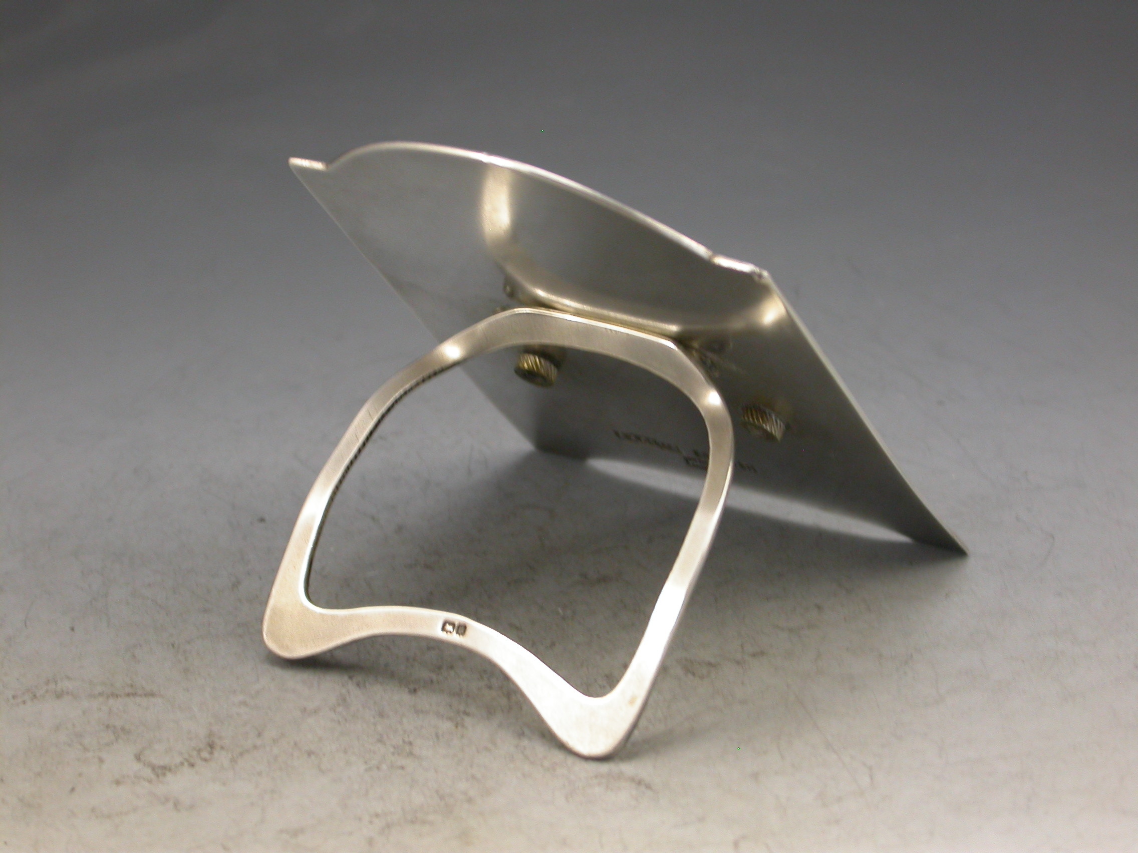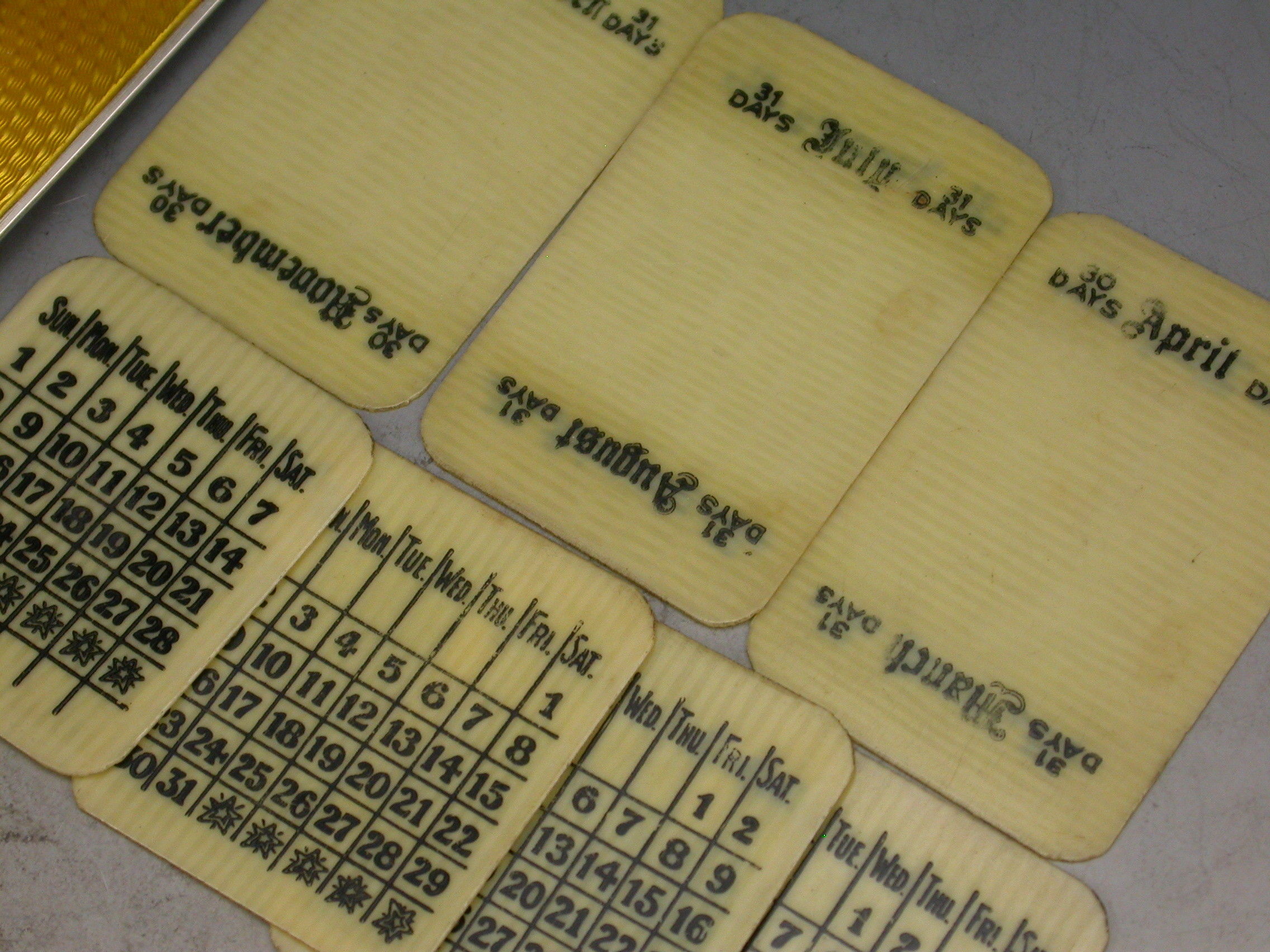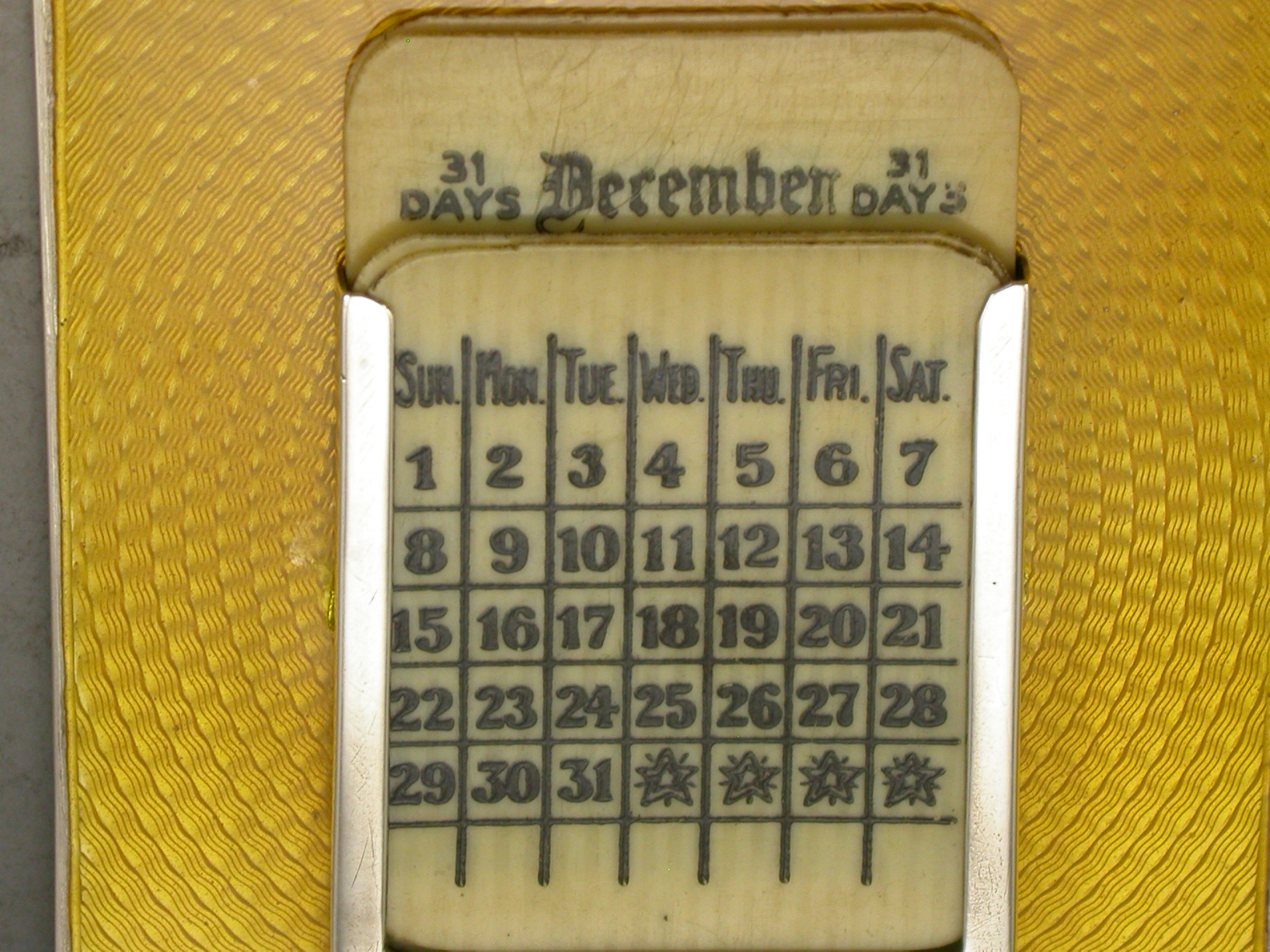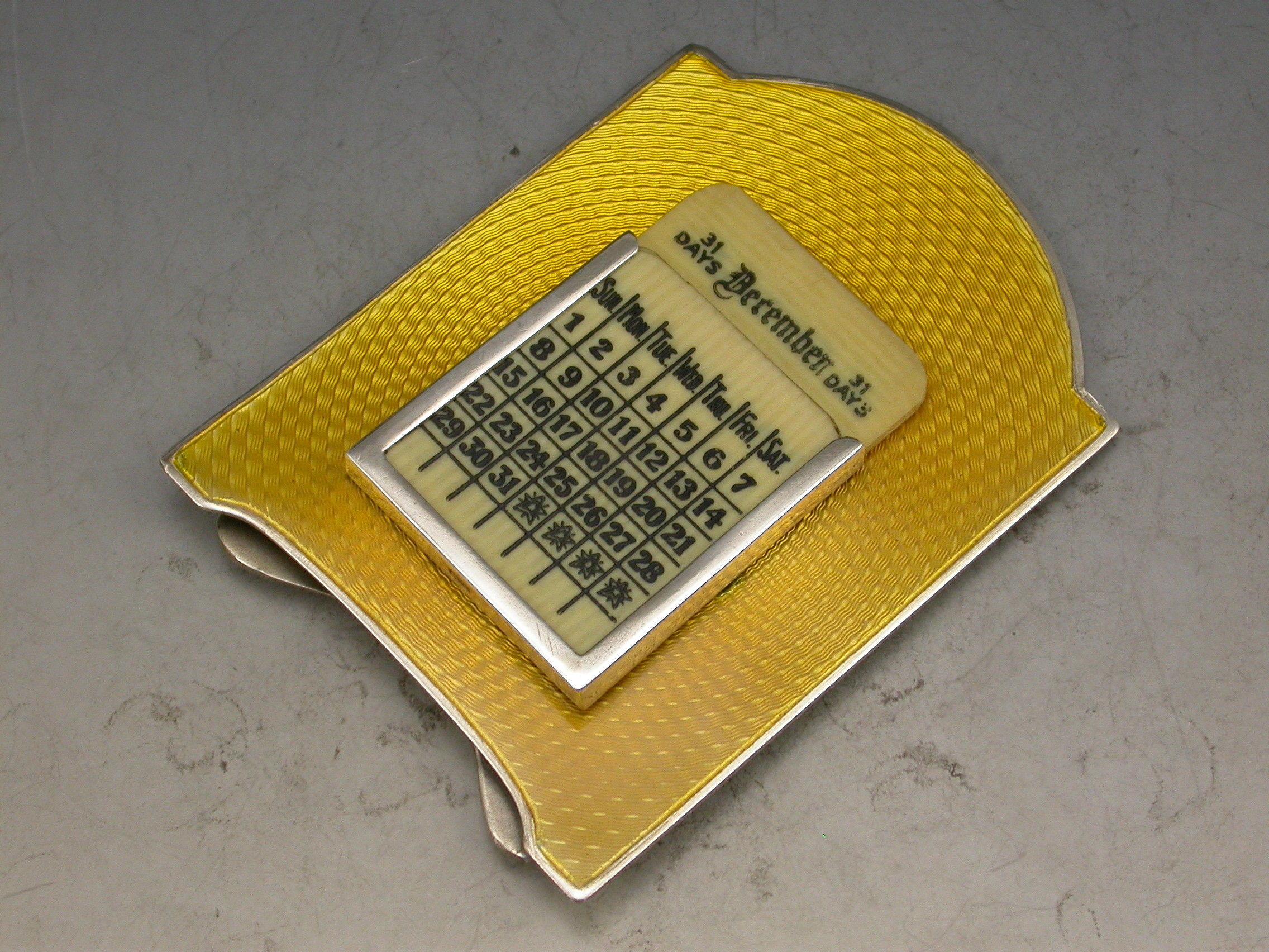 A nice quality George V silver & yellow guilloche enamel Perpetual Calender of easel form with hinged stand, a silver pocket applied to the face holding seven celluloid leaves printed with the months and days.