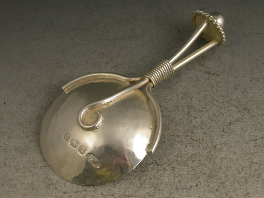 An early 20th century Arts & Crafts style Caddy Spoon with hammered circular bowl and tri-furcated handle supporting a disc surmounted by a ball.