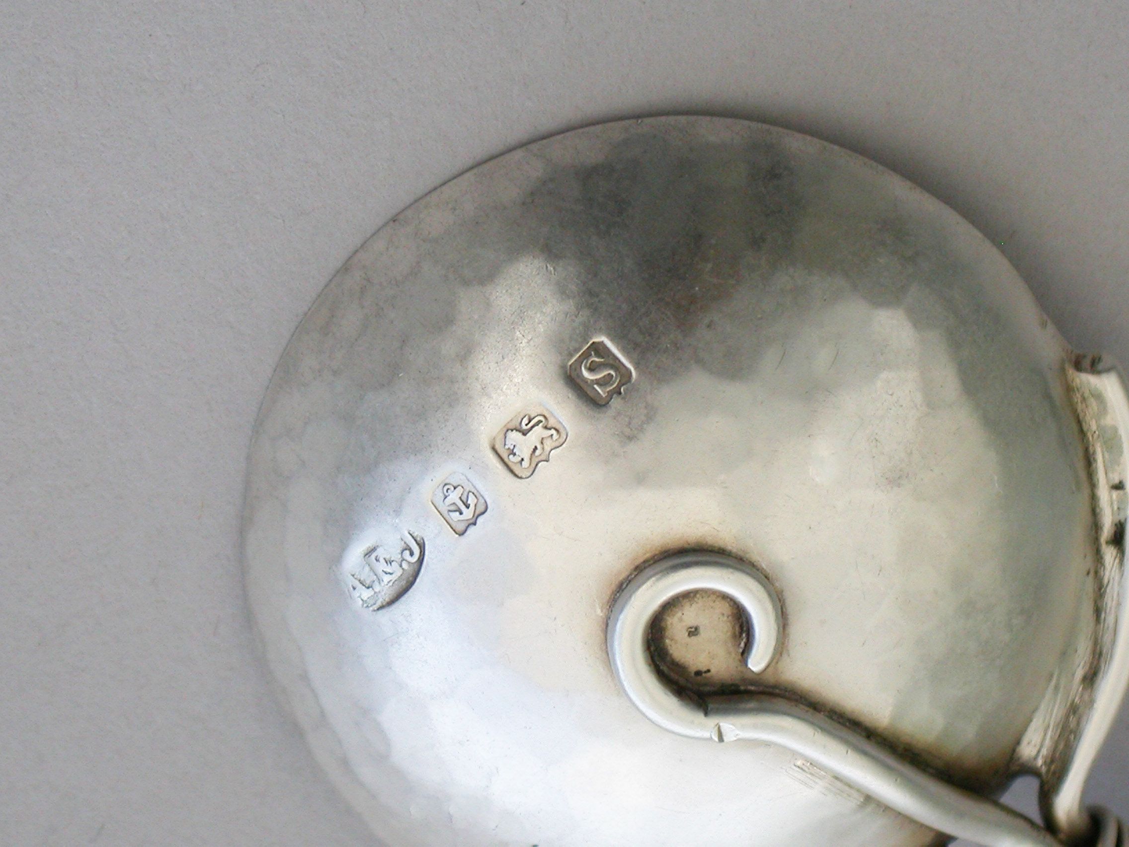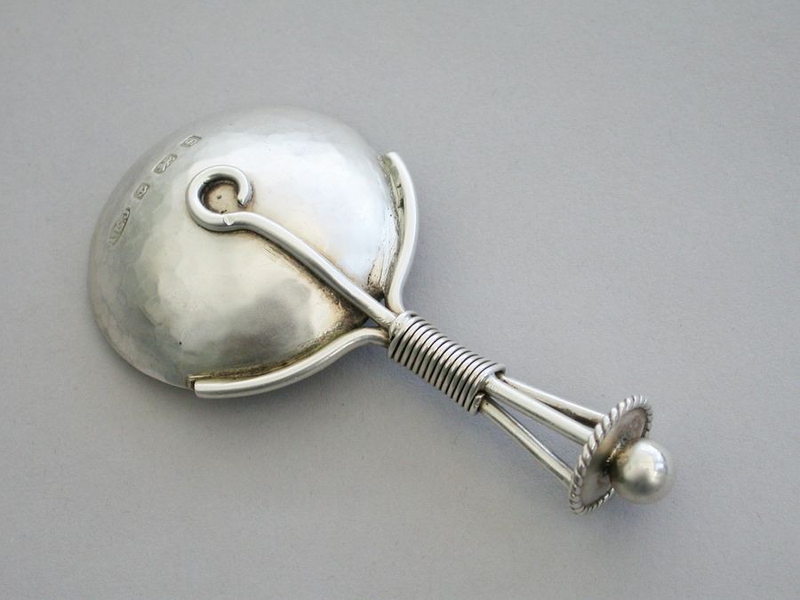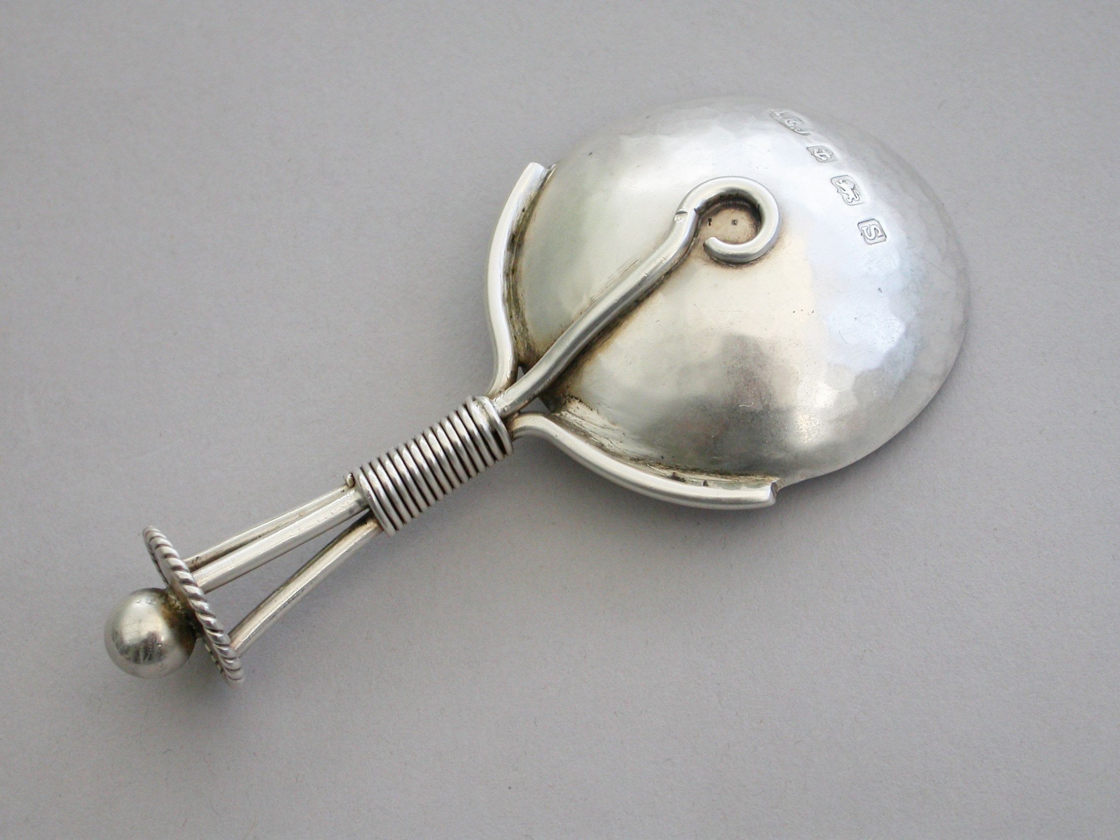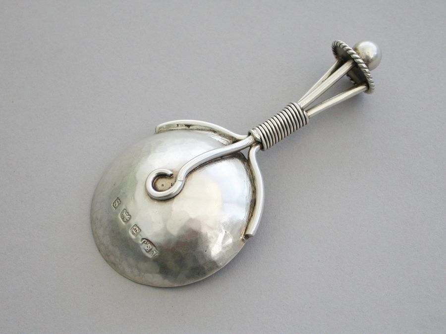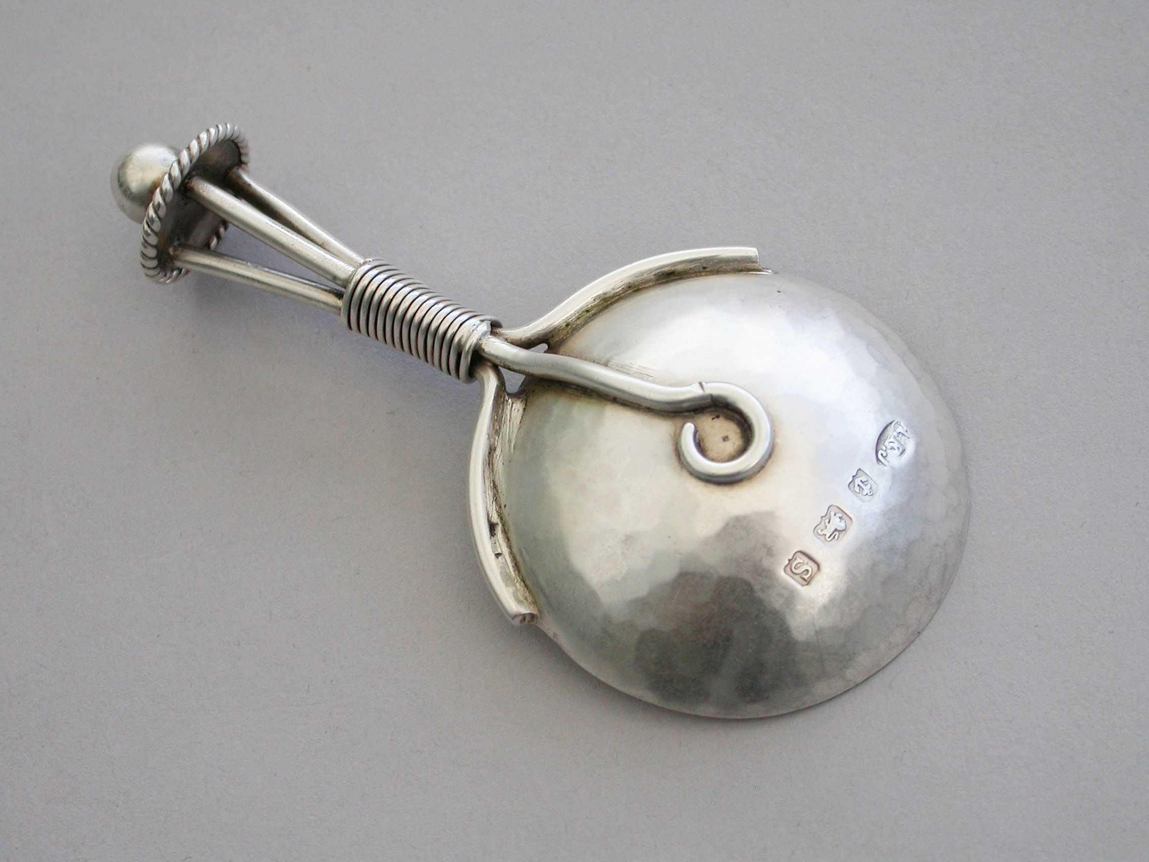 An early 20th century Arts & Crafts style silver Caddy Spoon with hammered circular bowl and trifurcated handle supporting a disc surmounted by a ball.