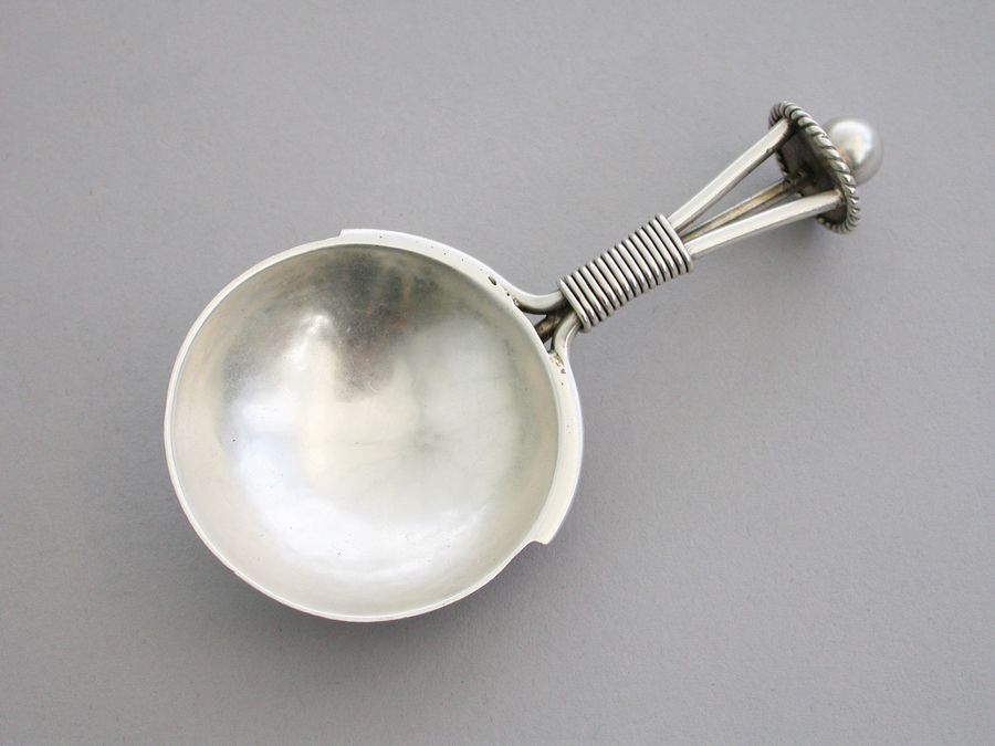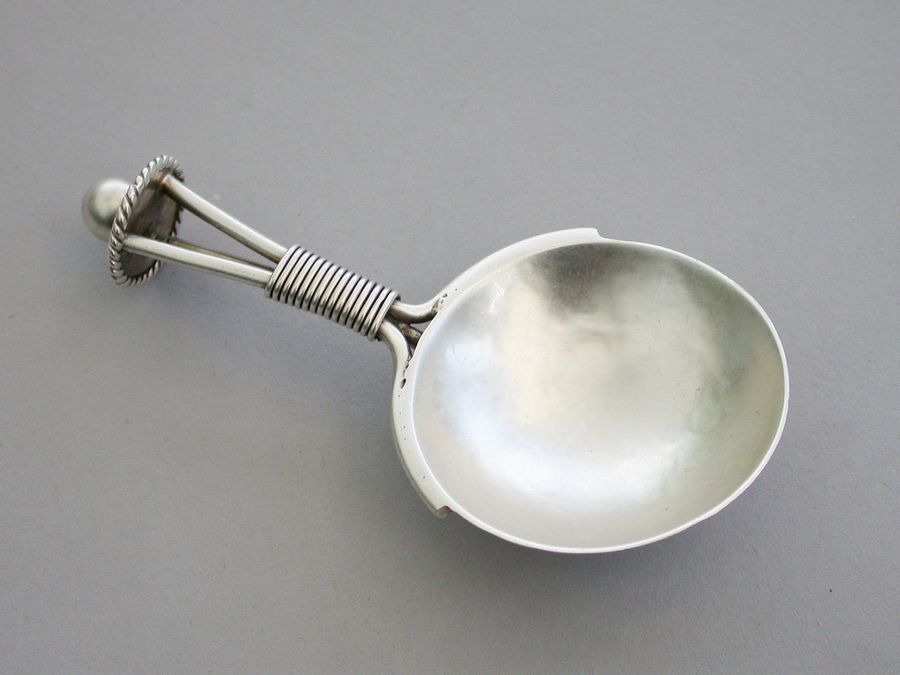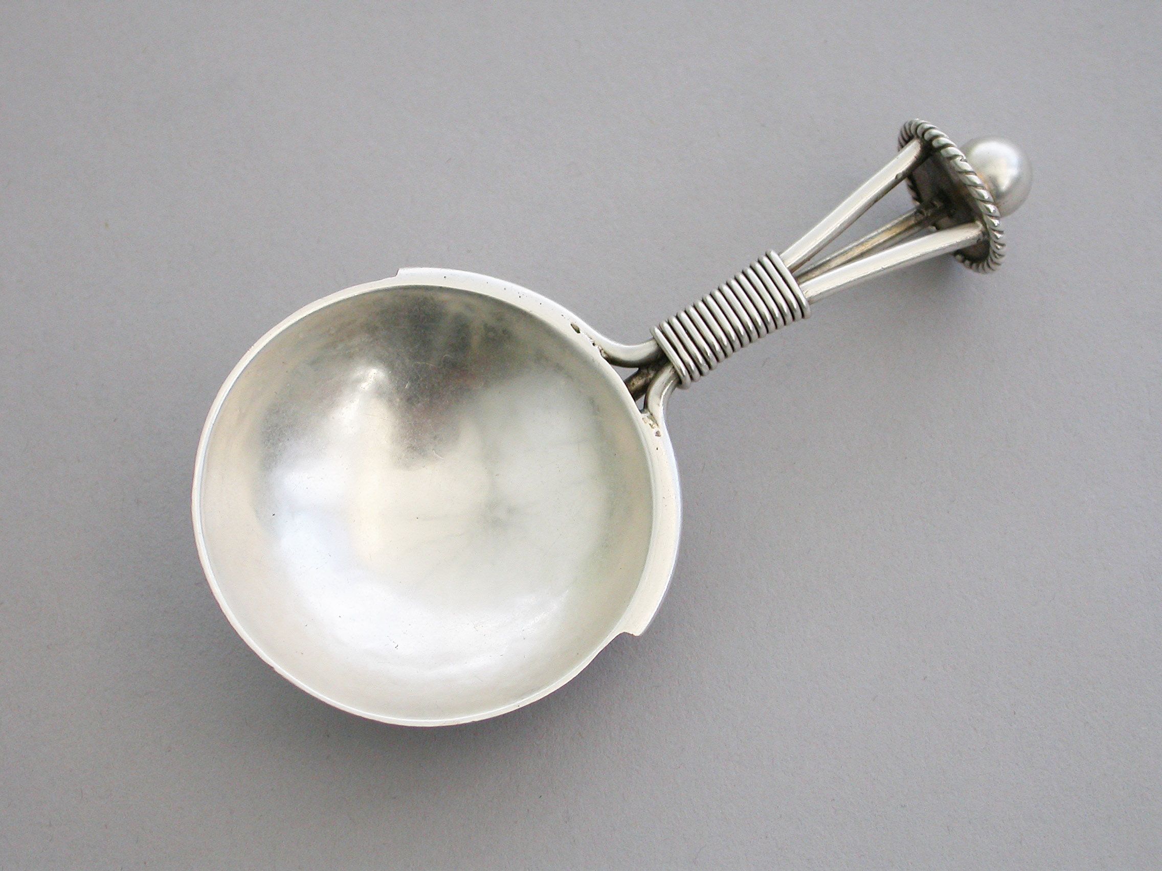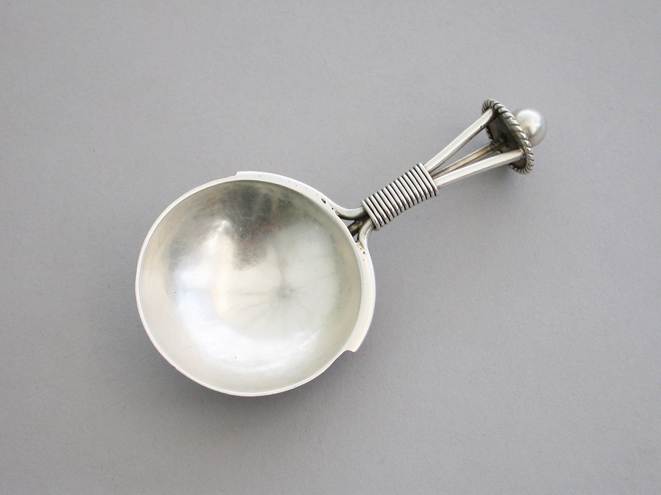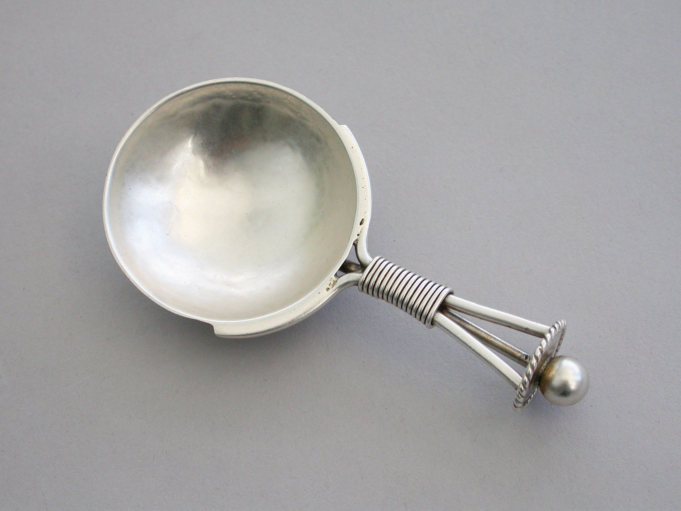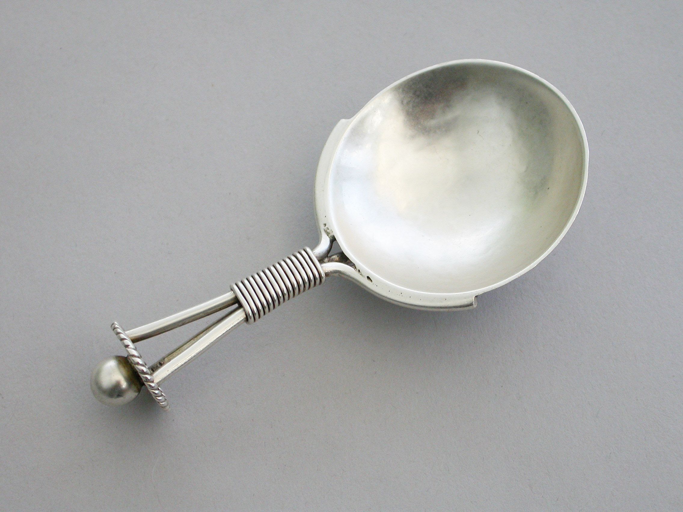 An early 20th century Arts & Crafts style silver Caddy Spoon with hammered circular bowl and trifurcated handle supporting a disc surmounted by a ball.