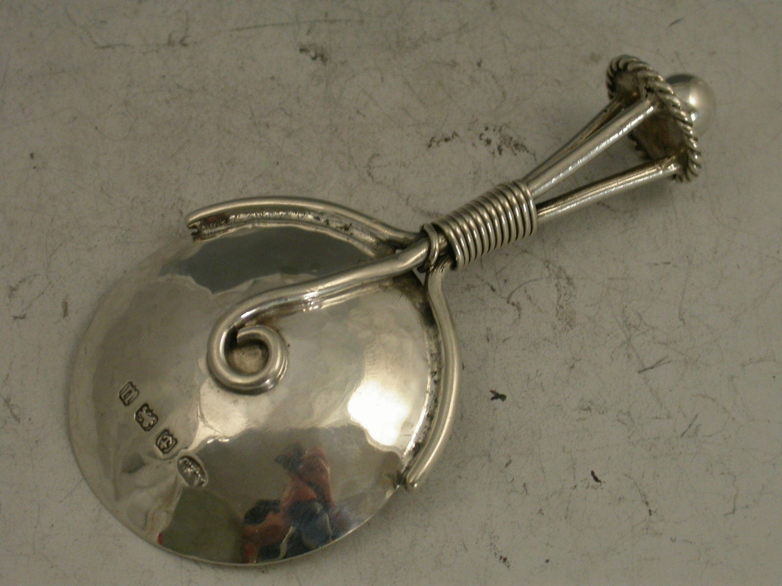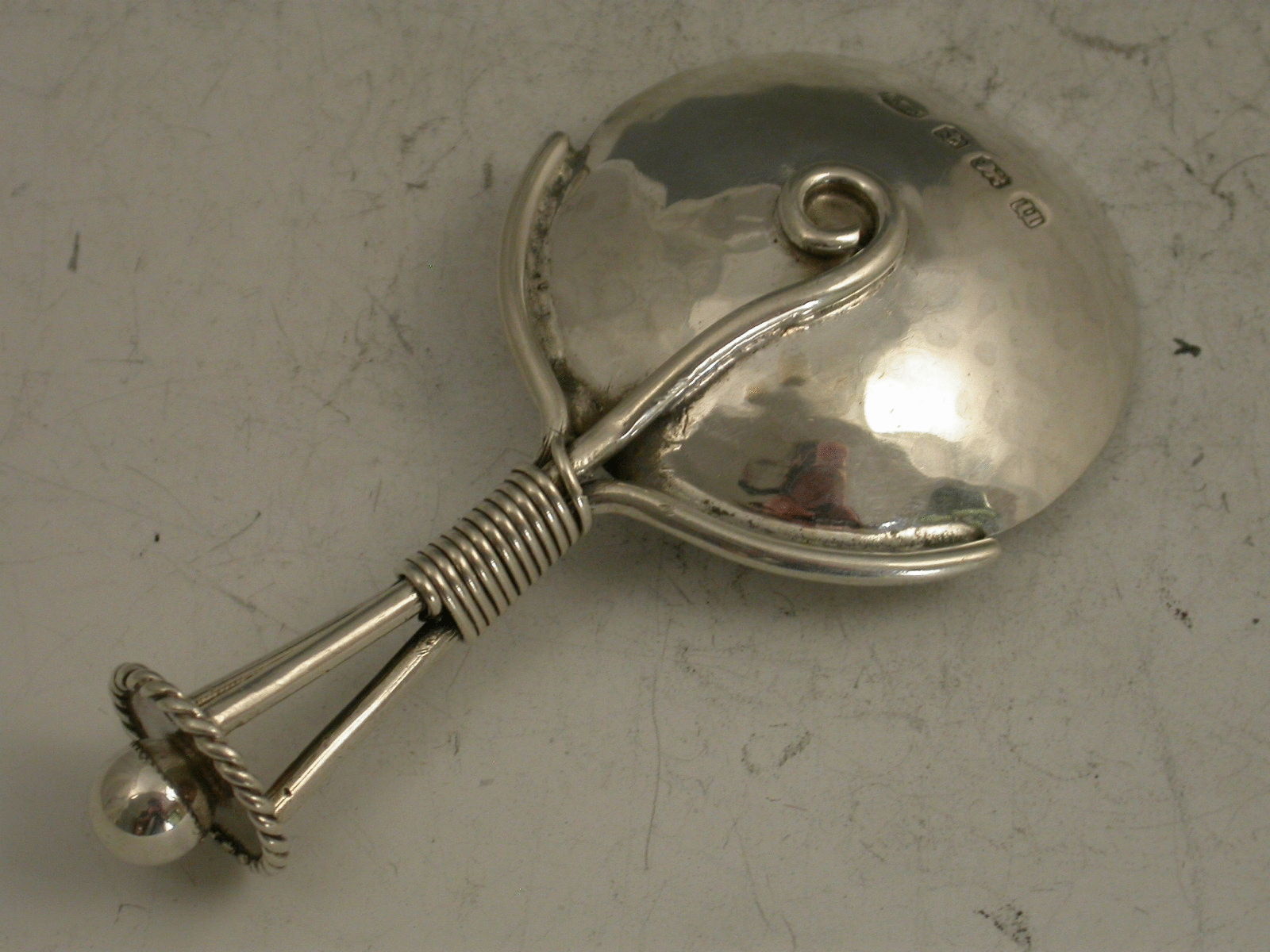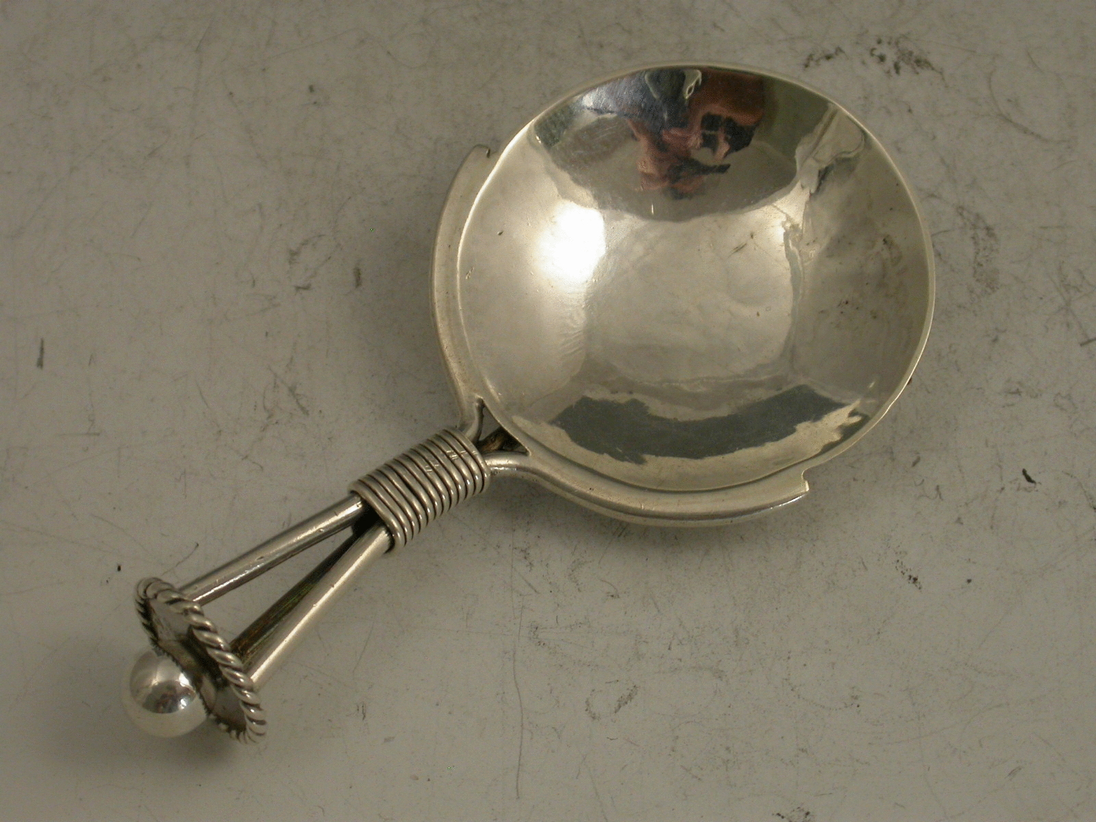 An early 20th century Arts & Crafts style Caddy Spoon with hammered circular bowl and tri-furcated handle supporting a disc surmounted by a ball.