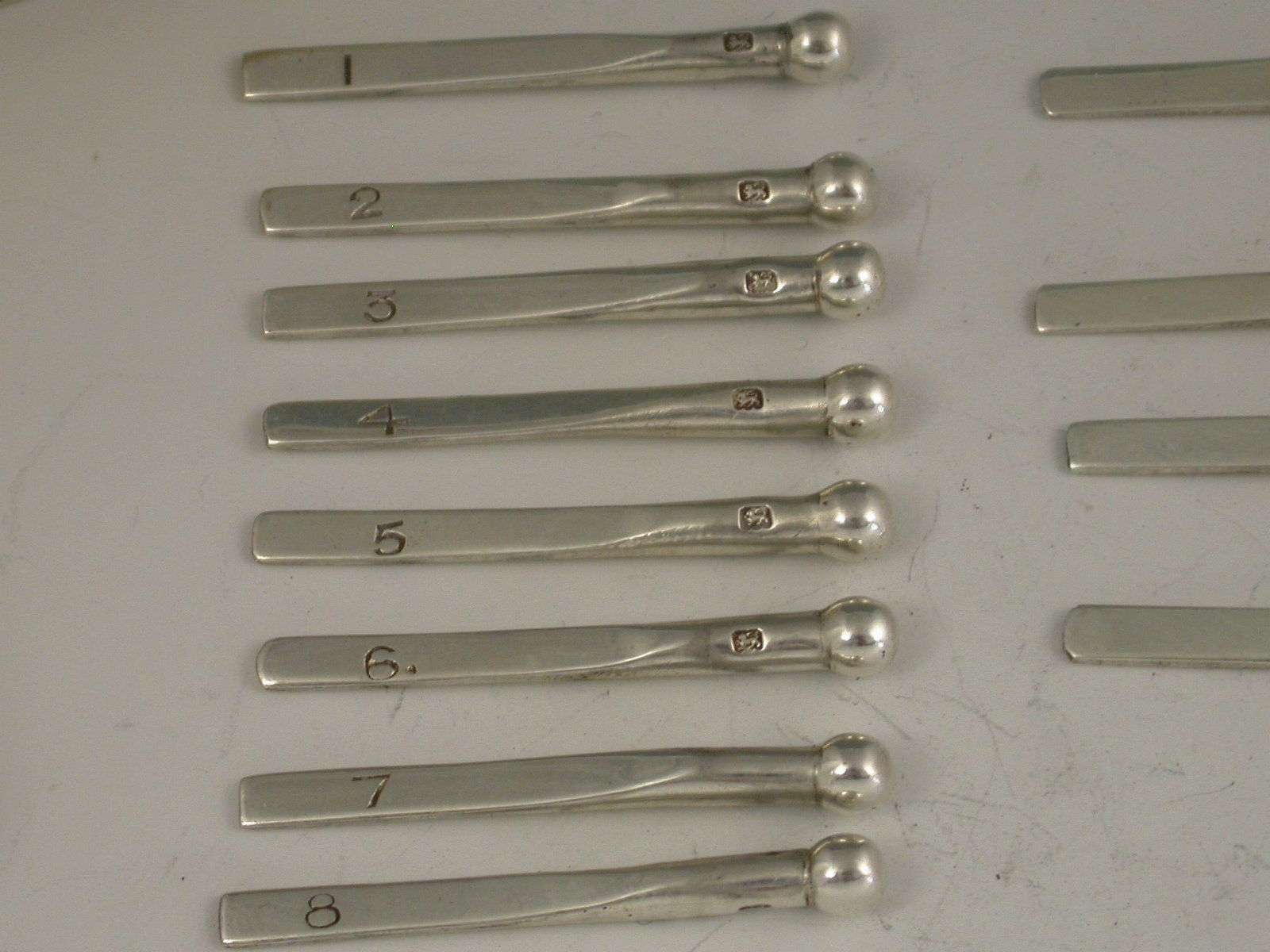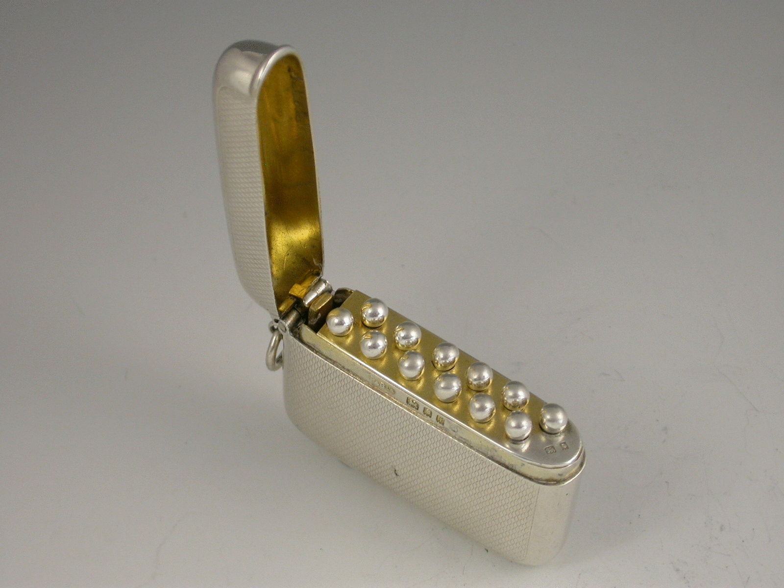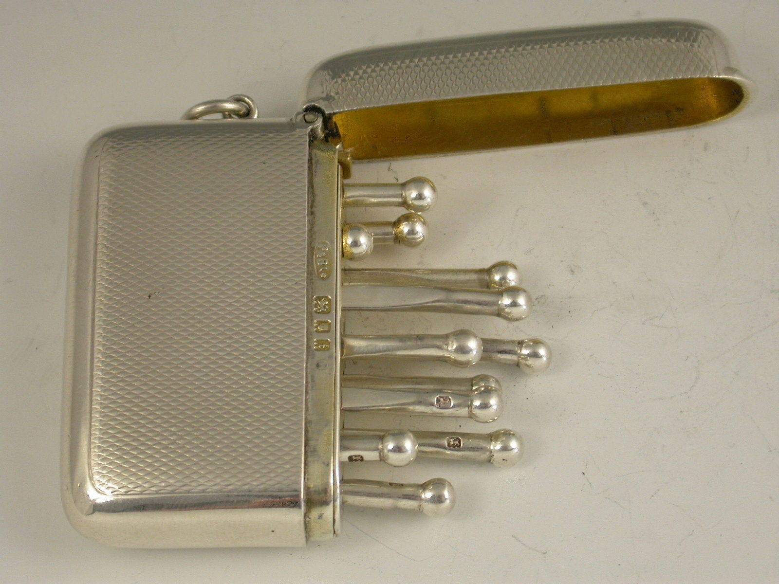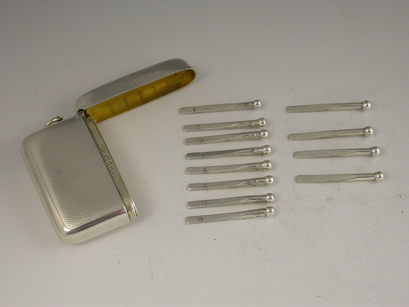 A good quality George V silver Butt Marker of rounded rectangular form and hinged flip top lid, engine turned decoration to the body, silver gilt interior fitted with twelve pegs with ball finials, numbered to eight with four spares.