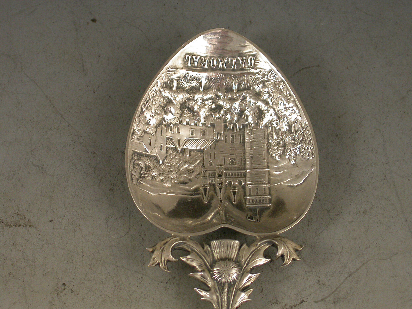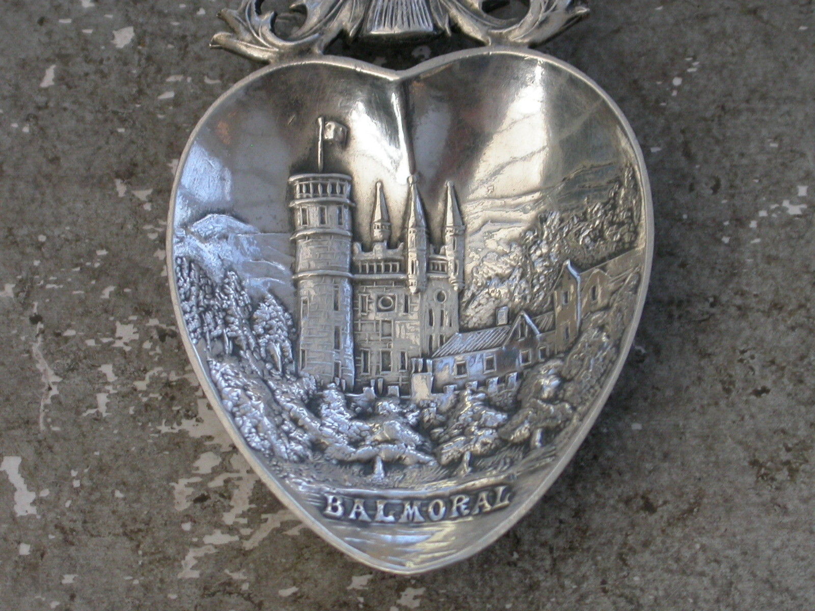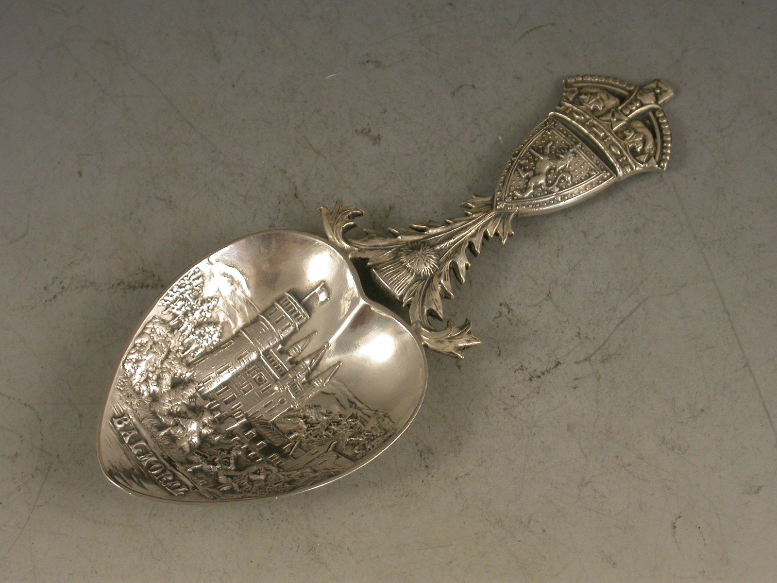 A rare early 20th century Scottish Provincial silver Caddy Spoon, the heart shaped bowl with chased and embossed view of BALMORAL CASTLE (the Royal Family’s Scottish home), the cast handle formed from the Scottish Thistle, the Lion rampant and the Union Crown.