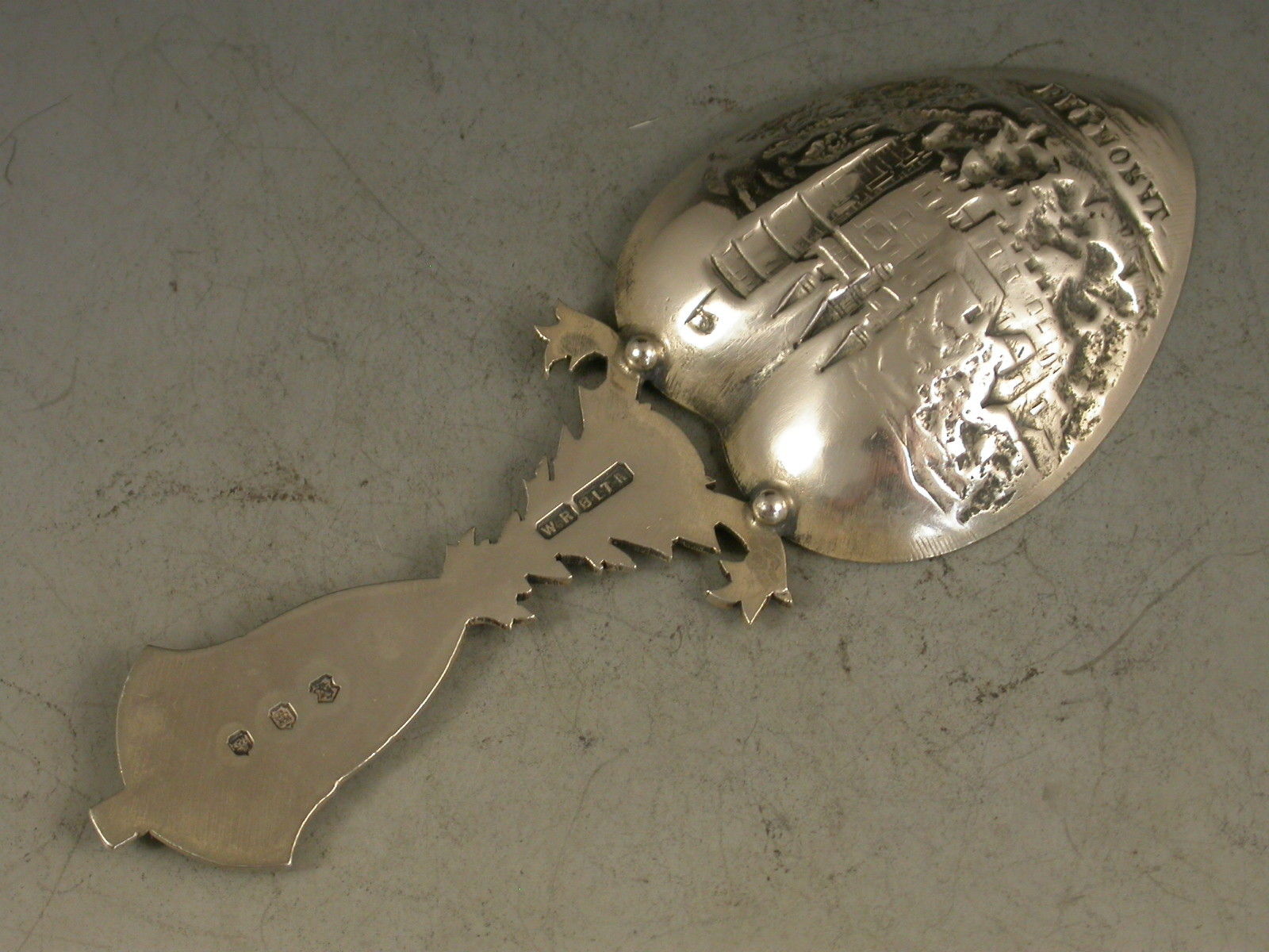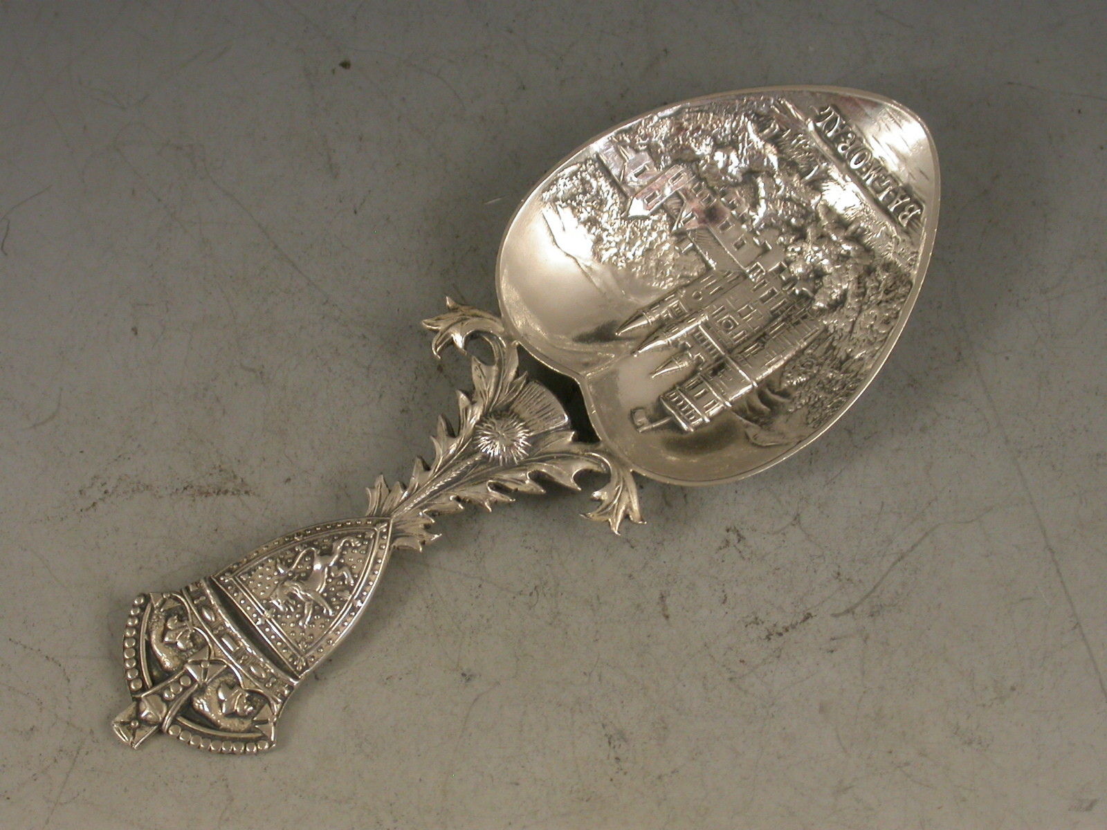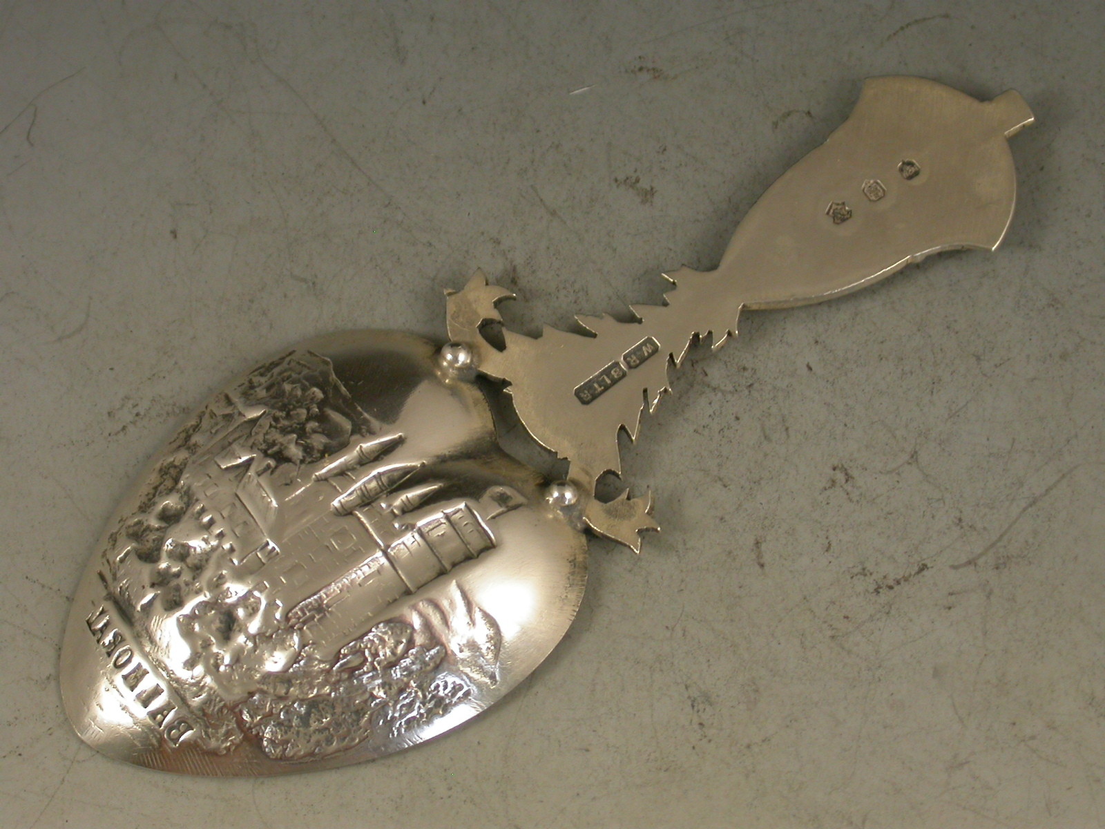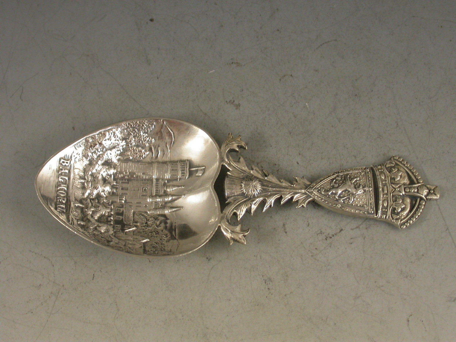 A rare early 20th century Scottish Provincial silver Caddy Spoon, the heart shaped bowl with chased and embossed view of BALMORAL CASTLE (the Royal Family’s Scottish home), the cast handle formed from the Scottish Thistle, the Lion rampant and the Union Crown.