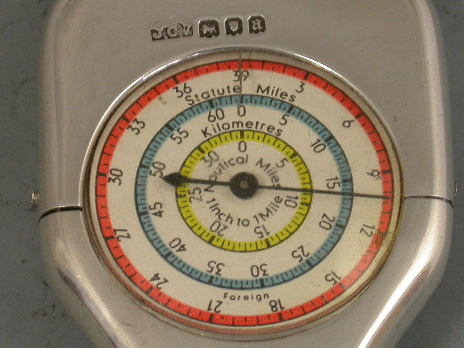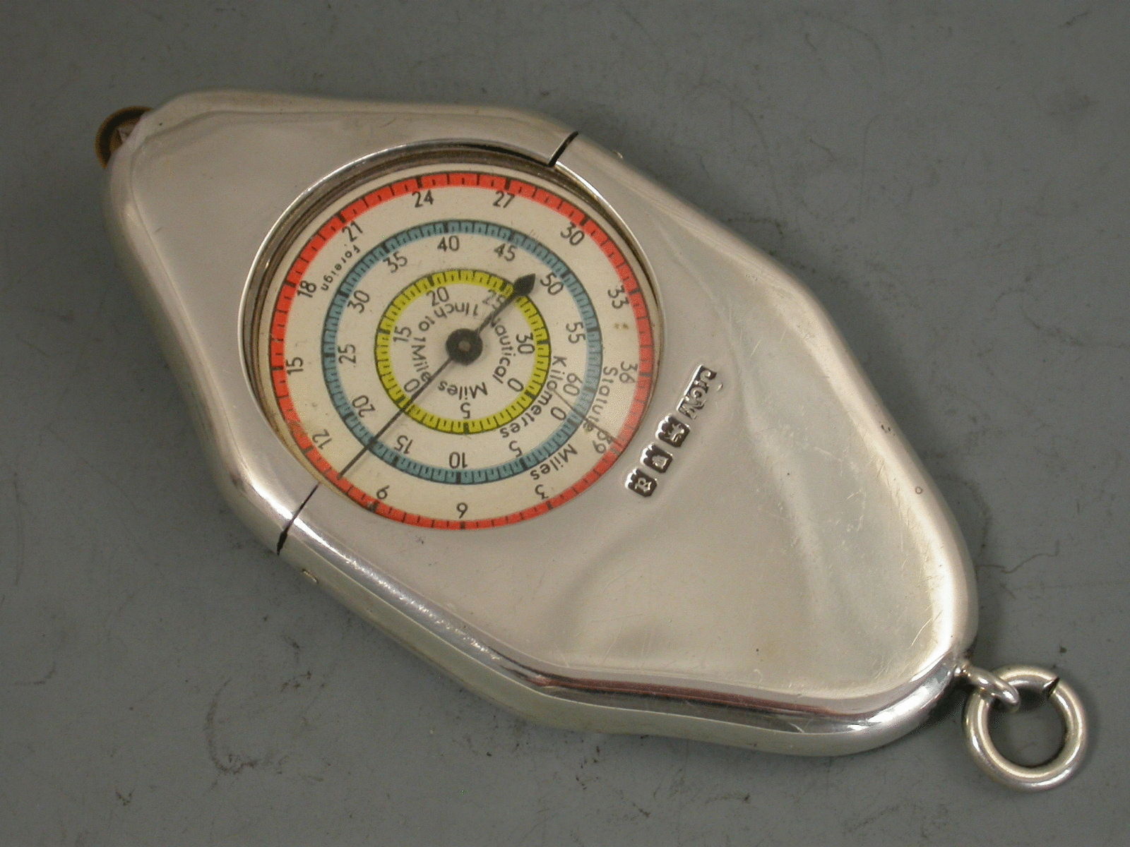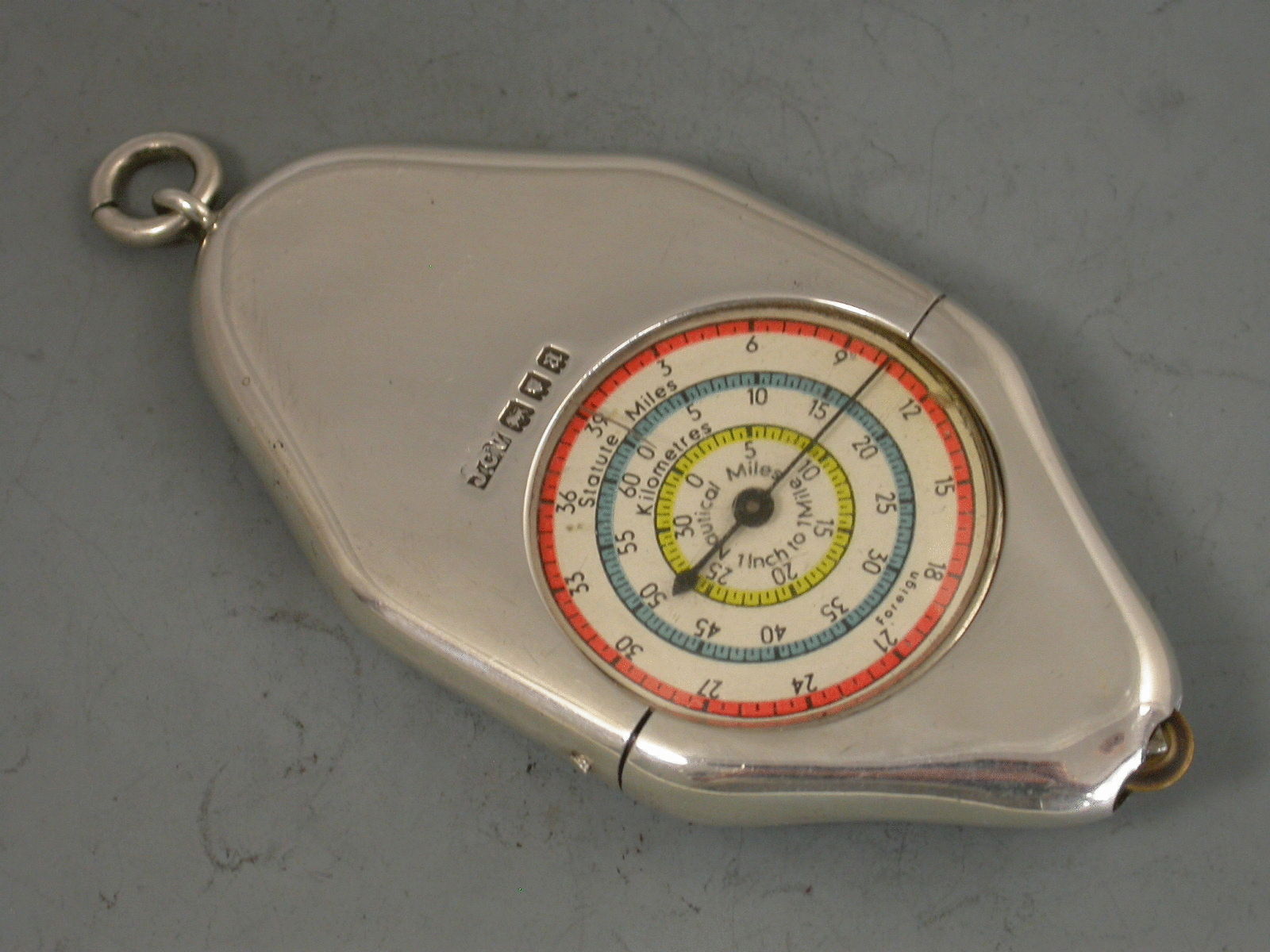 A rare George V silver combined Map Measuring Tool and Compass with a dial on either side, attached suspension ring.