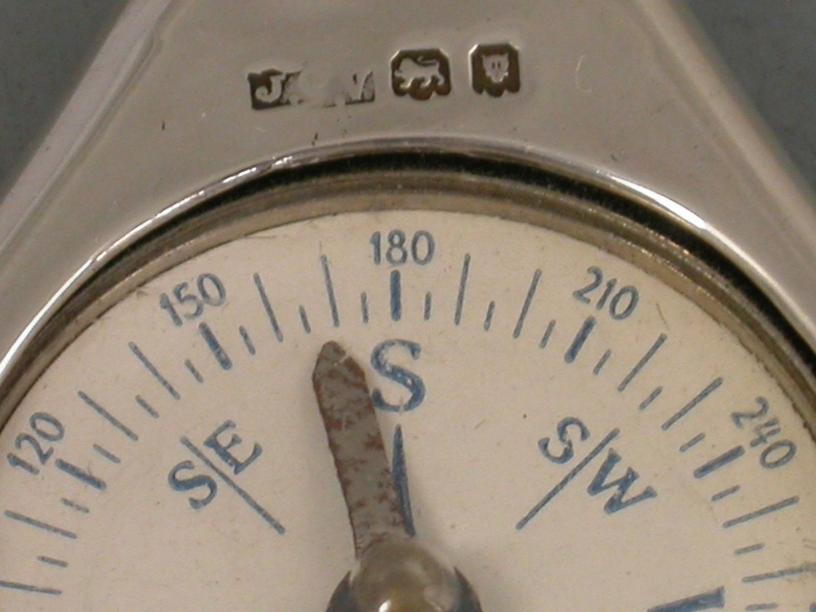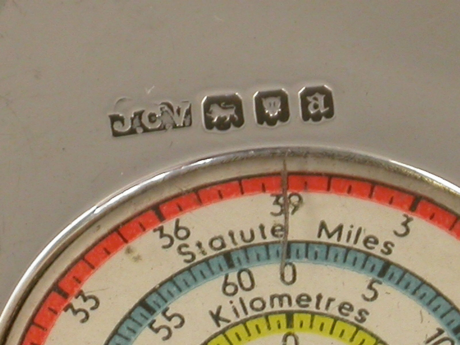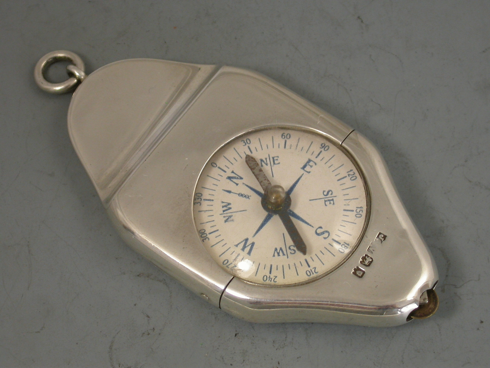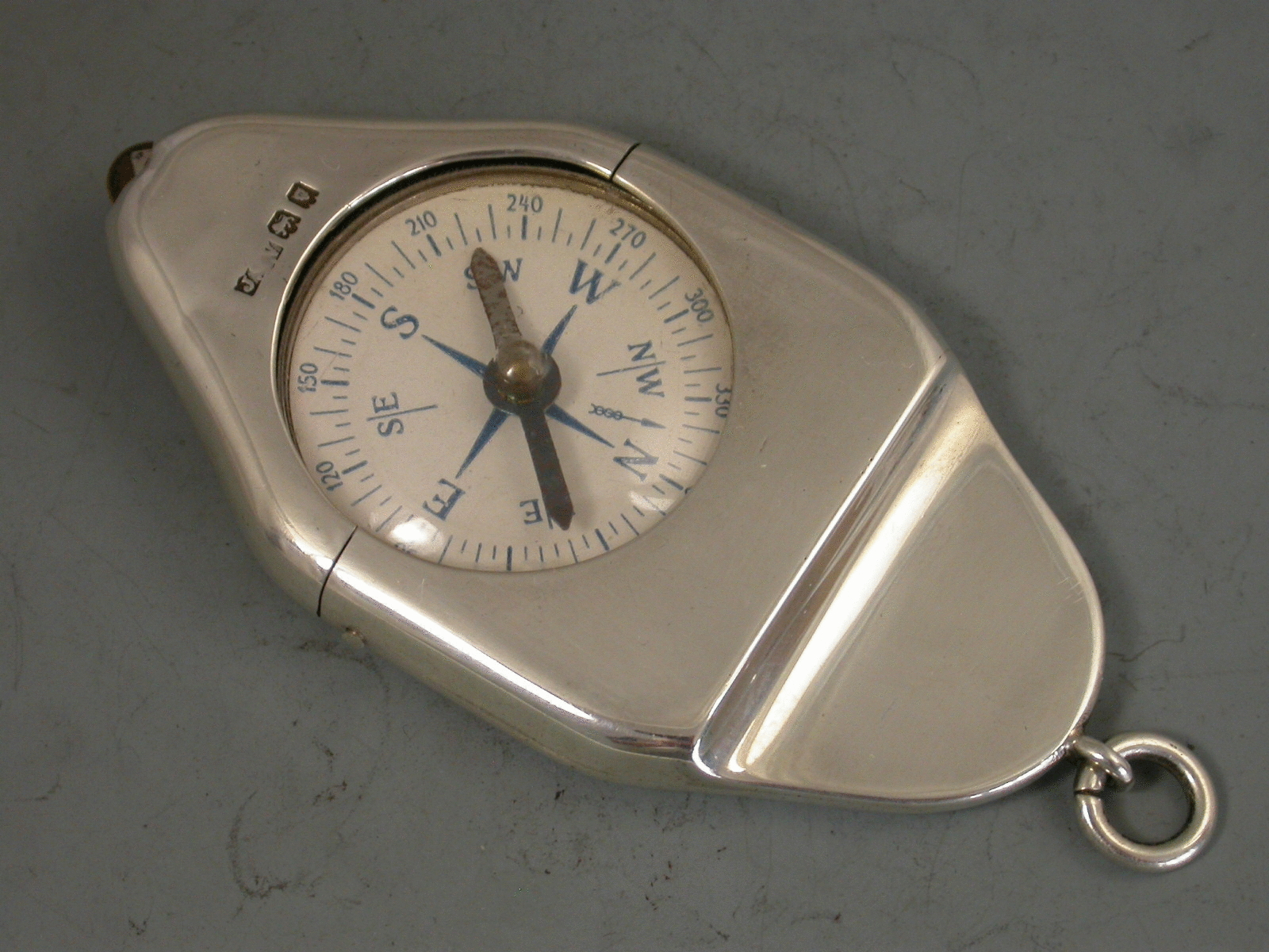 A rare George V silver combined Map Measuring Tool and Compass with a dial on either side, attached suspension ring.