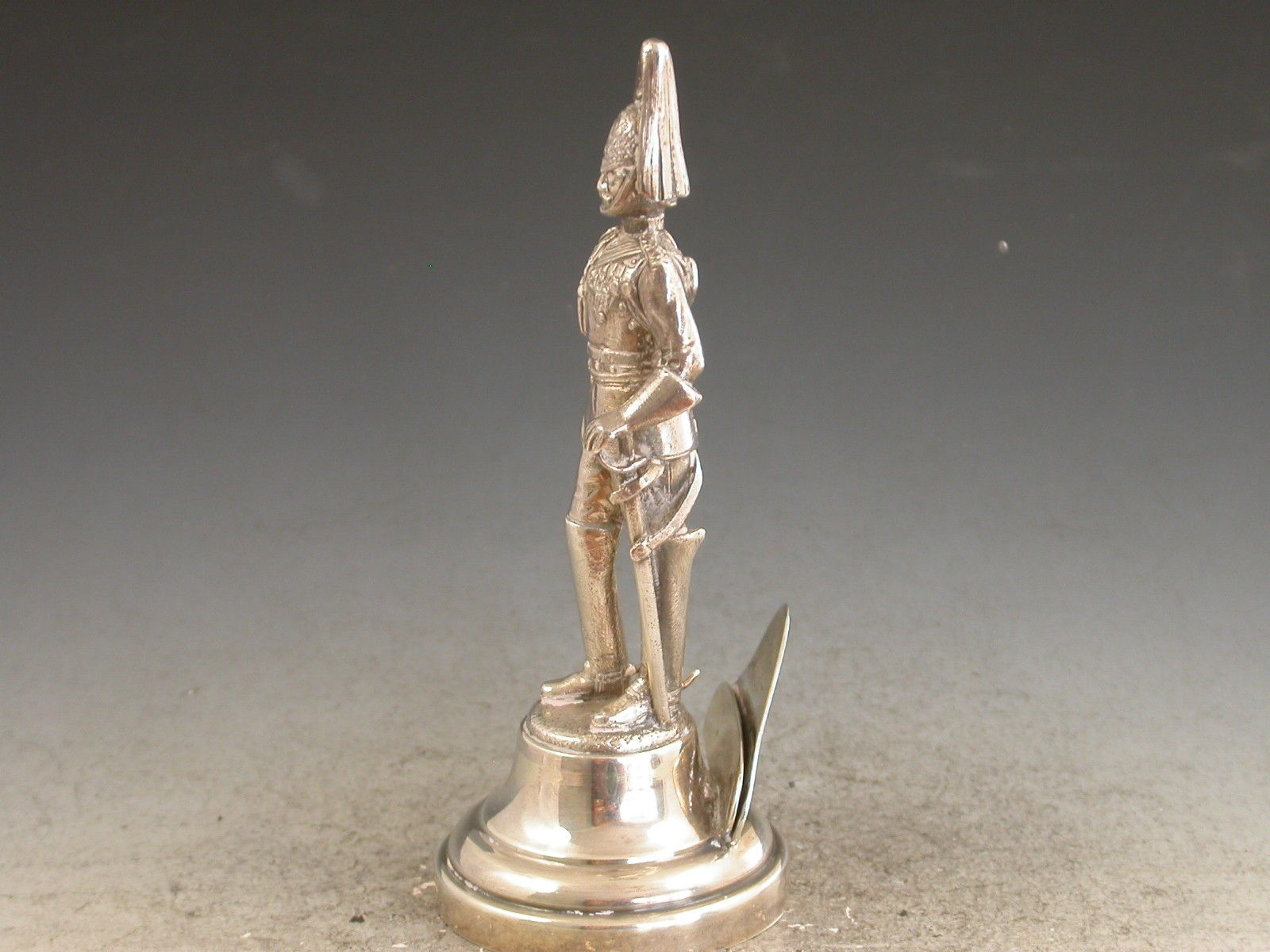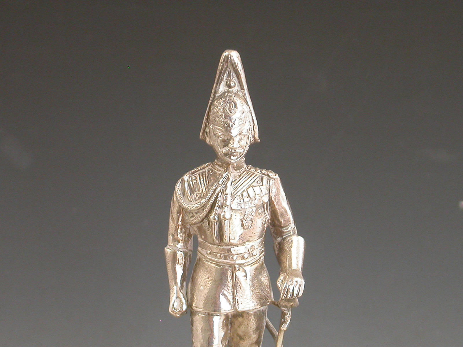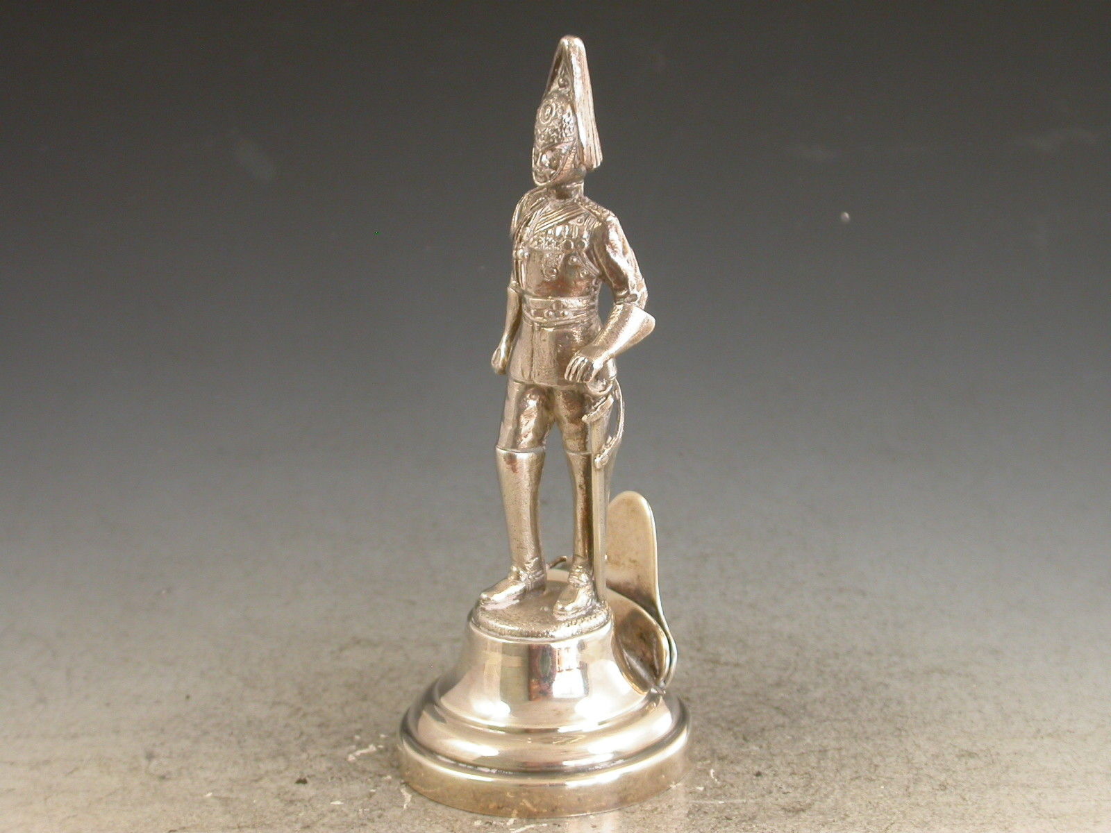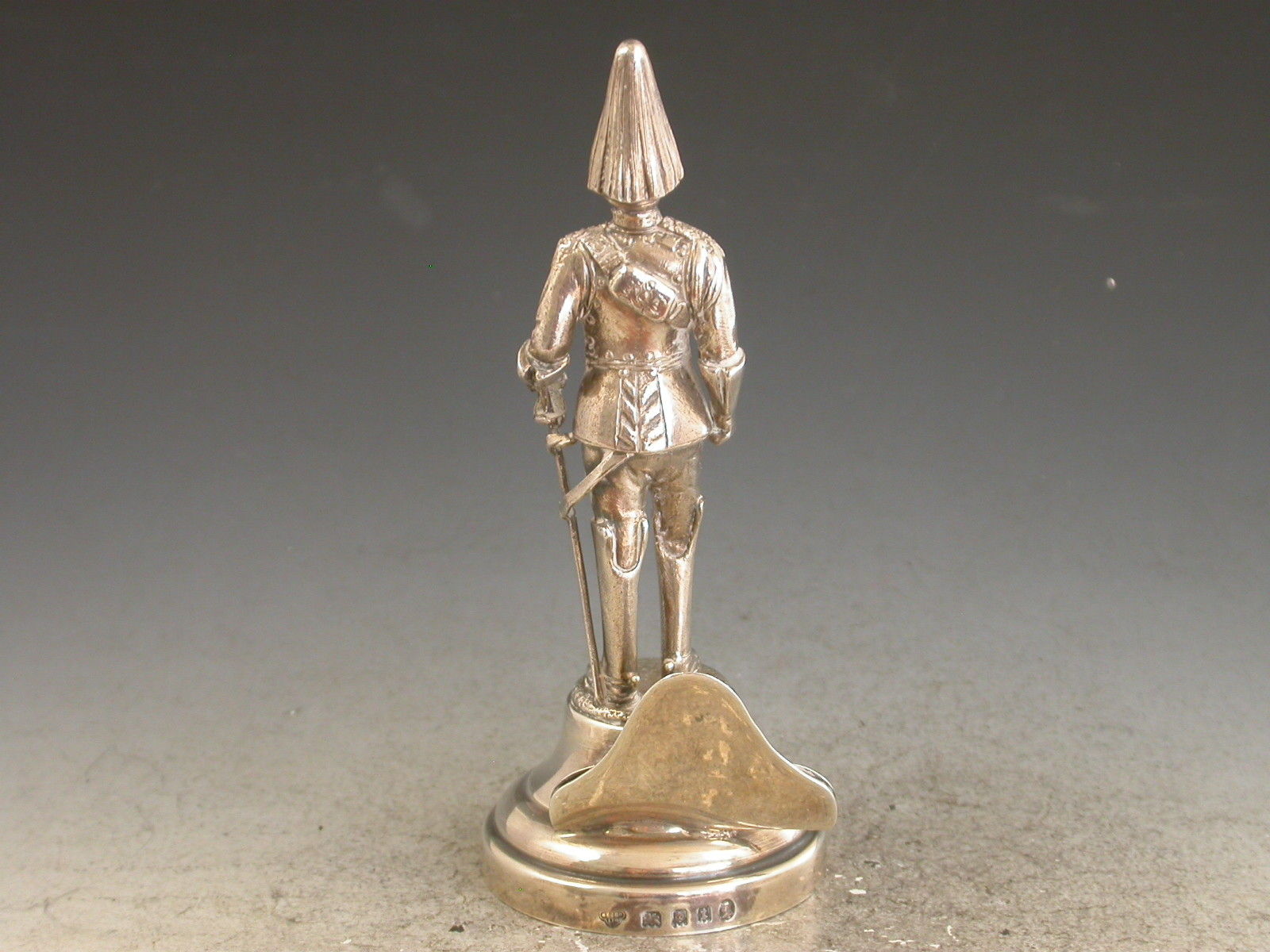 A very fine quality early 20th century cast silver Menu Holder made in the form of a Soldier from the Household Cavalry (either The Life Guards or The Blues and Royals) standing on a circular pedestal base.