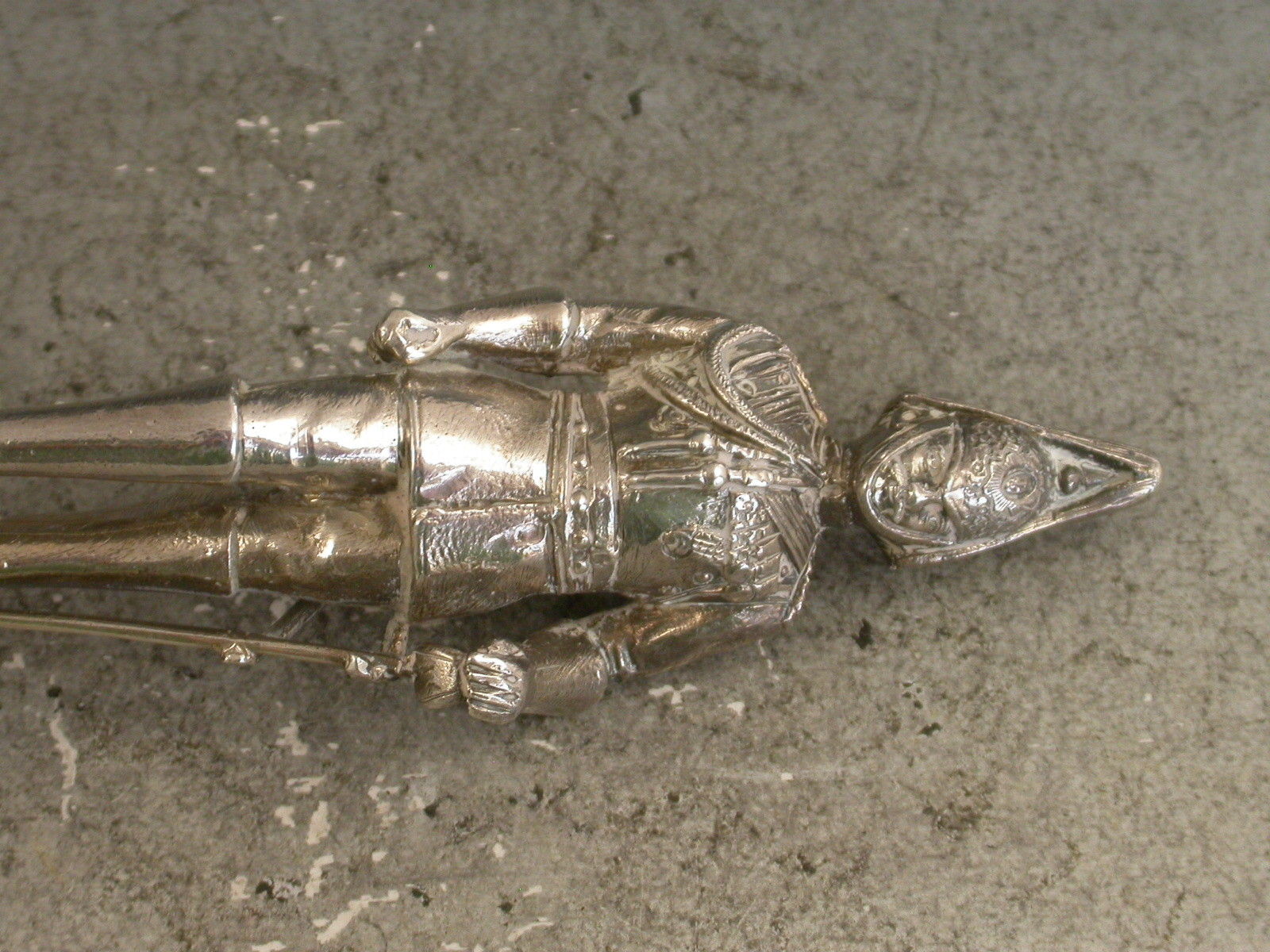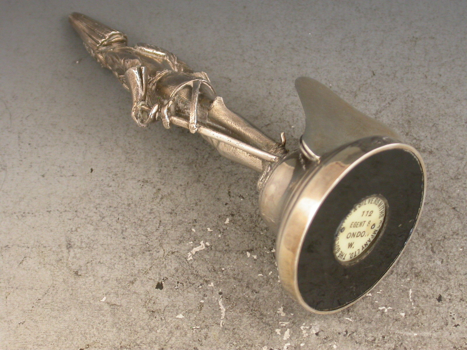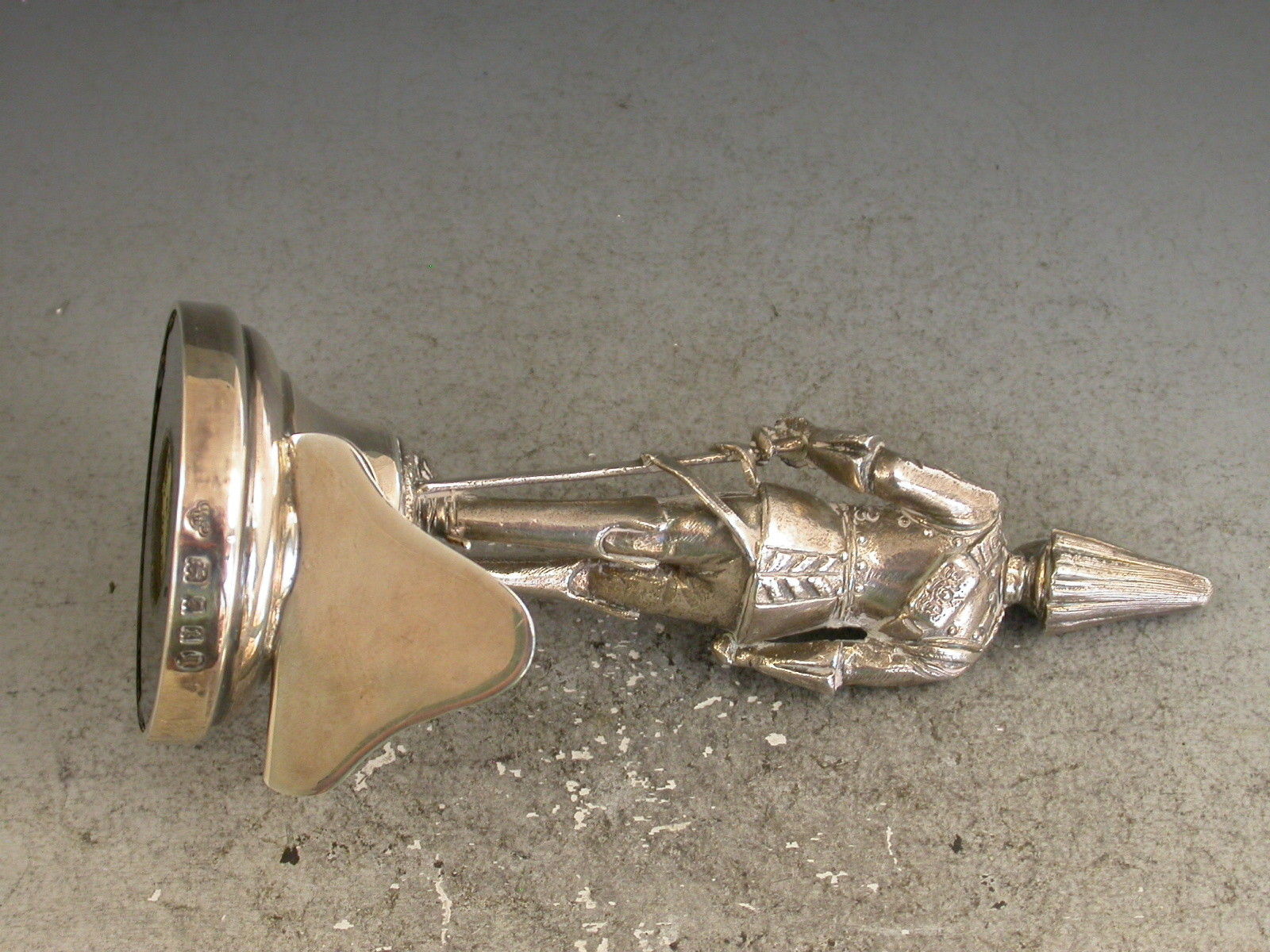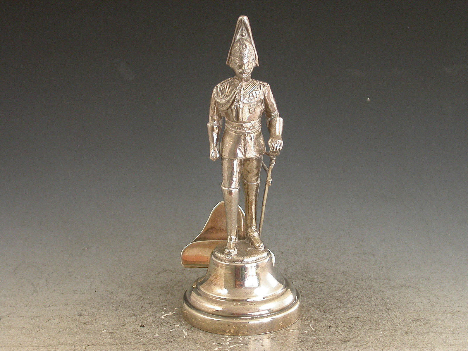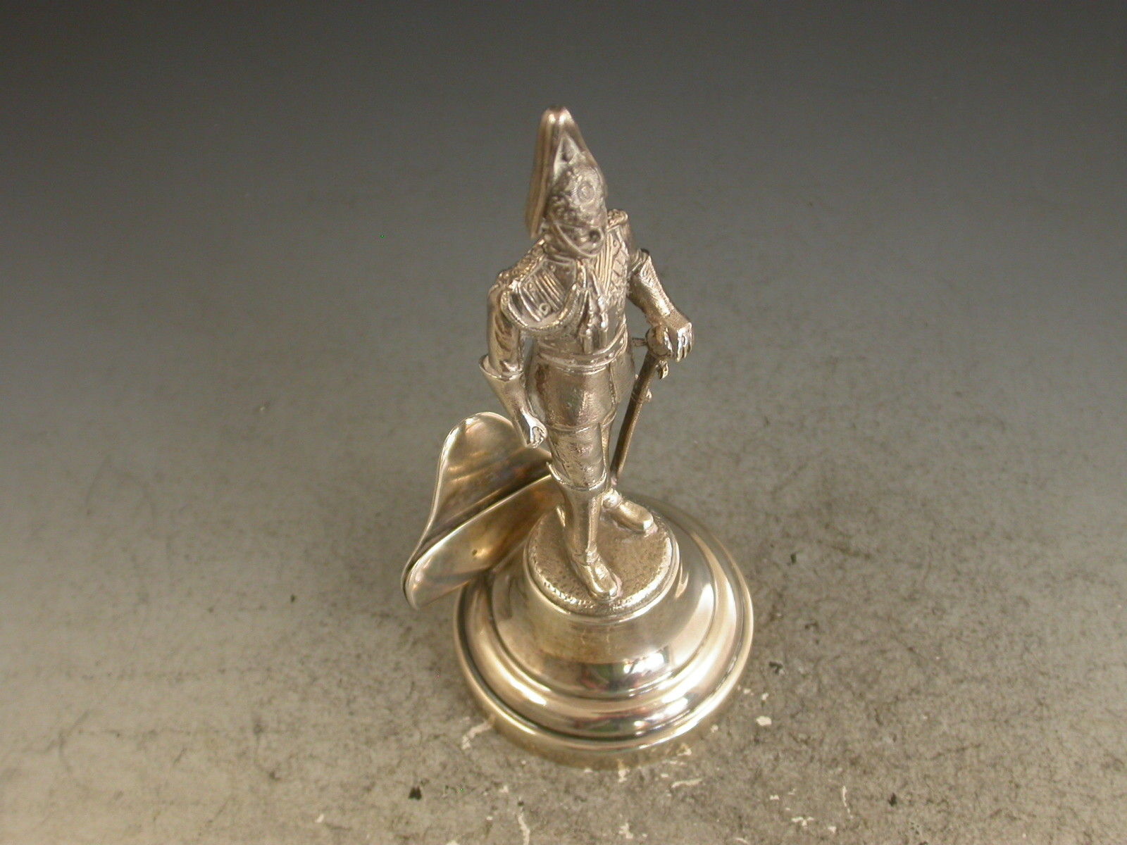 A very fine quality early 20th century cast silver Menu Holder made in the form of a Soldier from the Household Cavalry (either The Life Guards or The Blues and Royals) standing on a circular pedestal base.