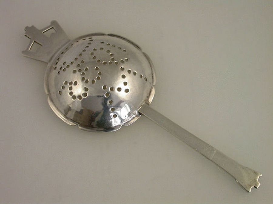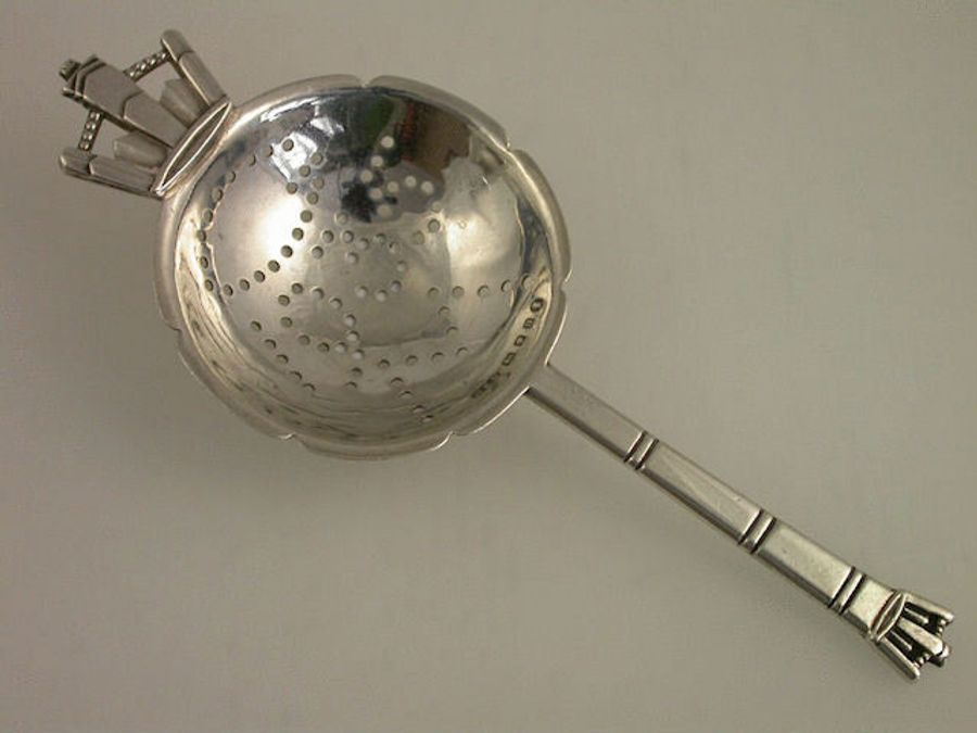 A cased silver Commemorative Tea strainer in the Art Deco style with crown shaped handles, the shaped circular bowl pierced ‘G 1935 M’ to commemorate the silver jubilee of George V and Queen Mary in 1935. Complete with original silk and velvet lined fitted case and retailed by Asprey of Bond Street, London.