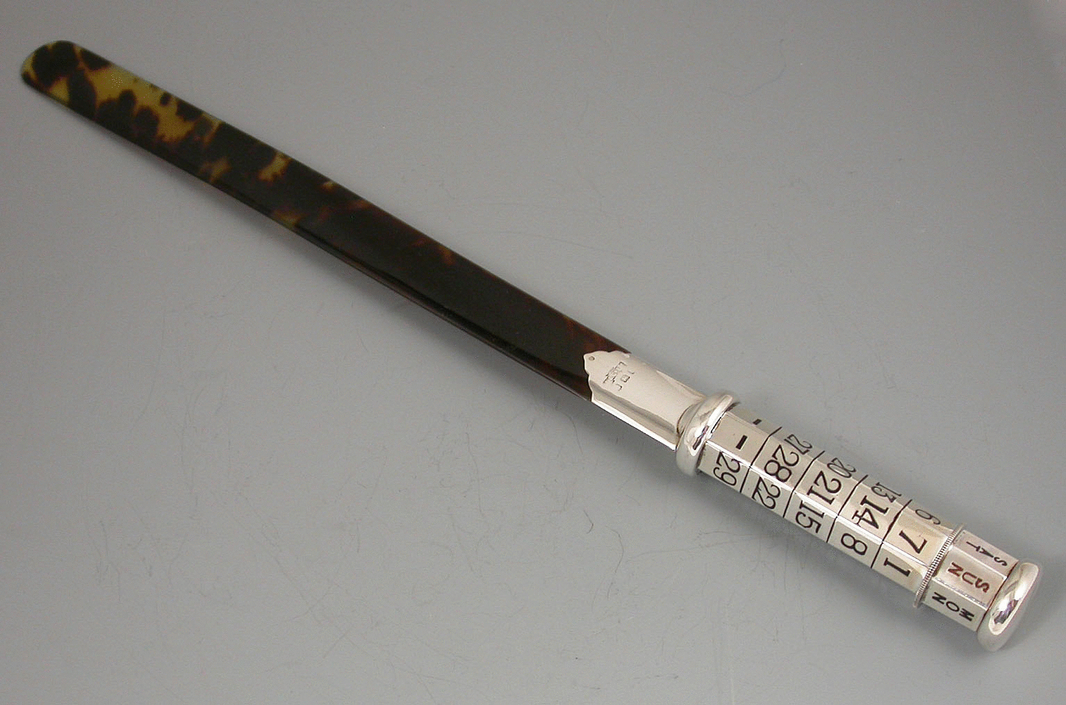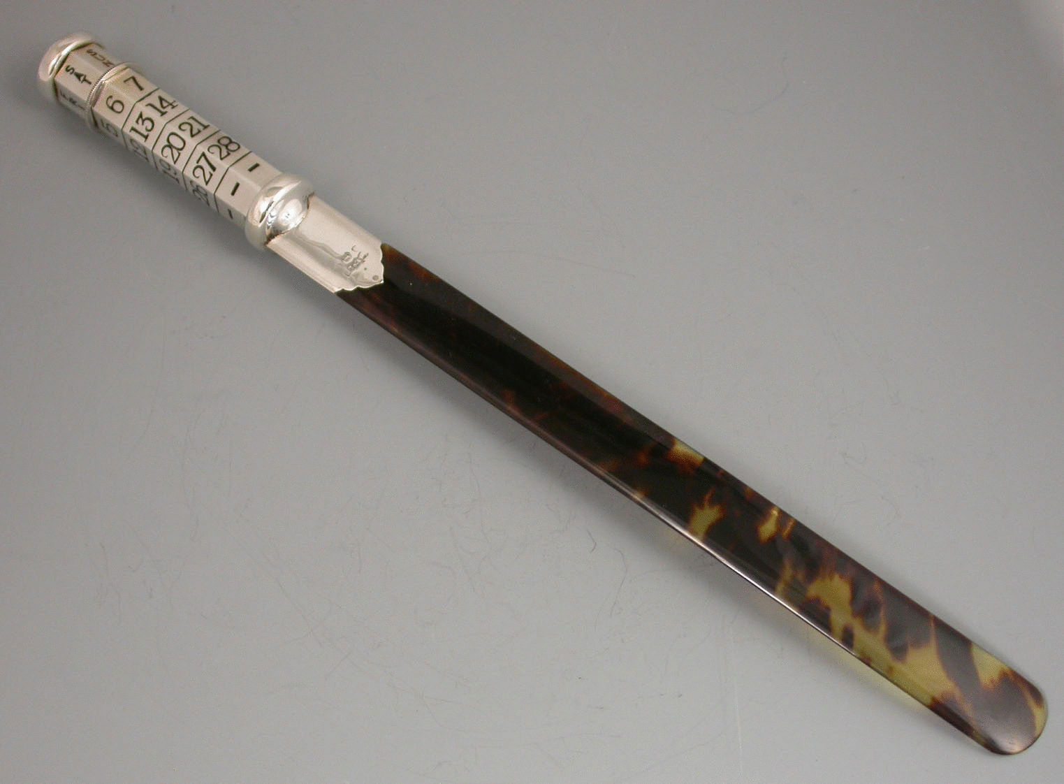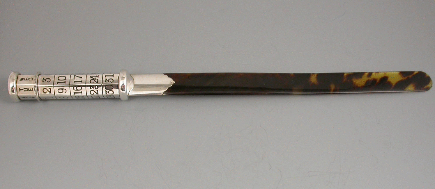 A fine quality and large George V silver mounted tortoiseshell Paper Knife/Page Turner/ Perpetual Calendar, the seven sides handle enameled with days and dates in black enamel, Sunday in red. The dates are changed by turning the knurled wheel against a ratchet.