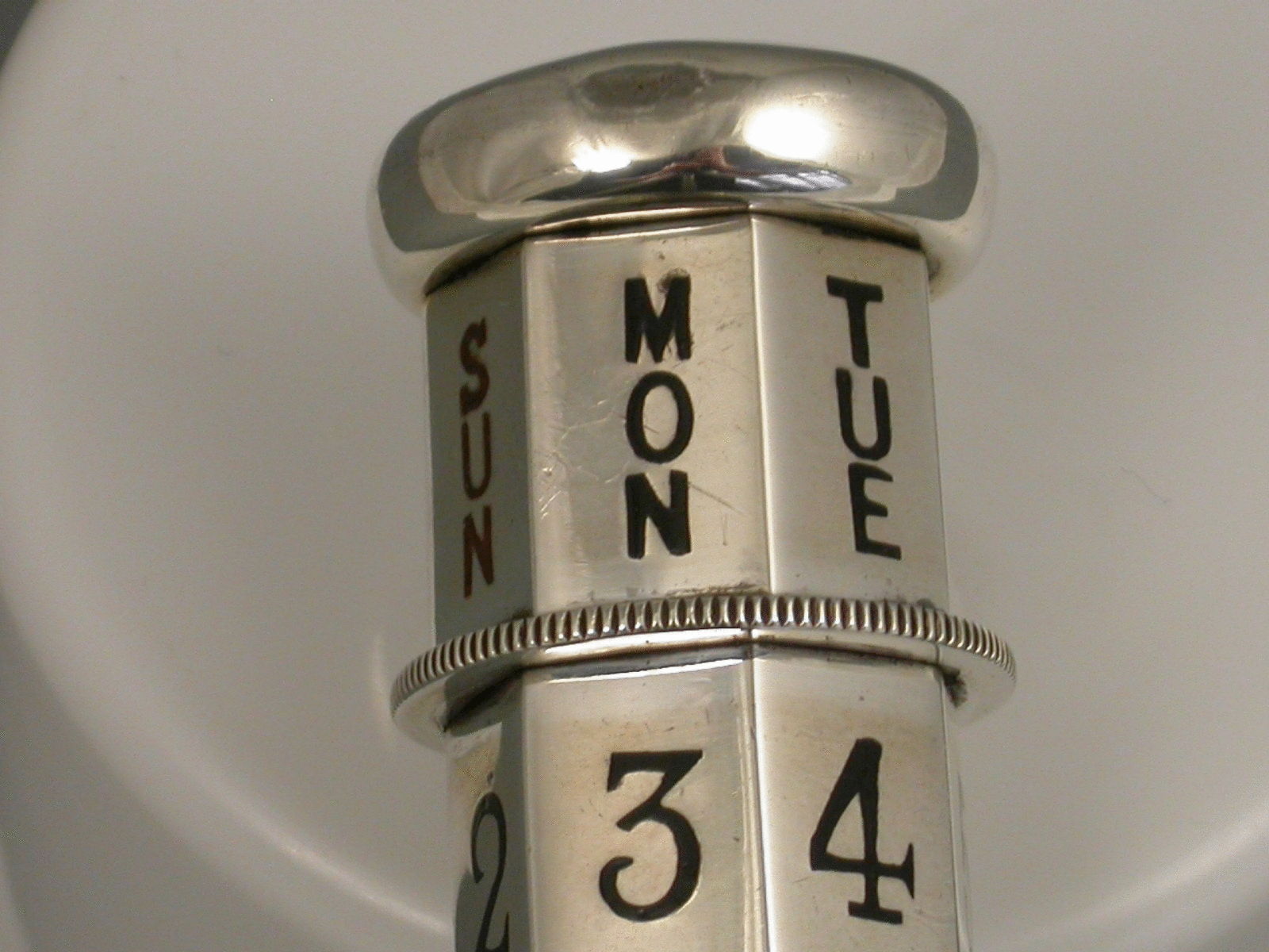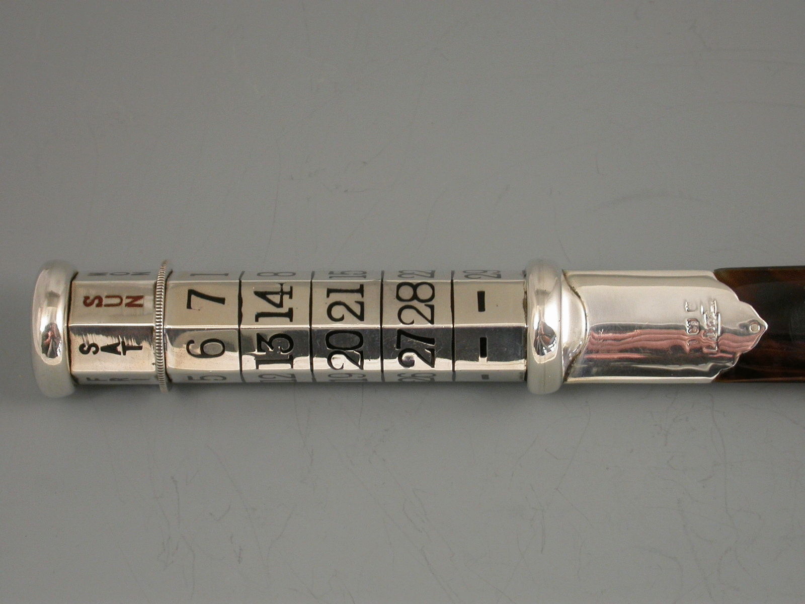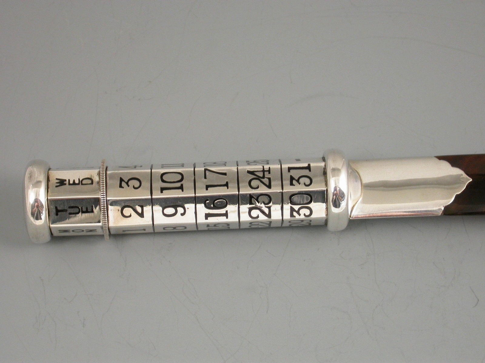 A fine quality and large George V silver mounted tortoiseshell Paper Knife/Page Turner/ Perpetual Calendar, the seven sides handle enameled with days and dates in black enamel, Sunday in red. The dates are changed by turning the knurled wheel against a ratchet.