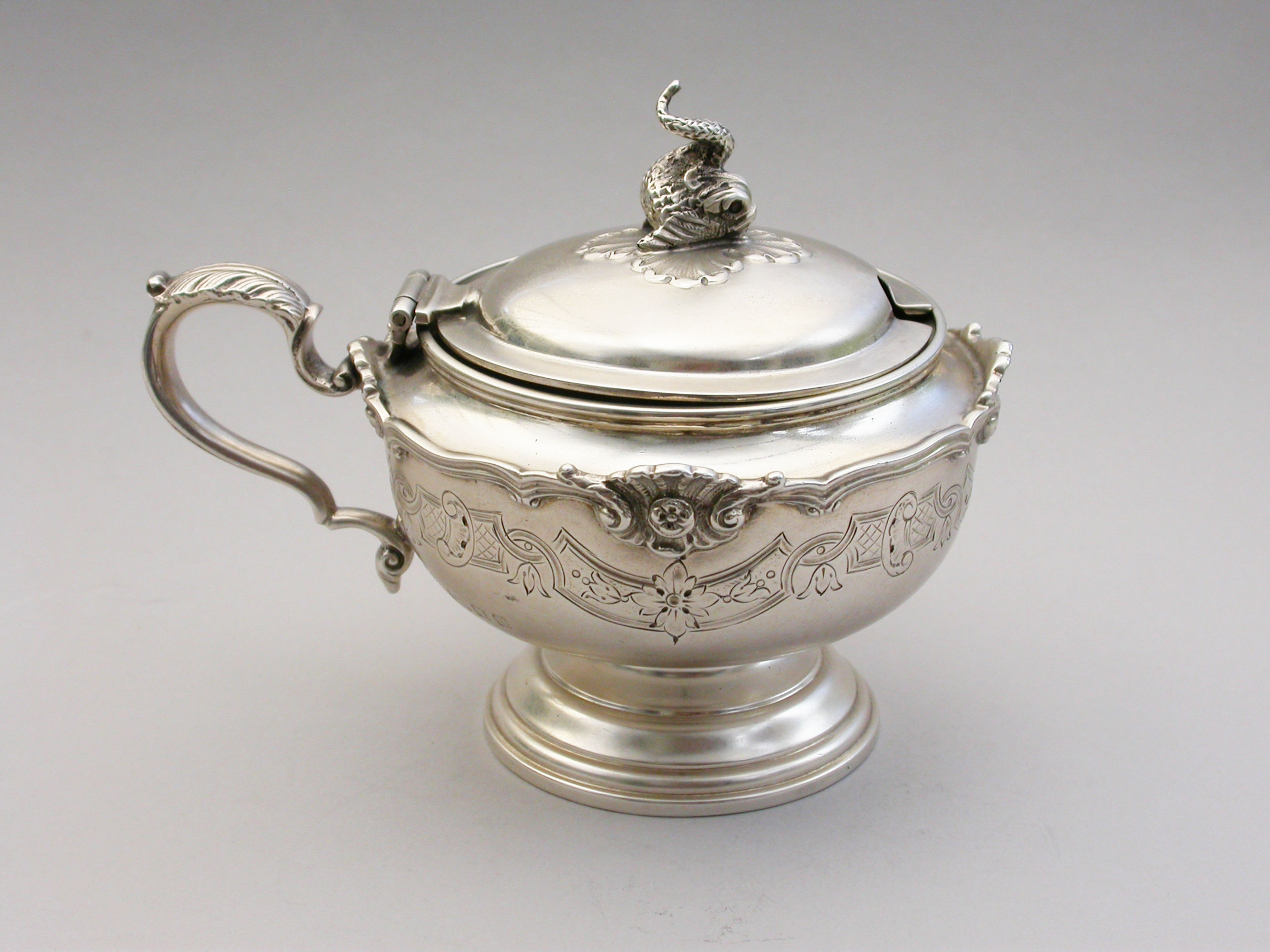 A good quality early 20th century silver Mustard Pot made in the Georgian style, of compressed circular form with leaf capped scroll handle and shaped reeded border decorated with shells, a band of engraved foliate scroll decoration to the body and a cast Dolphin finial to the lid. Silver gilt interior.