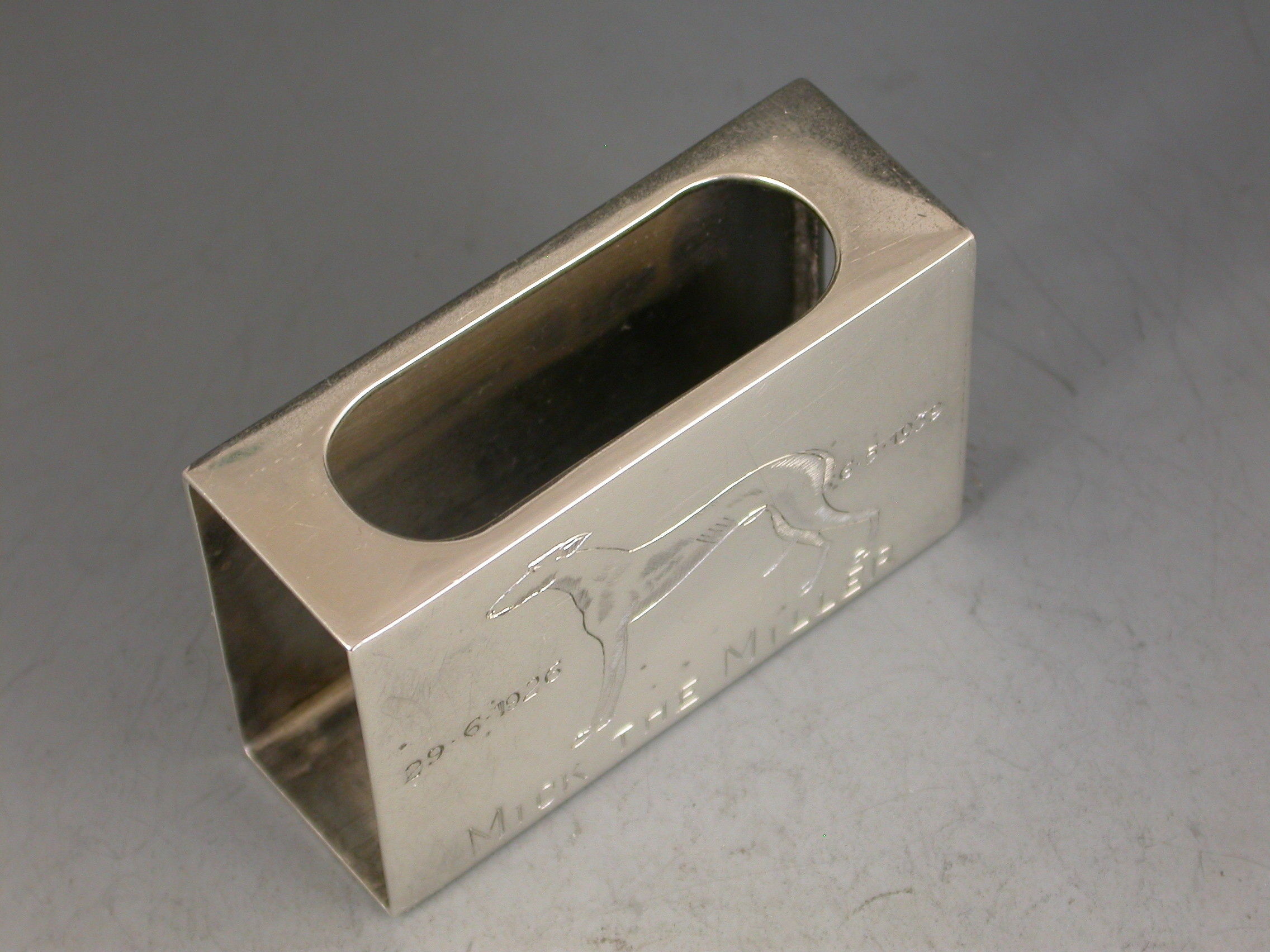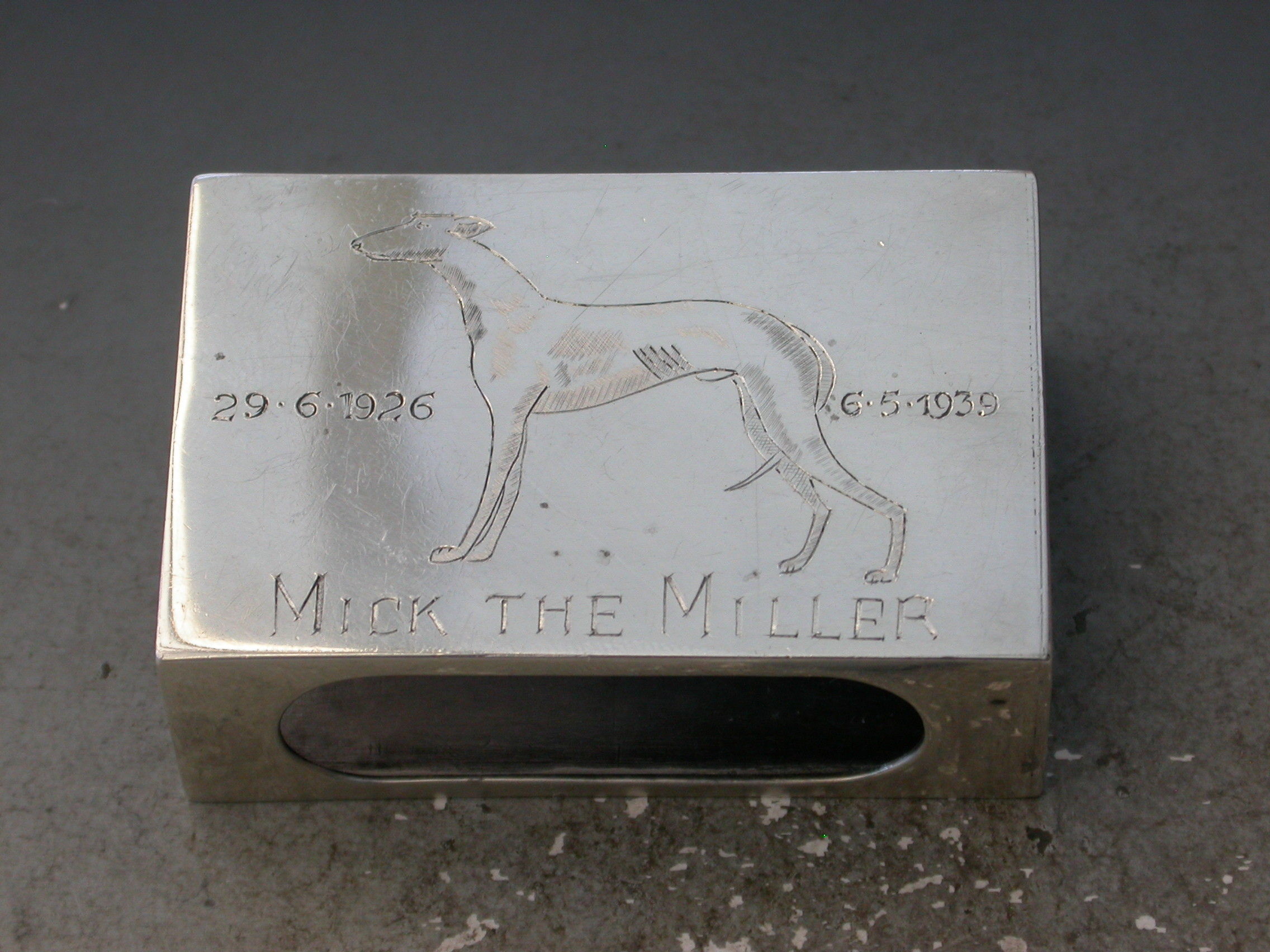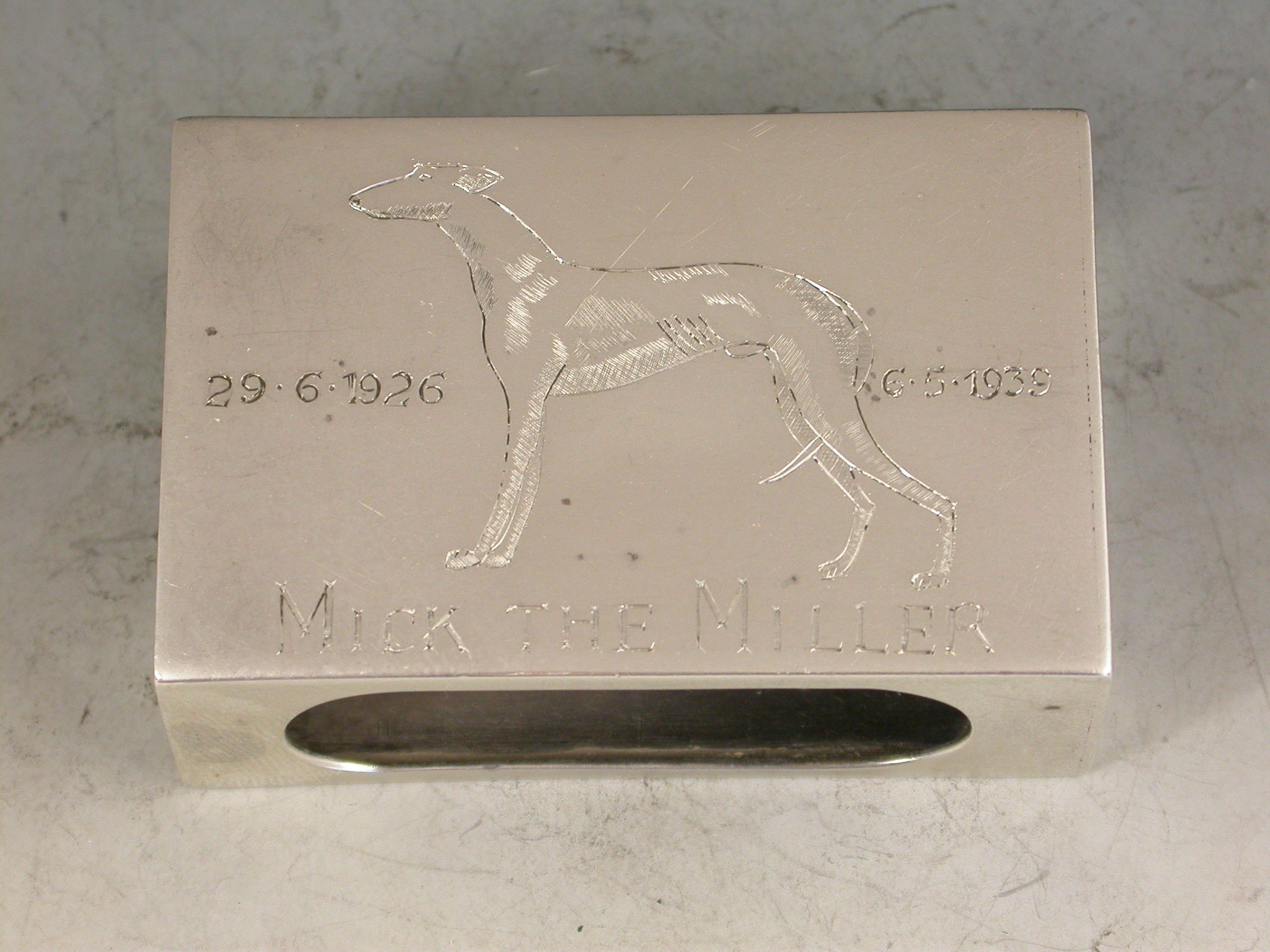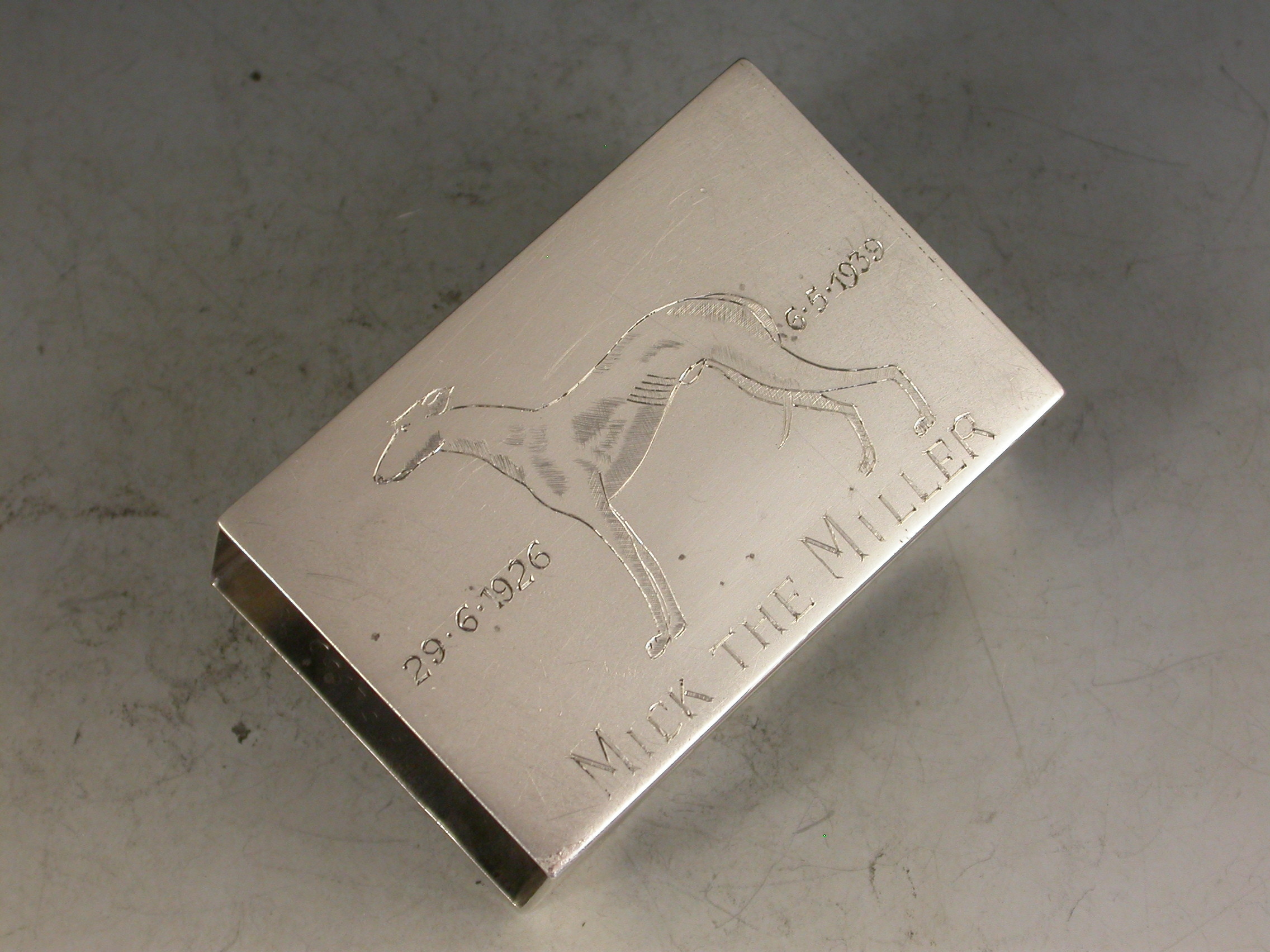 A good quality George VI commemorative silver Matchbox Cover engraved with an image of ""Mick the Miller"", the famous greyhound.