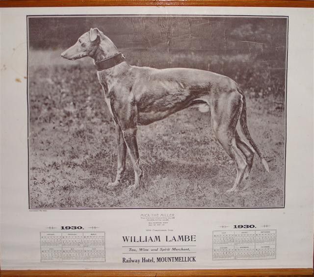 Mick the Miller (29 June 1926 – 6 May 1939) was a male brindle Greyhound. He is celebrated as the first great racing greyhound to compete in England (although he was born in Killeigh, County Offaly). Despite a short three year racing career, his achievements were highly publicised around the world and by the end of his career he had become an icon in the sport. His achievements include winning nineteen races in a row, including the English Greyhound Derby on two successive occasions. He suffered an injury at Wimbledon Stadium whilst racing which broke the streak in 1931, and once recovered was beaten in the attempt to win a third Derby title. He went on to appear in films, and is still considered one of the greatest sporting heroes in the UK.