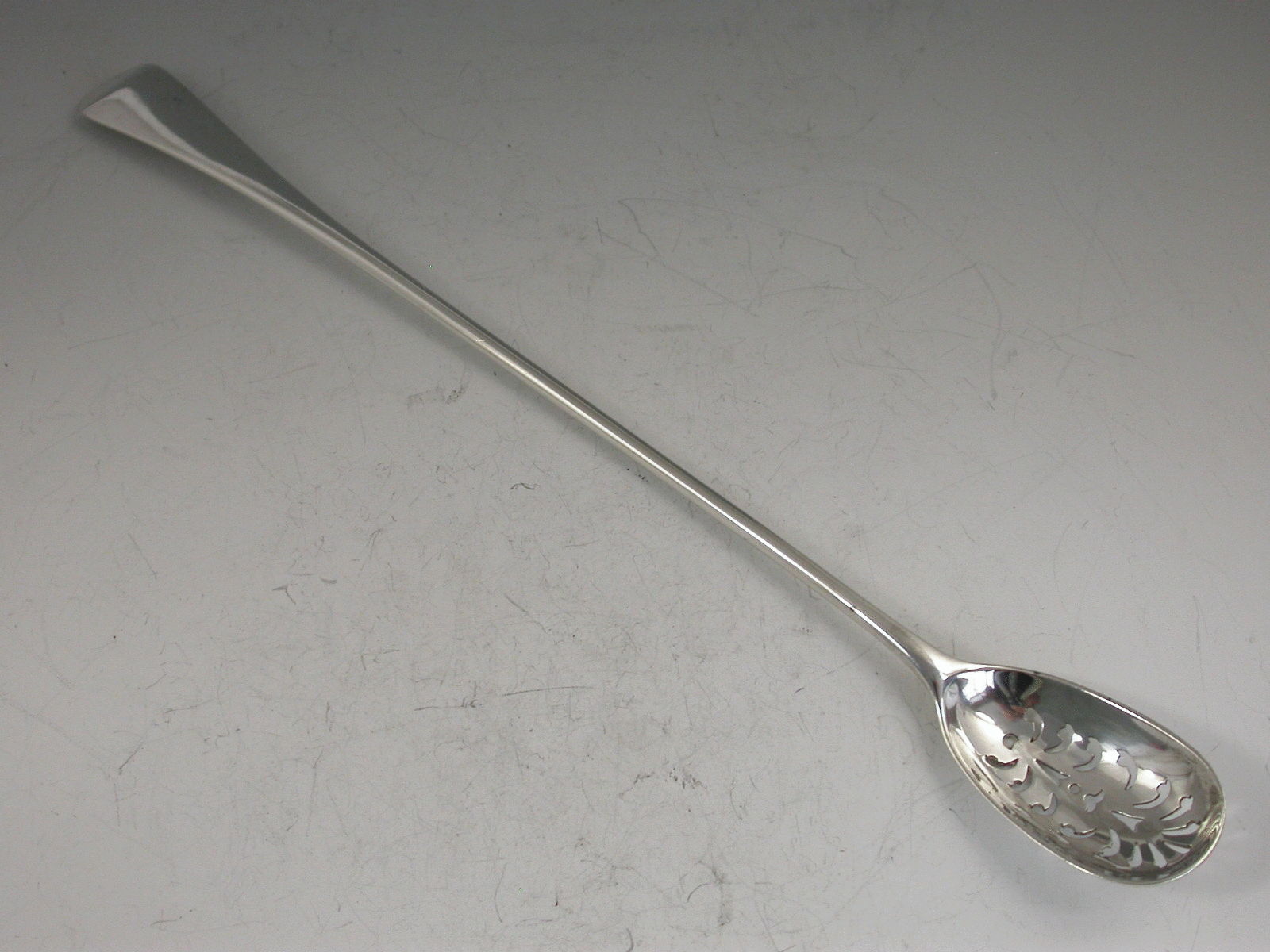 An unusual Georgian silver Spoon of unknown use (possibly for olives) with long plain Old English handle and pierced oval bowl similar to a Mote Spoon in design.
