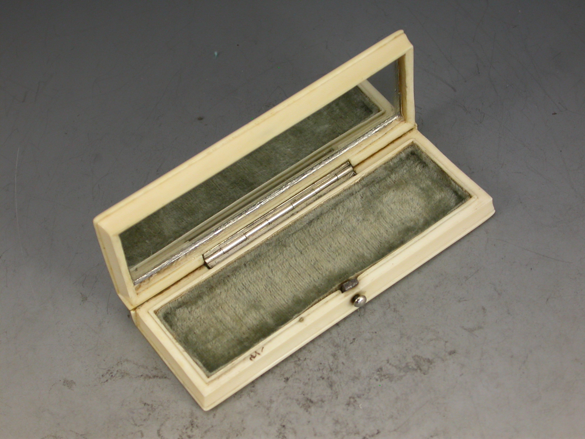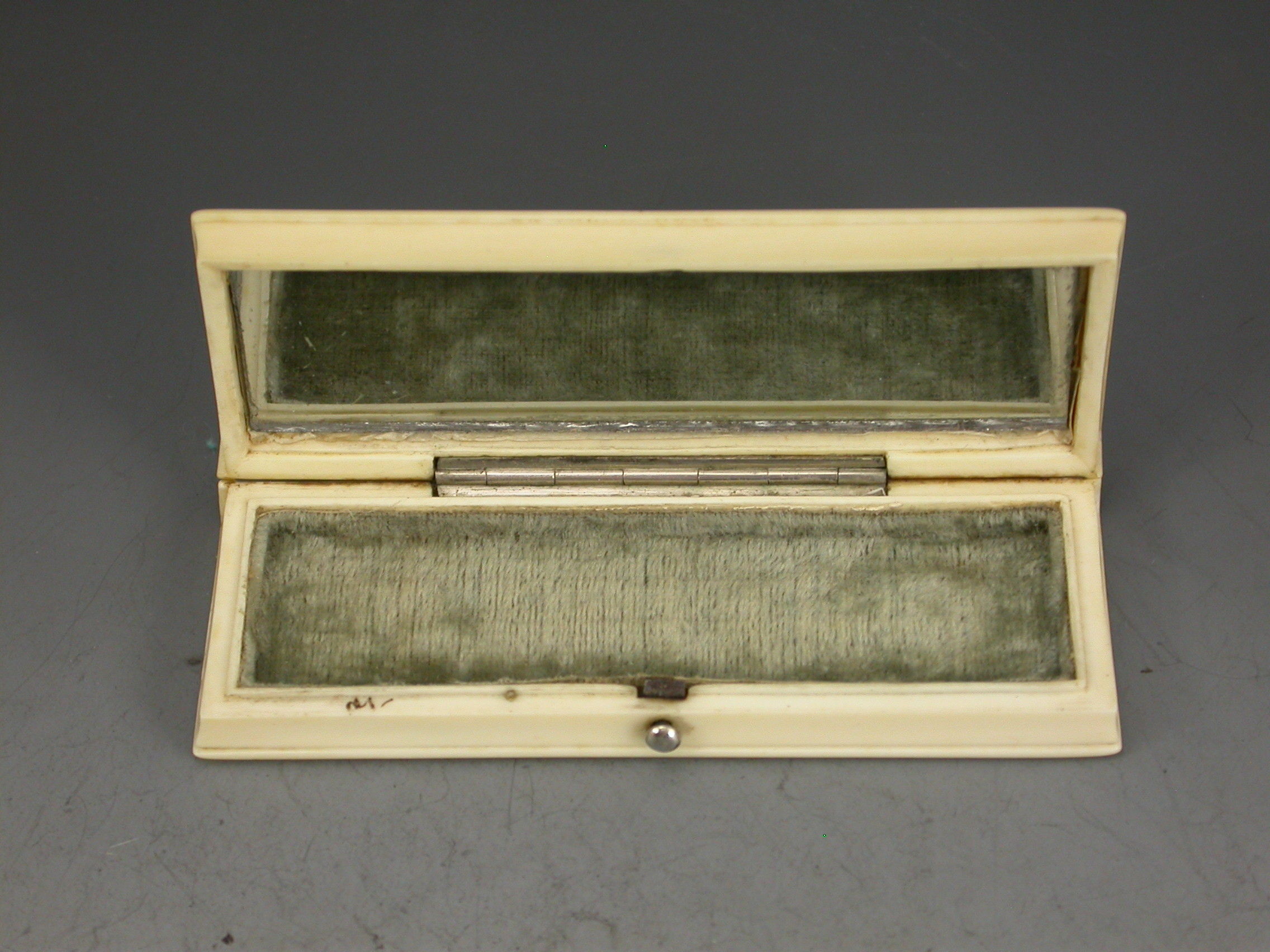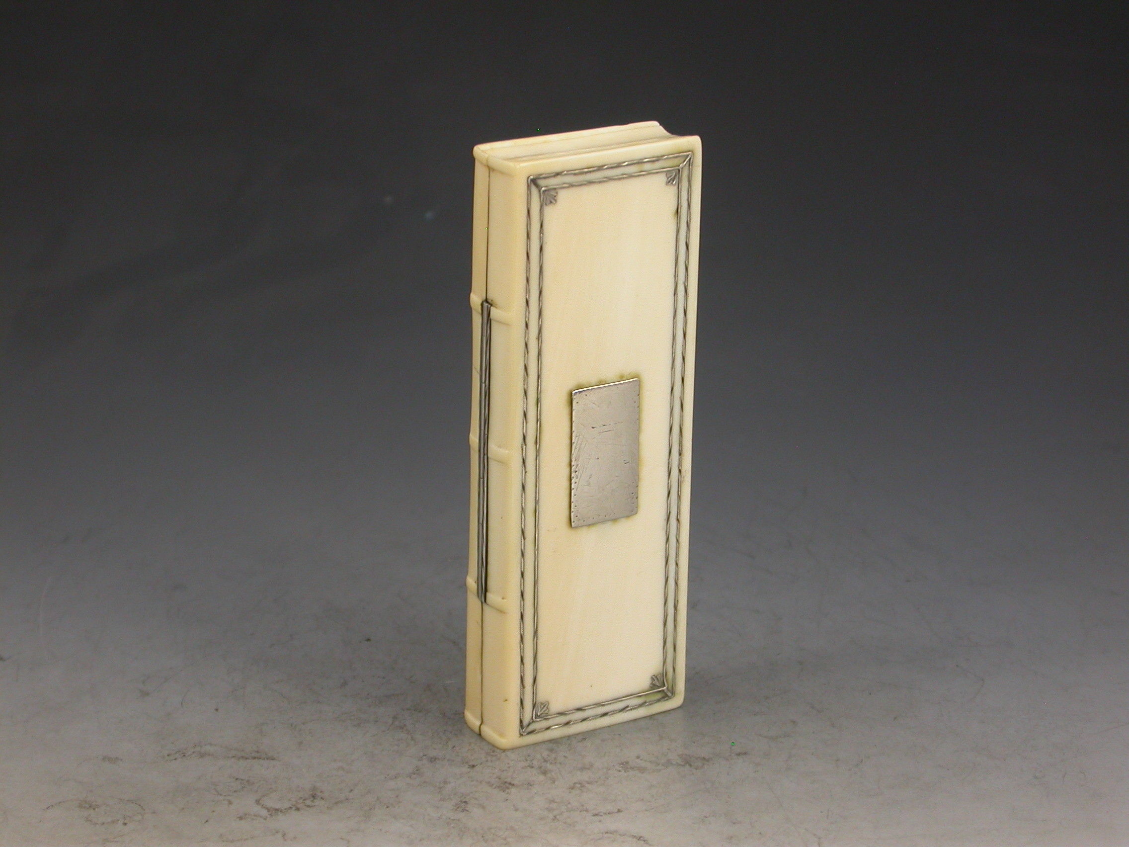 A good Georgian English ivory Toothpick Case made in the form of a book with carved spine to resemble book binding. A double line of silver stringing to the border of the lid and a central rectangular silver plaque. Velvet lined interior with mirror to the lid.