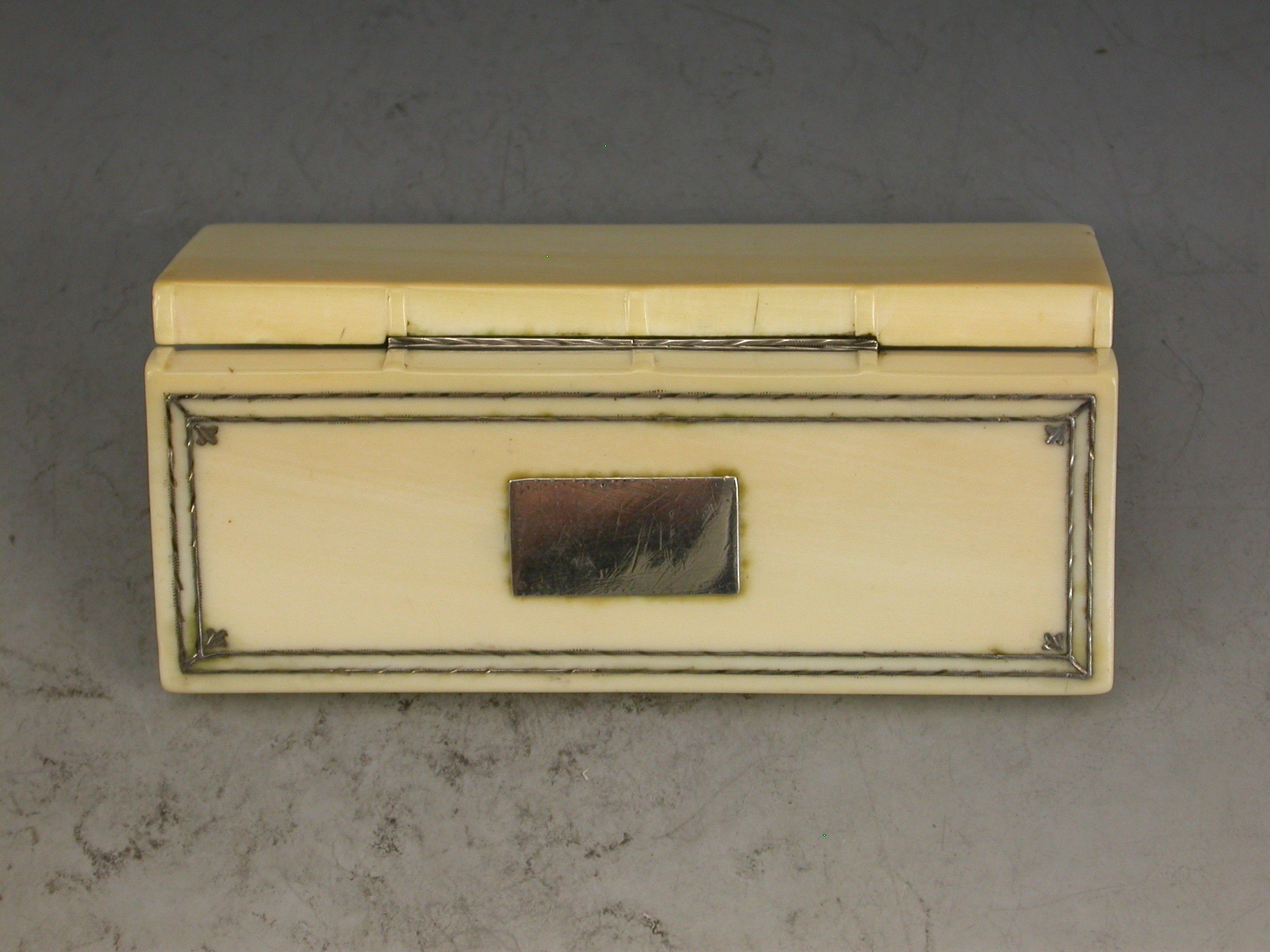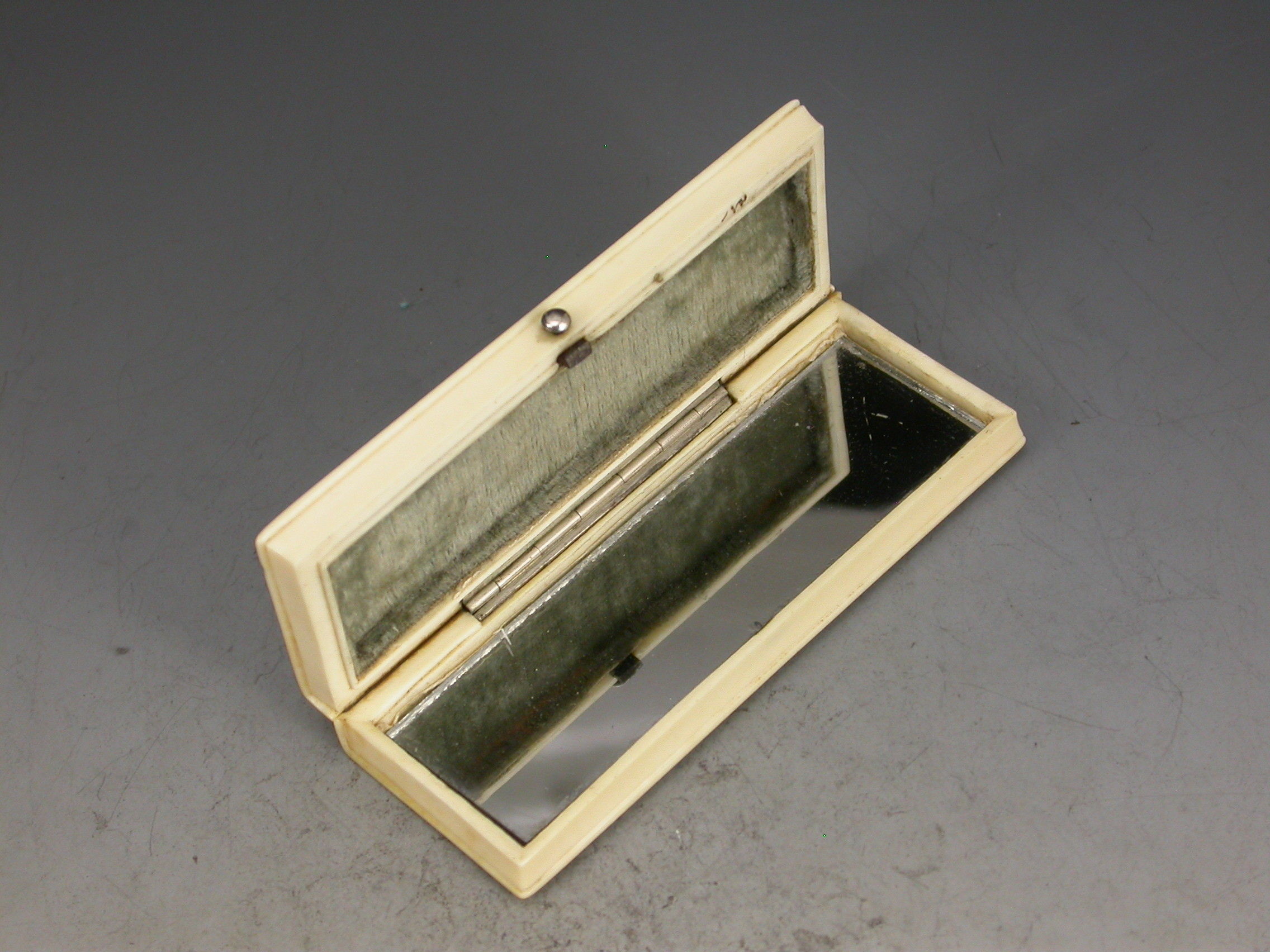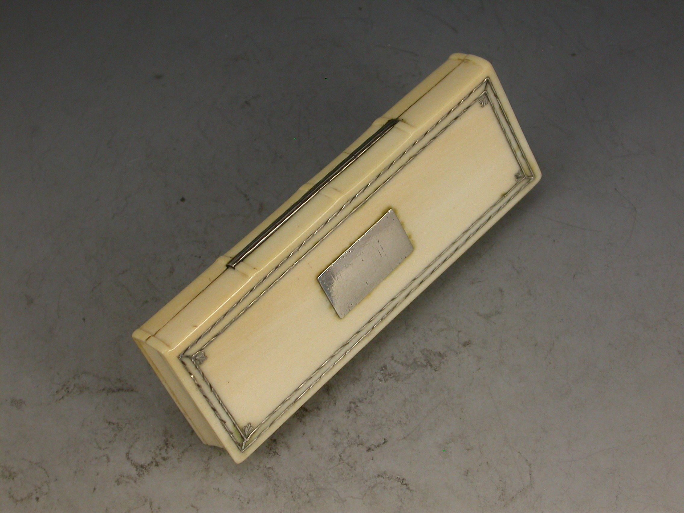 A good Georgian English ivory Toothpick Case made in the form of a book with carved spine to resemble book binding. A double line of silver stringing to the border of the lid and a central rectangular silver plaque. Velvet lined interior with mirror to the lid.