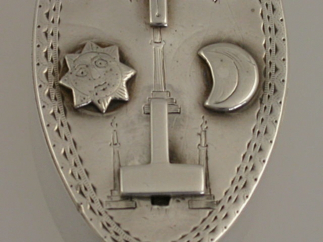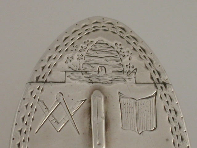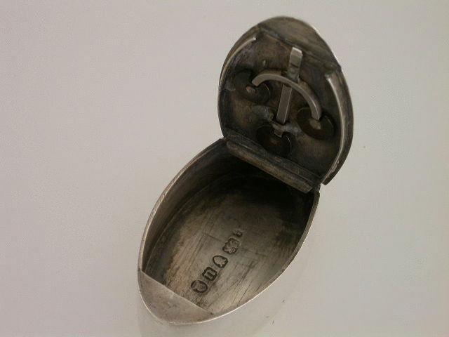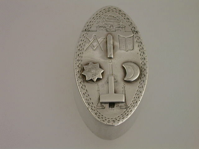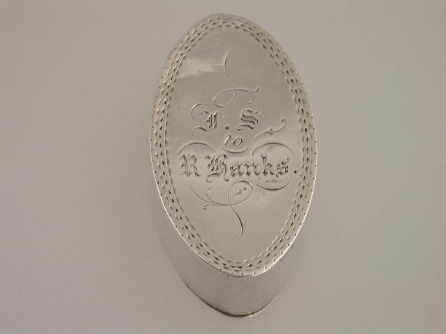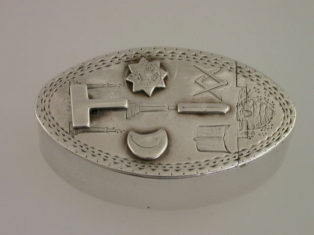 An extremely rare and unusual 18th century silver trick opening Masonic Snuff or Patch Box, of oval form with flush hinge, the lid bright-cut engraved and set with applied Masonic symbols, including the sun, the moon, a beehive, a set square and compass etc. The Set square has to be pushed forward to unlock the interior mechanism which has three pins locating into circular metal wheels to lock the lid. The base with bright-cut engraved border and presentation inscription – “J.S to R.Banks”.