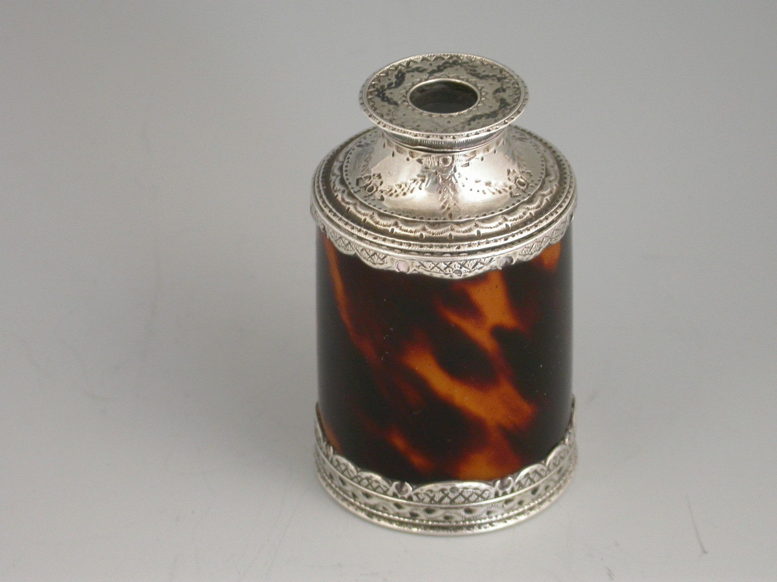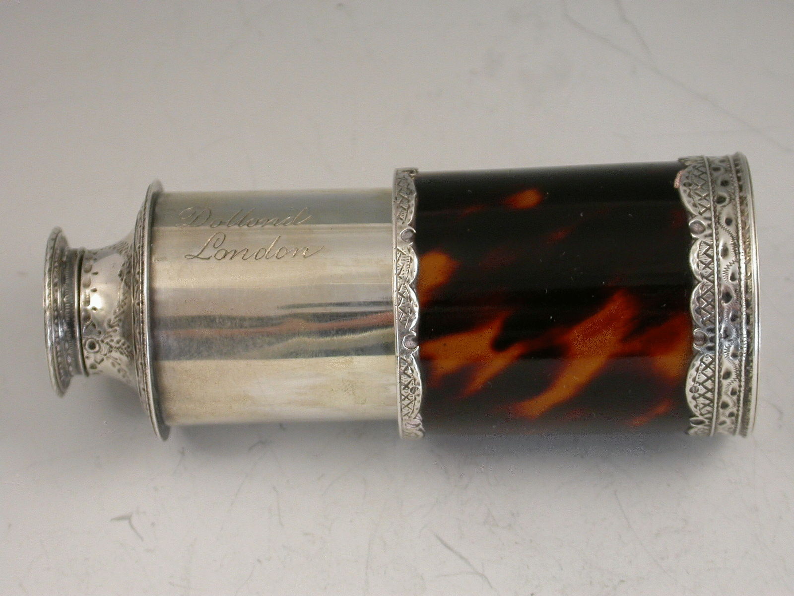 A good Georgian silver mounted two piece Monocular with tortoiseshell body and bright cut engraved decoration, the barrel engraved Dollond, London.