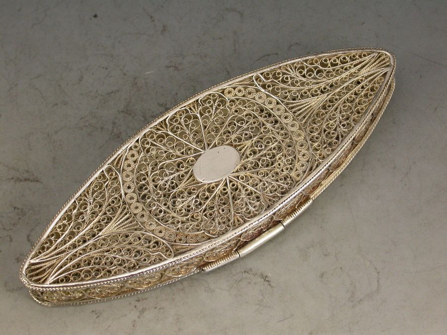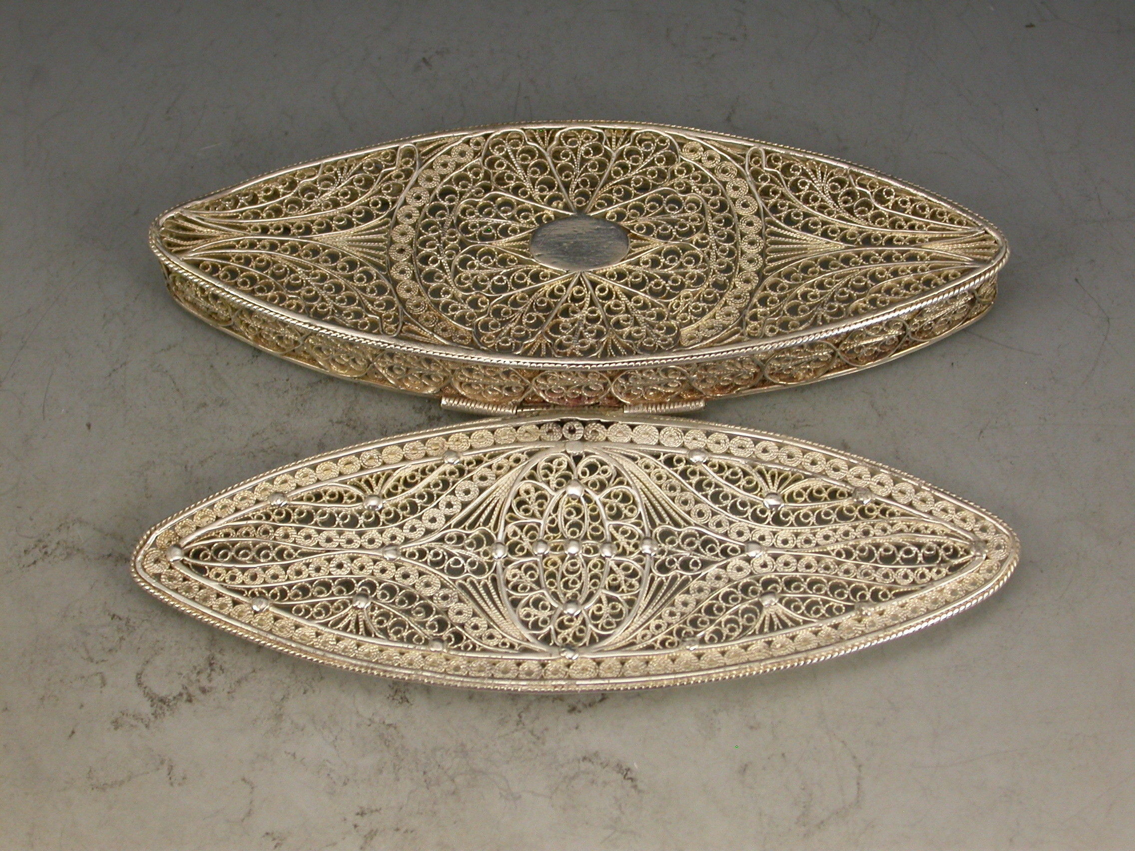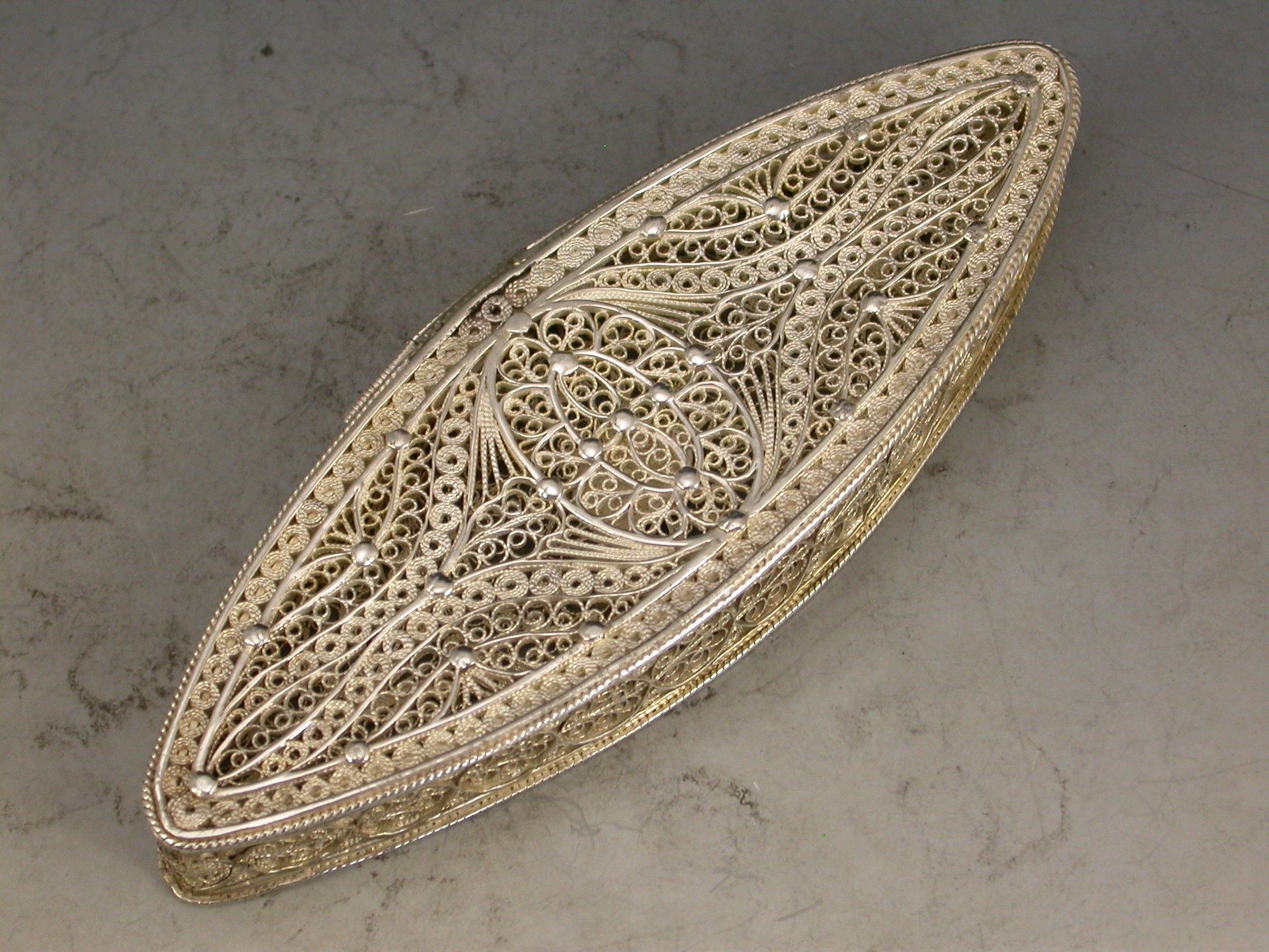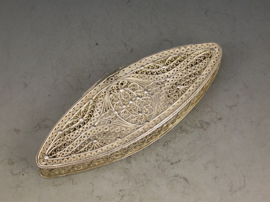 A good quality Georgian navette shaped silver filigree Toothpick Box with hinged lid and vacant oval cartouche to the base.