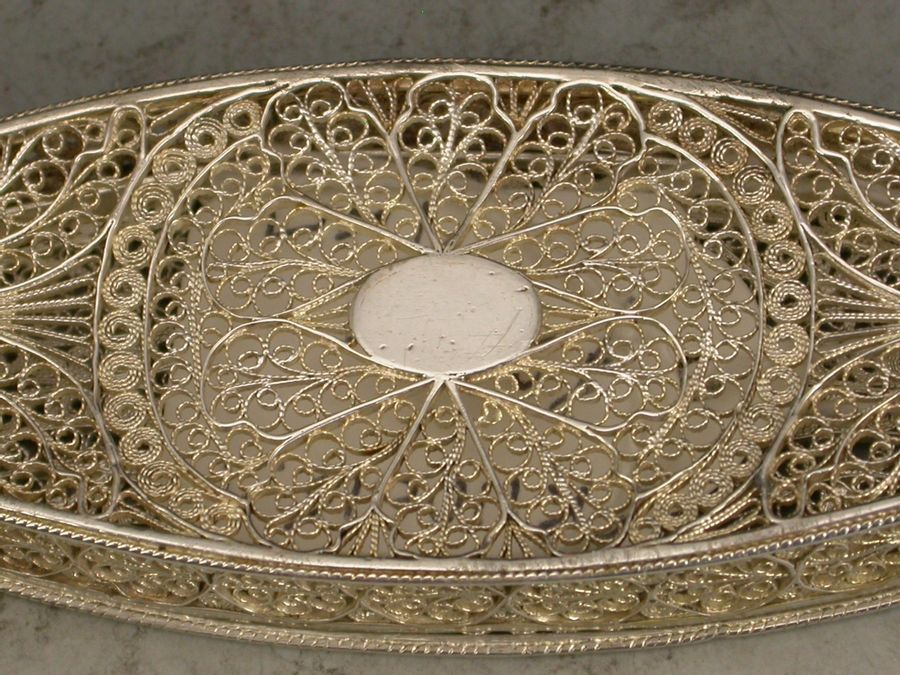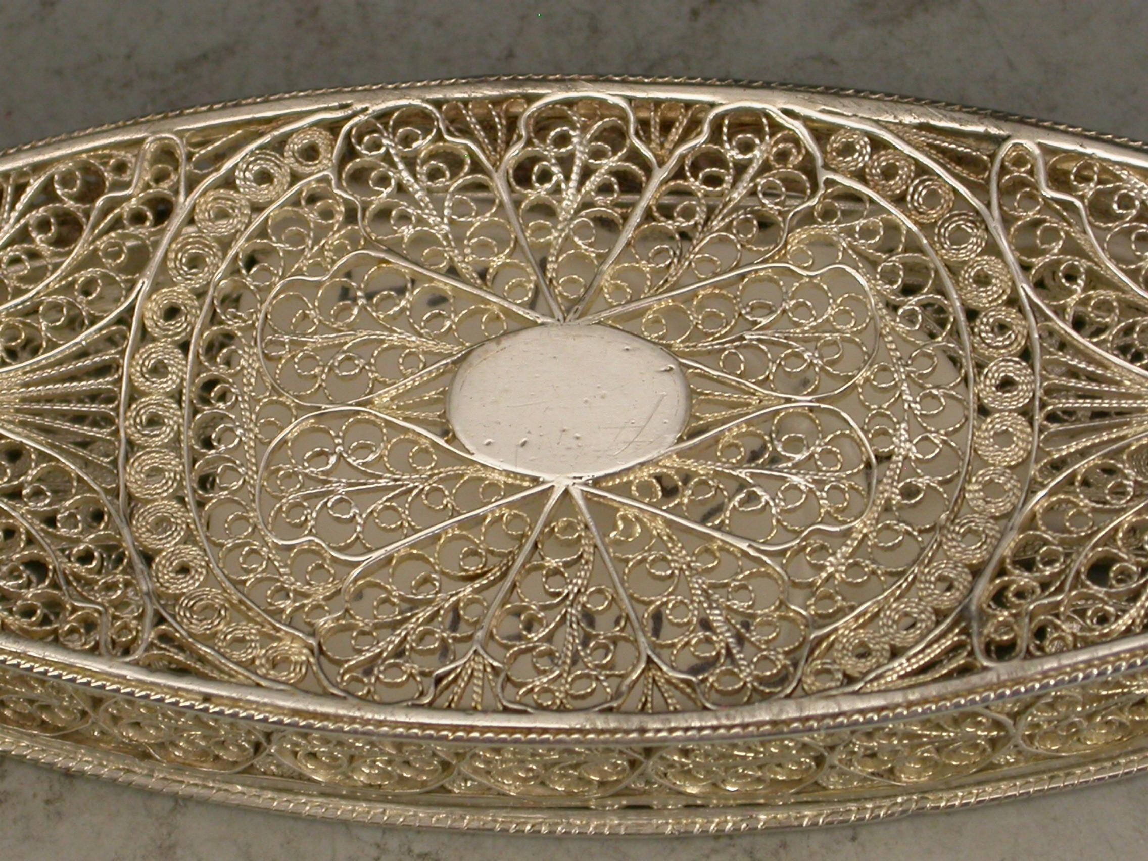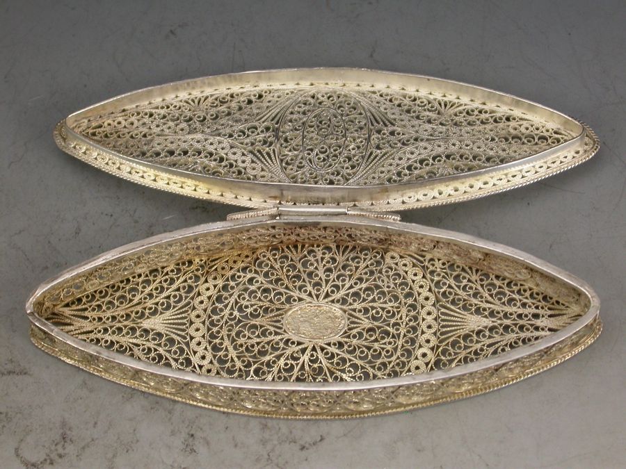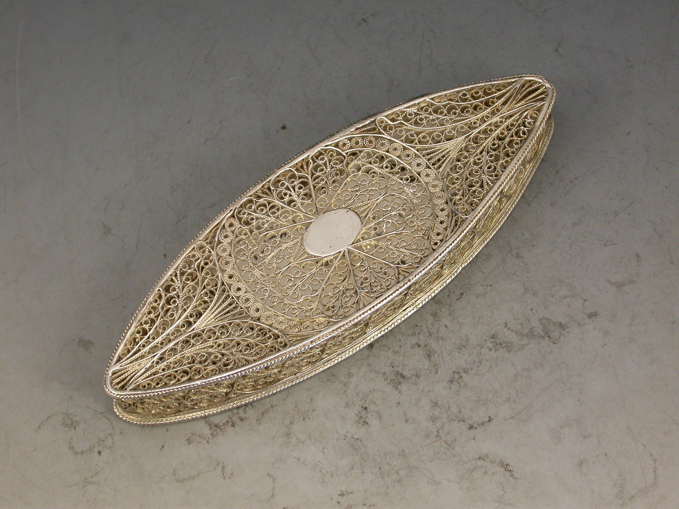 A good quality Georgian navette shaped silver filigree Toothpick Box with hinged lid and vacant oval cartouche to the base.