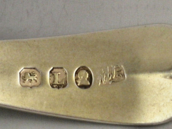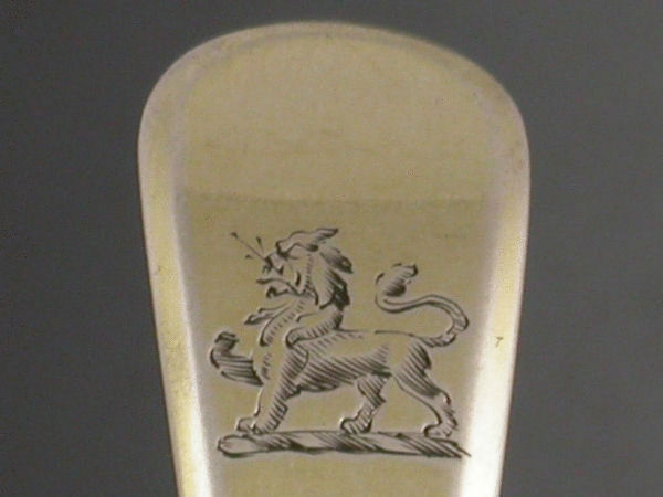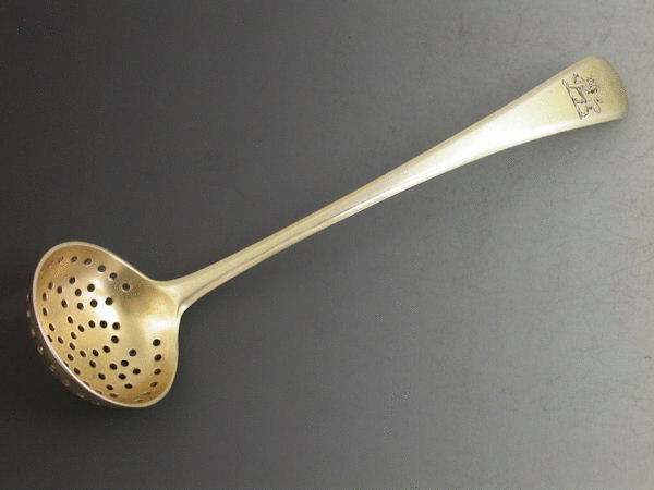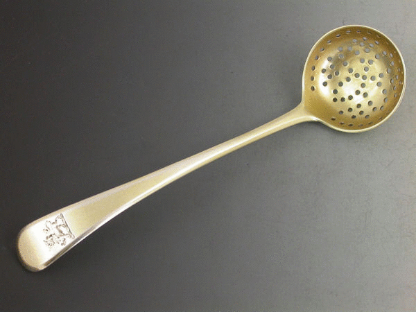 A good George III silver gilt Sifter Ladle of plain Old English form with pierced circular bowl, the handle engraved with a crest of a lion passant.