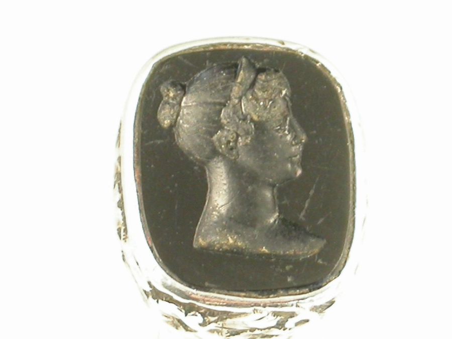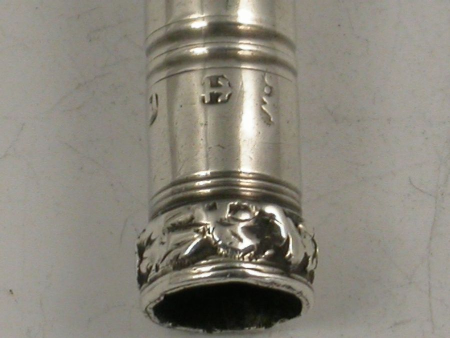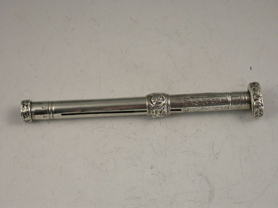 A rare Georgian silver Porte Crayon with integral Perpetual Calendar, the days of the week engraved on a moveable collar which is held in place by the screw off Seal cap. Unusual black agate Seal engraved with a ‘classical’ lady’s head. Repousse decorated sliding ring.