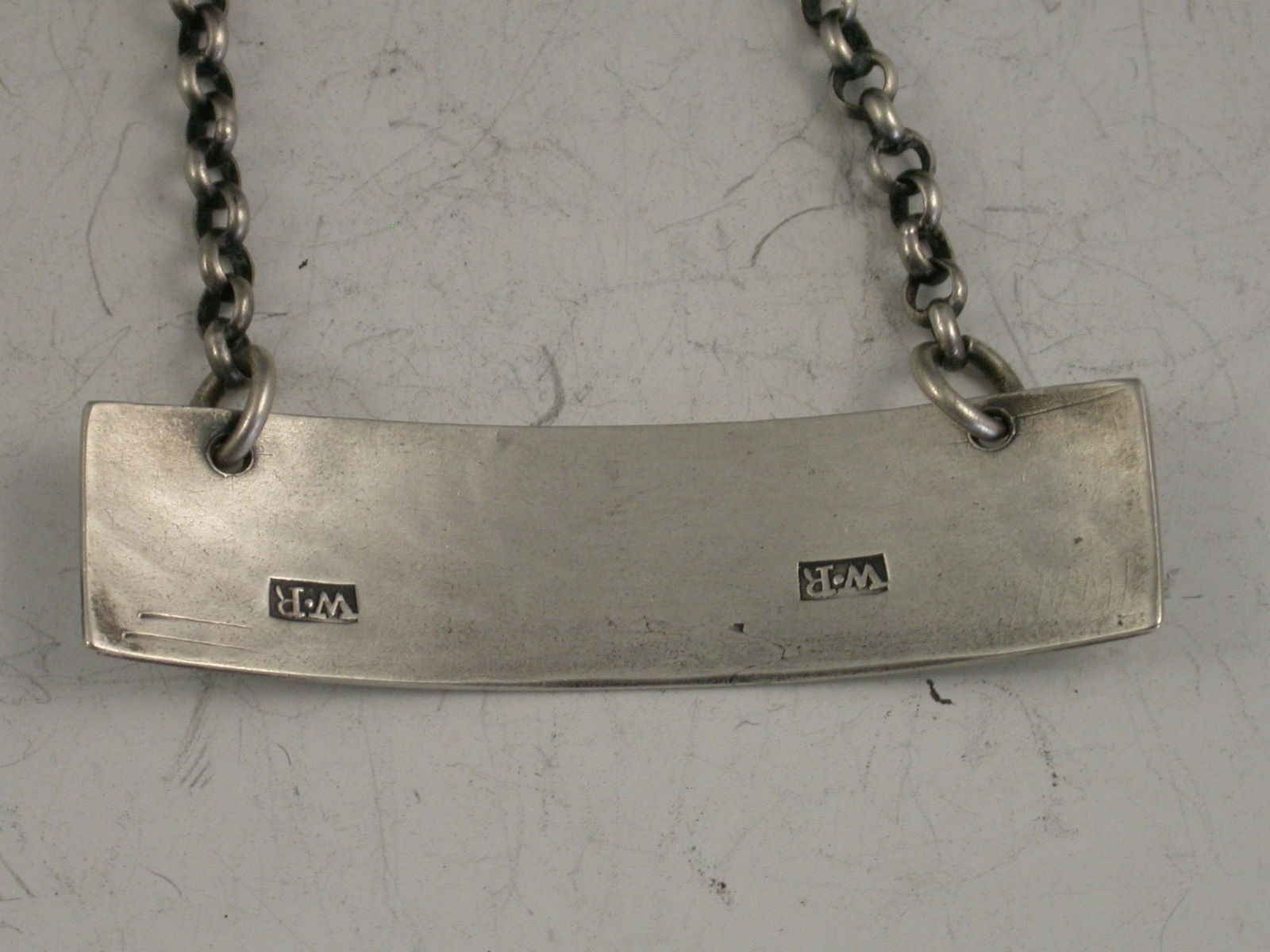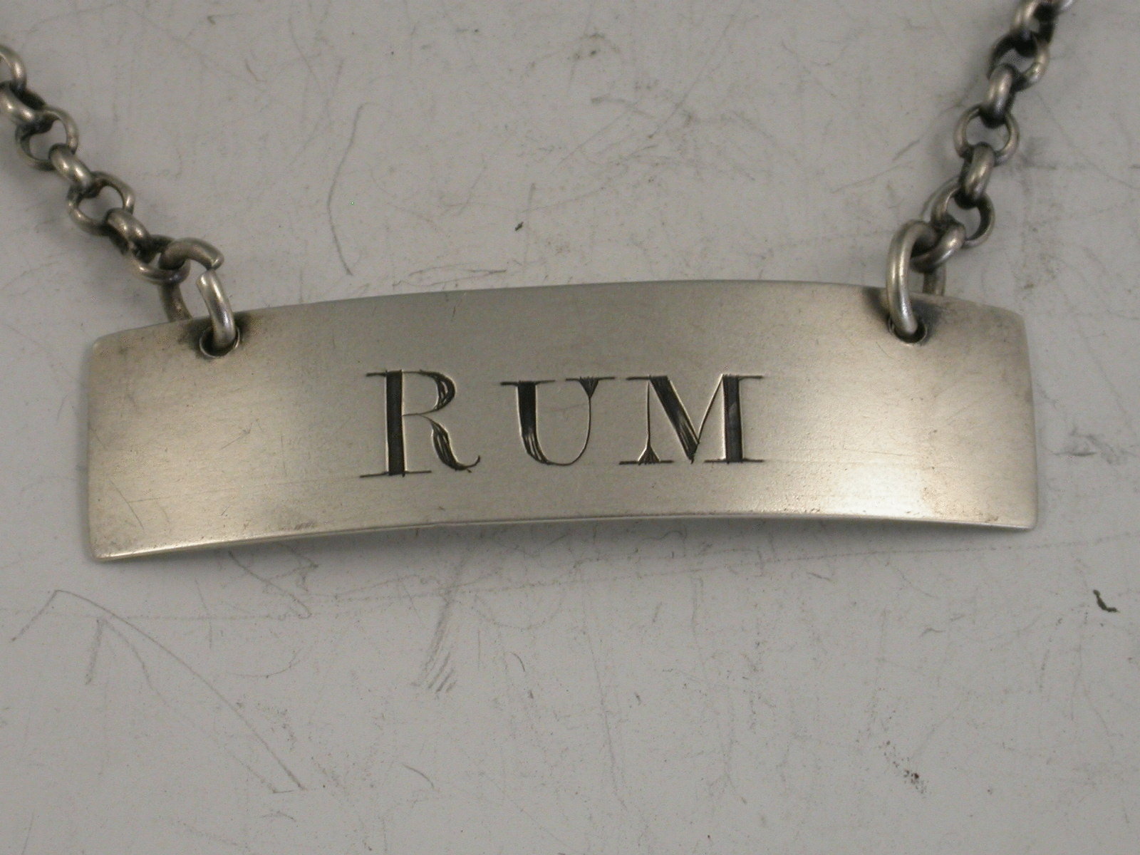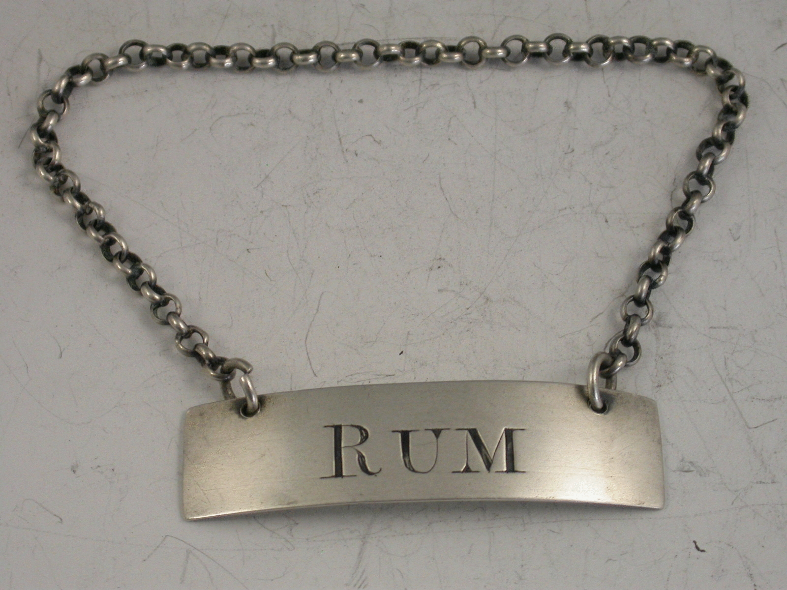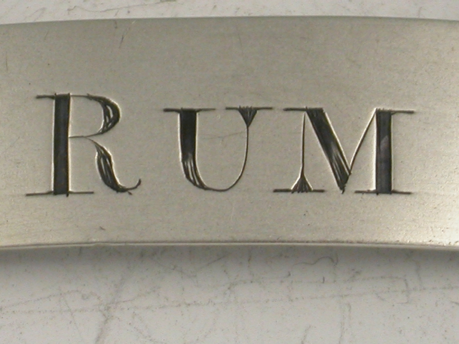 A Georgian silver Wine Label of plain narrow rectangular form, incised for Rum, the R engraved larger than the other two letters.