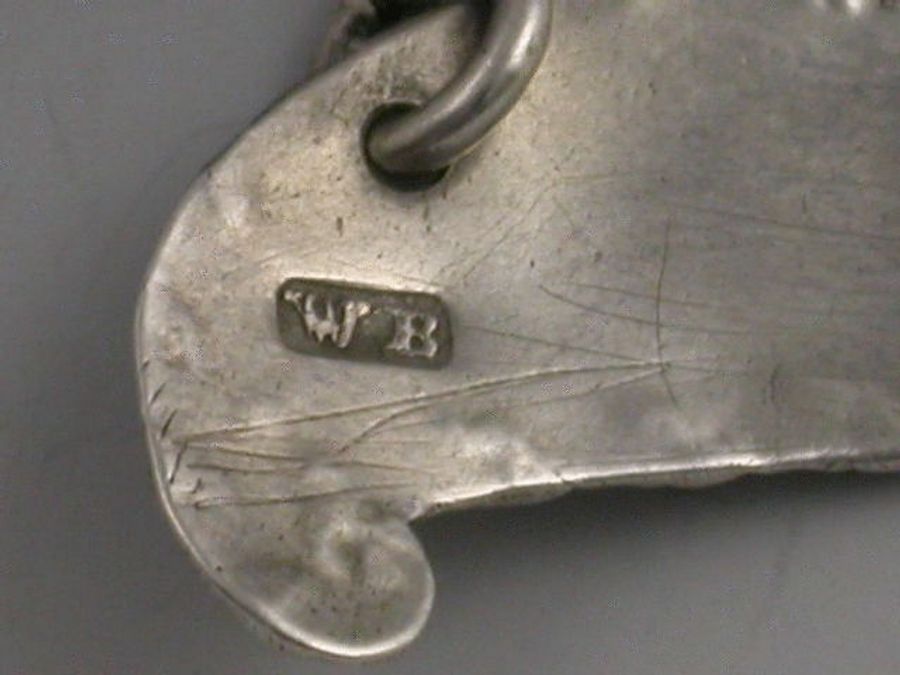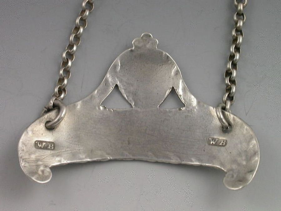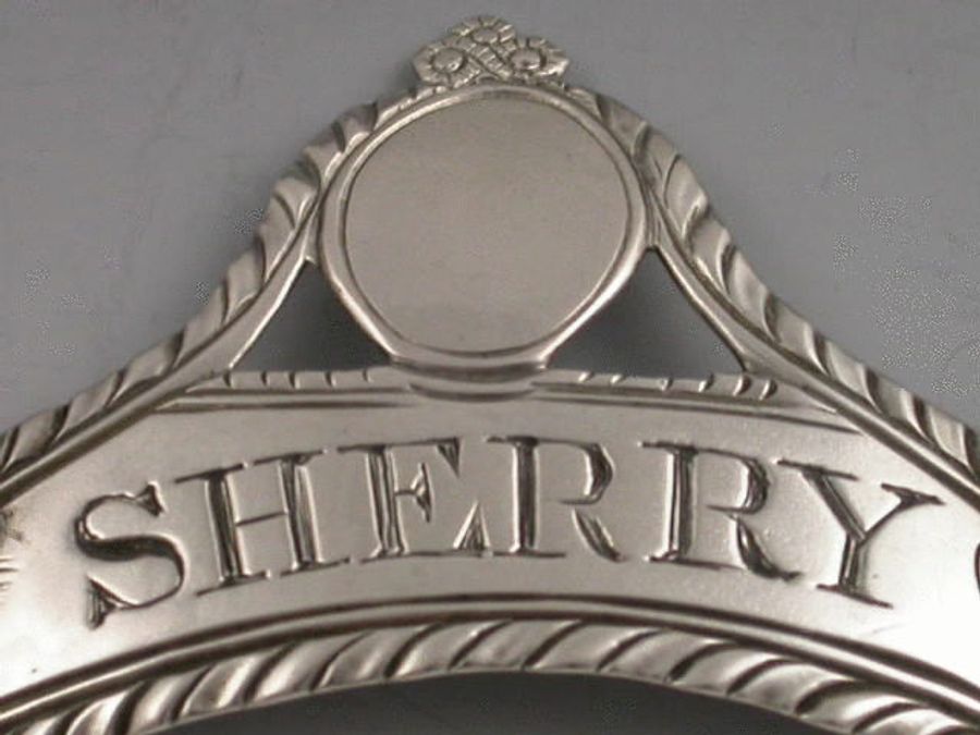 A good George III 18th century silver Wine Label of down turned crescent or scroll form with shield surmount, gadrooned border and bright cut engraved decoration, incised for SHERRY. Weight: 8 grams