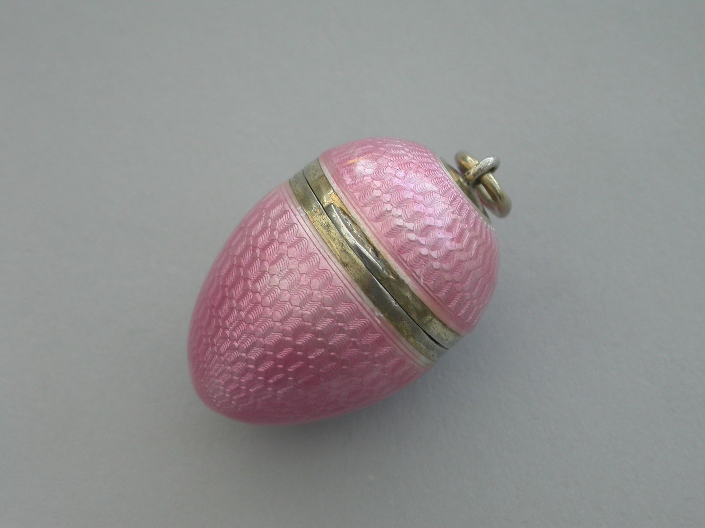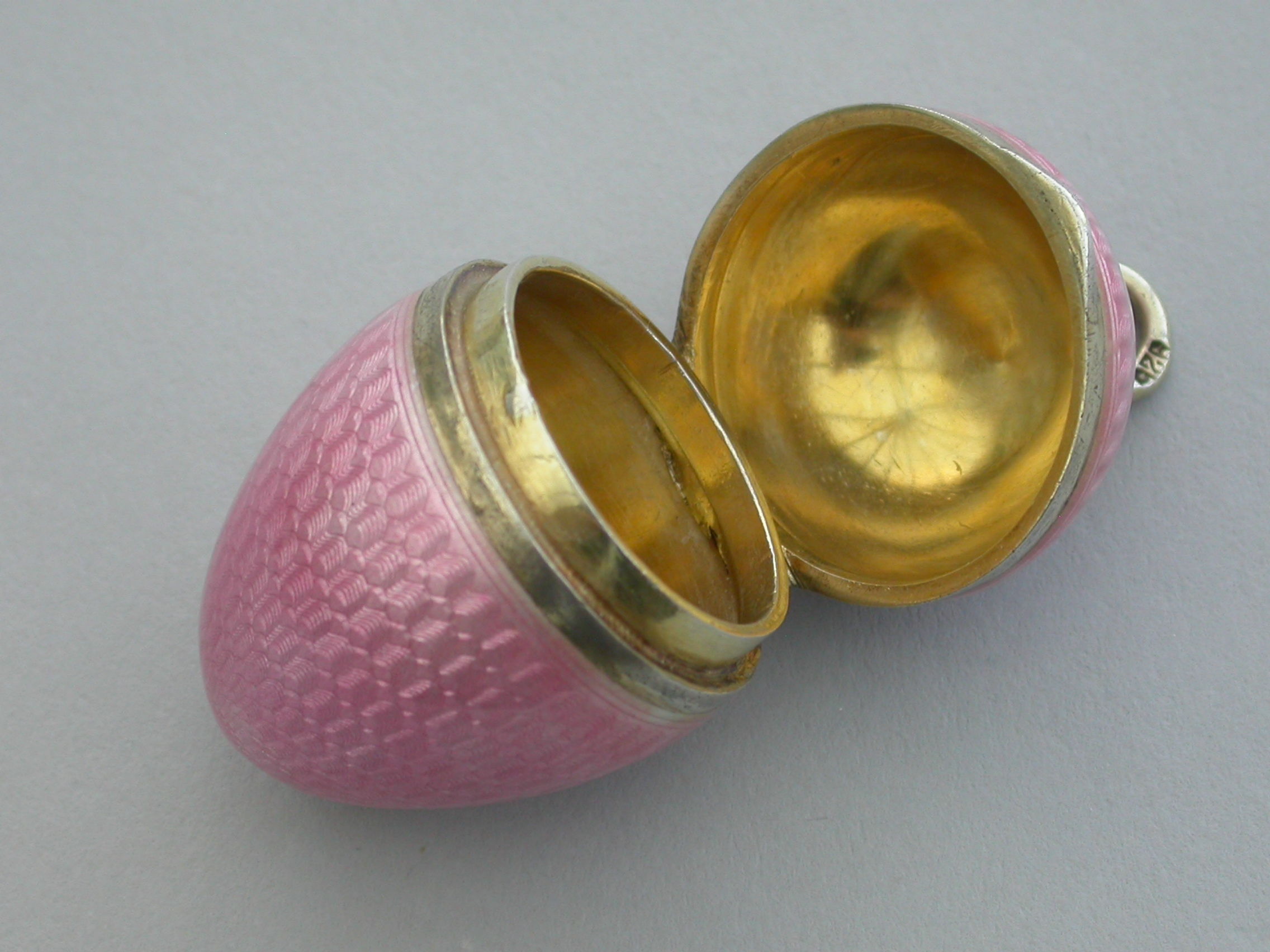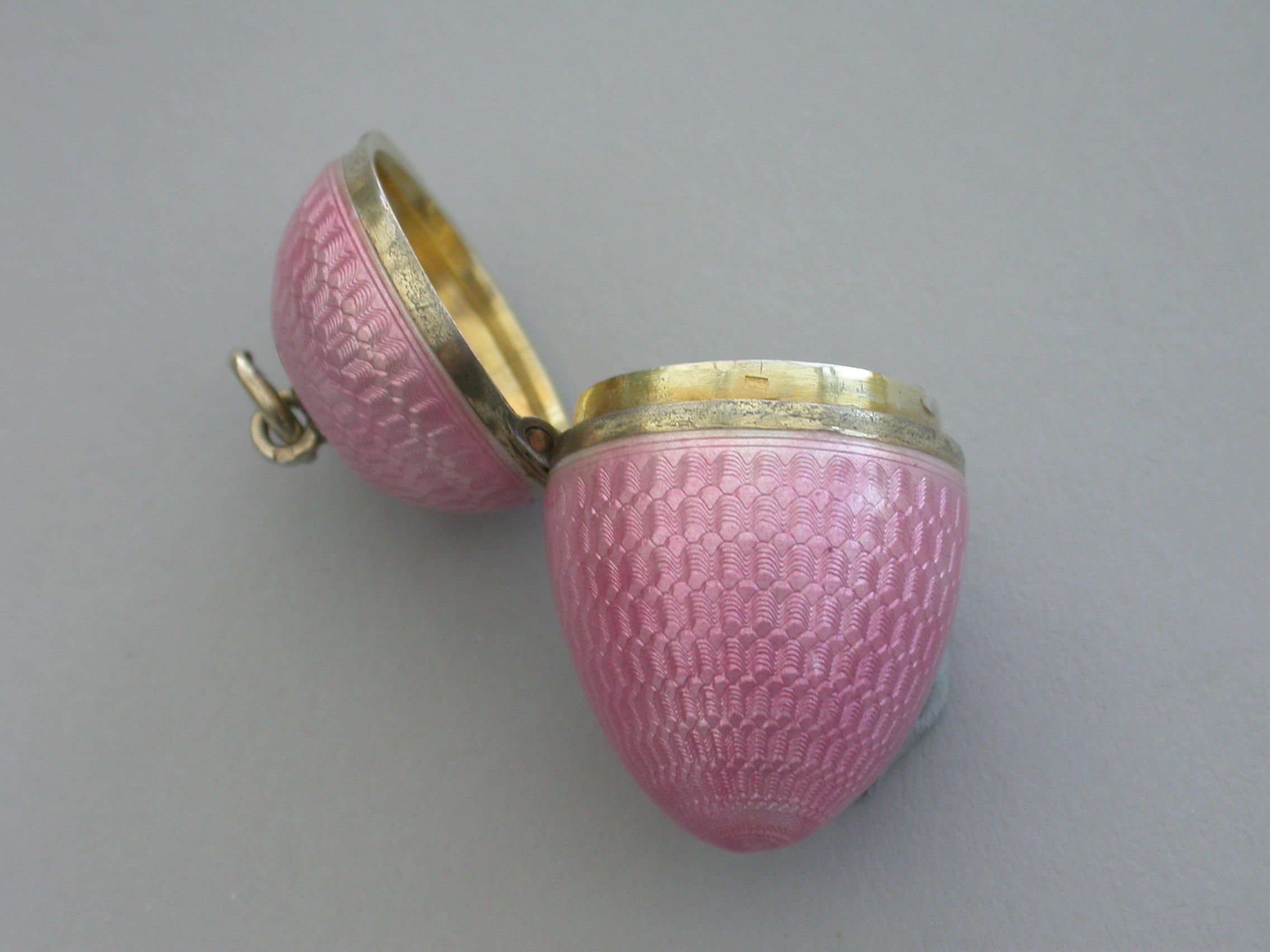 A good quality early 20th century silver and pink guilloche enamel Egg with hinged lid and silver gilt interior. Attached suspension ring.
