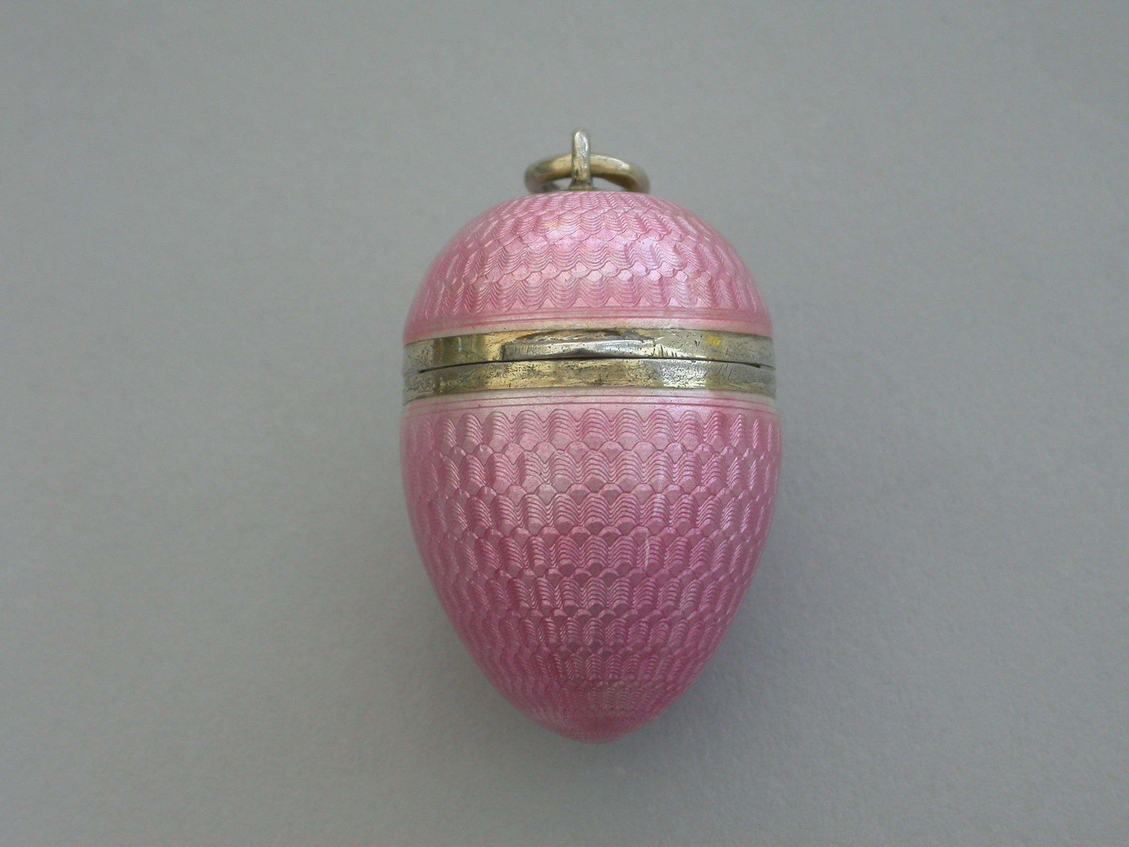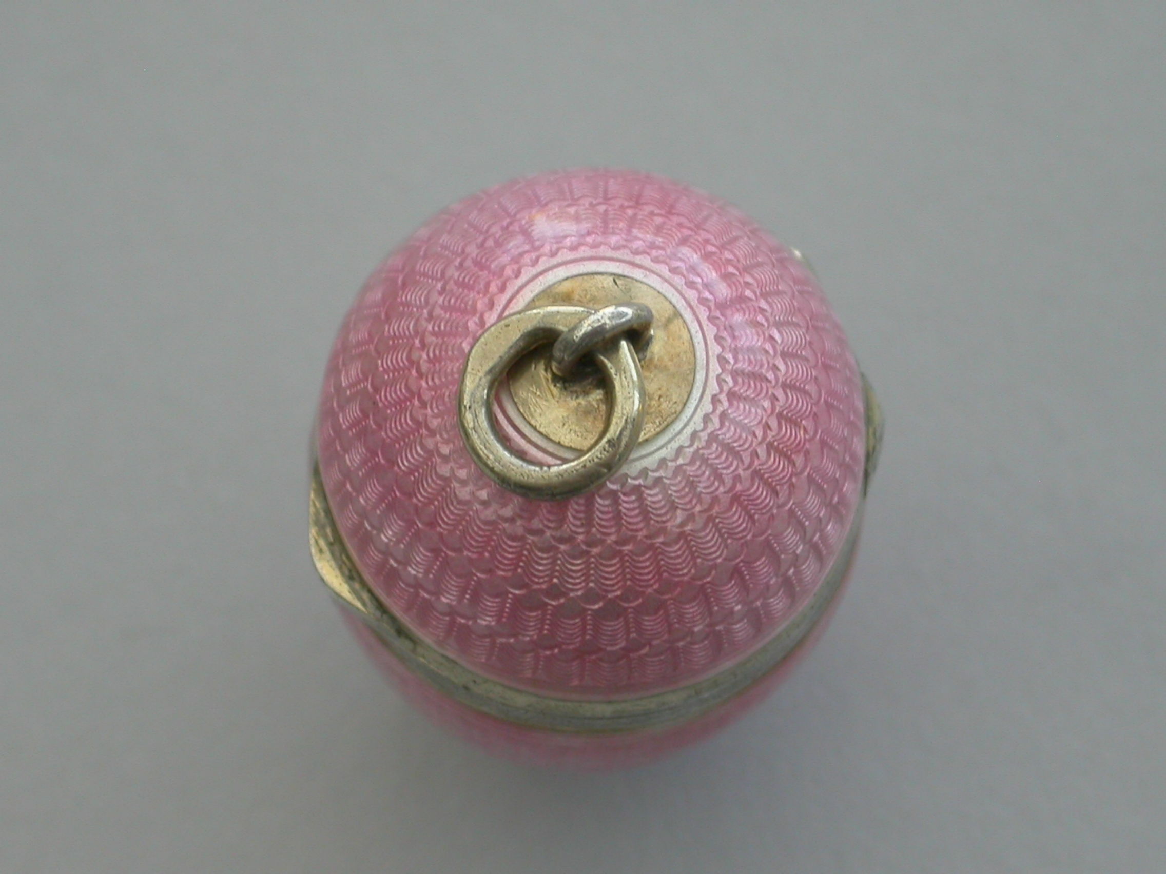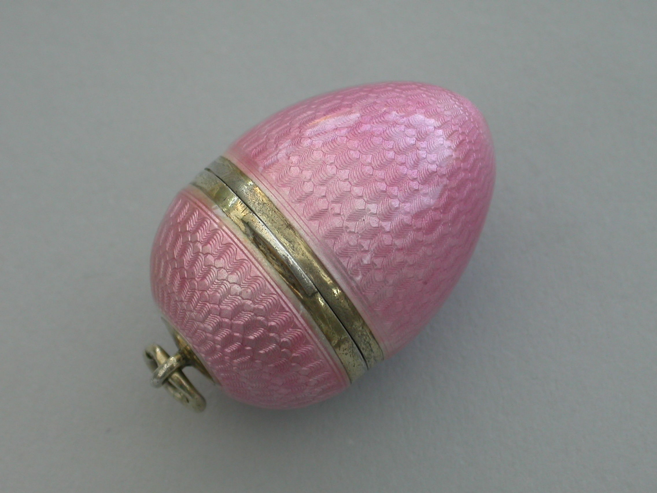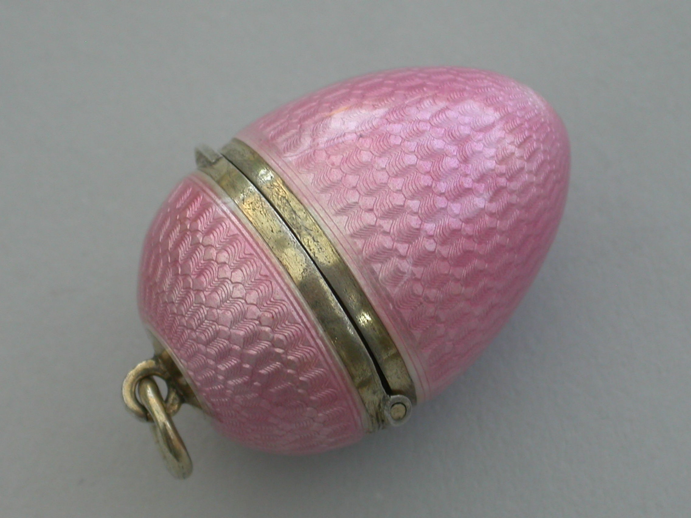 A good quality early 20th century silver and pink guilloche enamel Egg with hinged lid and silver gilt interior. Attached suspension ring.