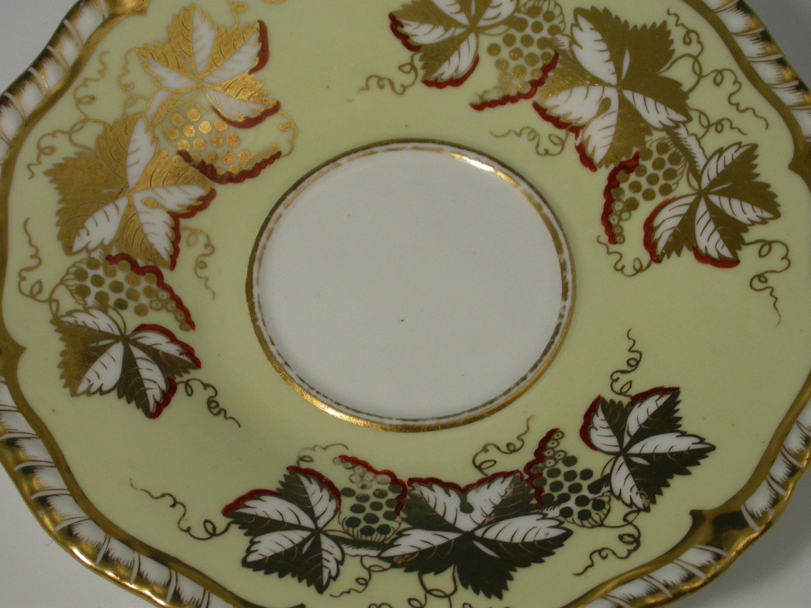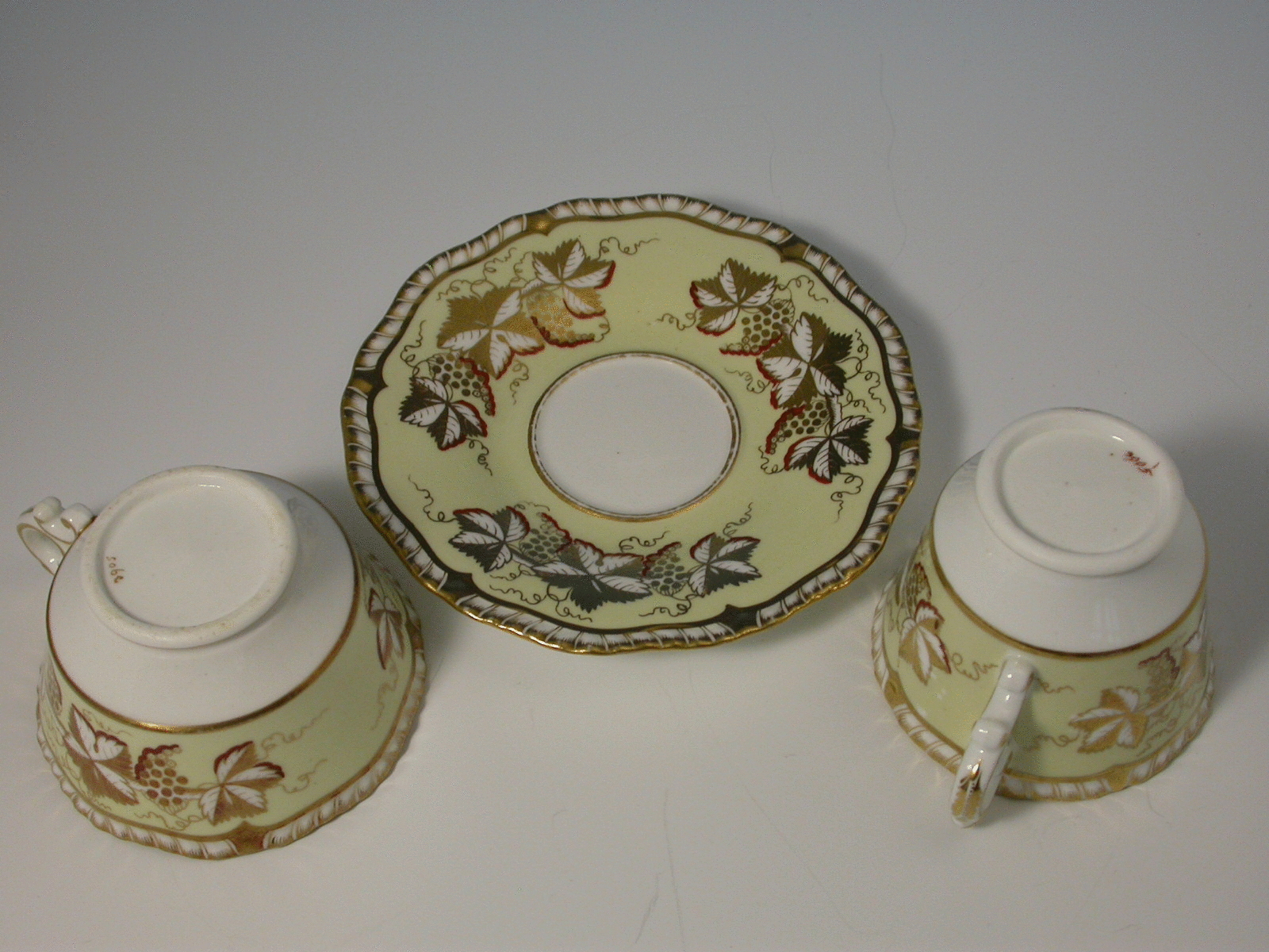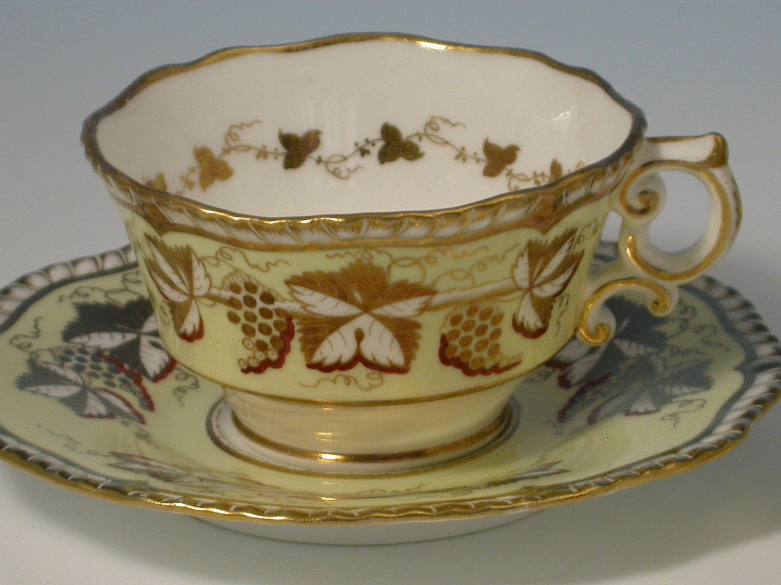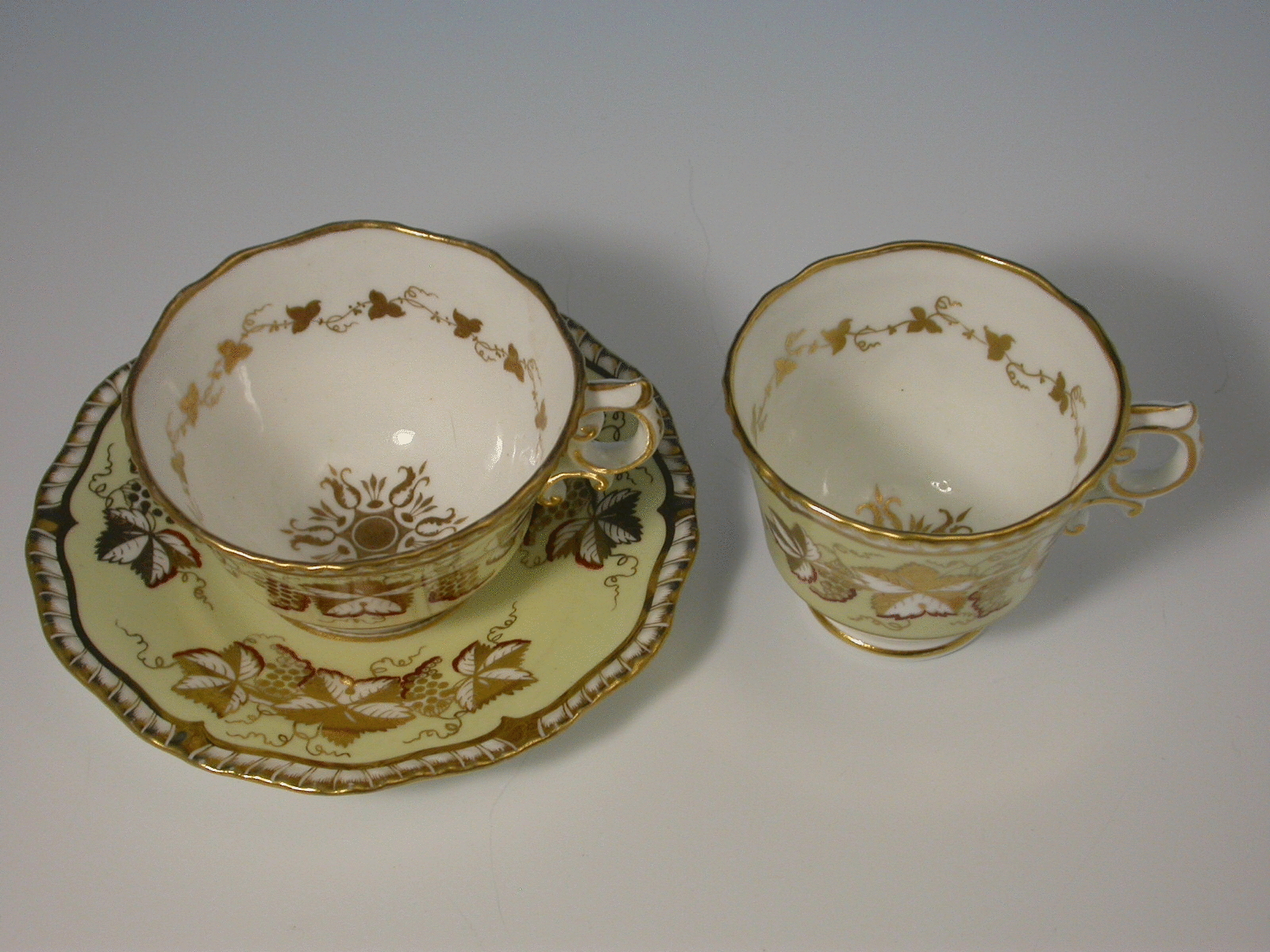 A good H & R Daniel Trio on a canary yellow ground with gilt vine leaf and grape decoration within gadrooned rims.