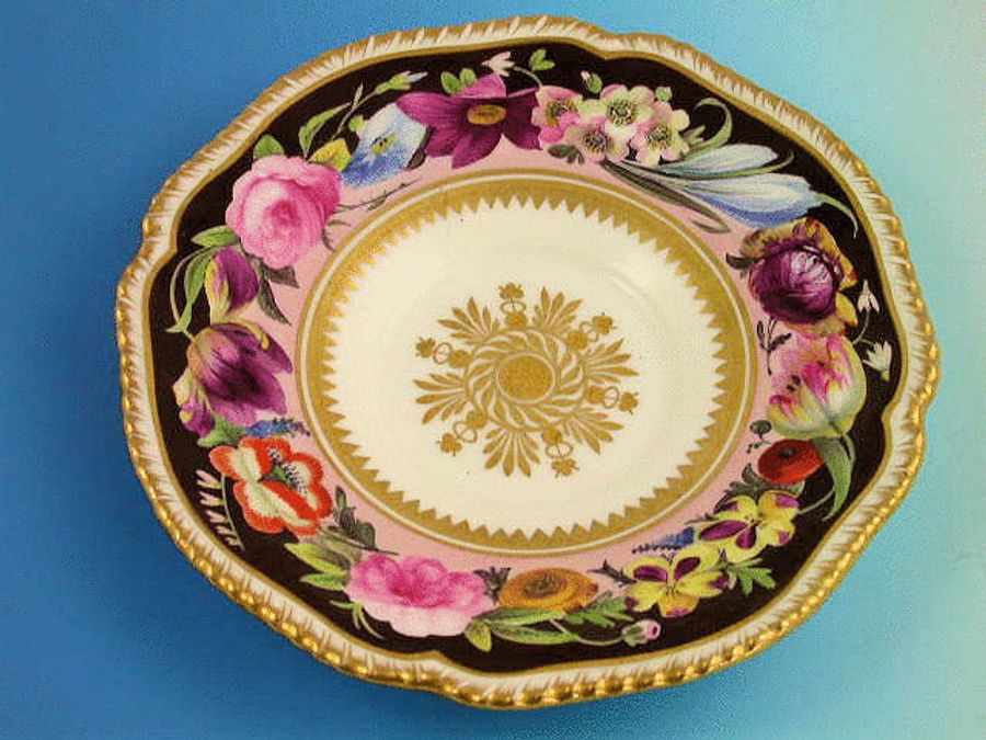 A good H & R Daniel moulded Creamboat on four leaf scroll feet with double scroll handle, decorated with a spray of English flowers enclosed by a gilt enriched cobalt blue border and canary yellow panels enriched with gilt scrolls.