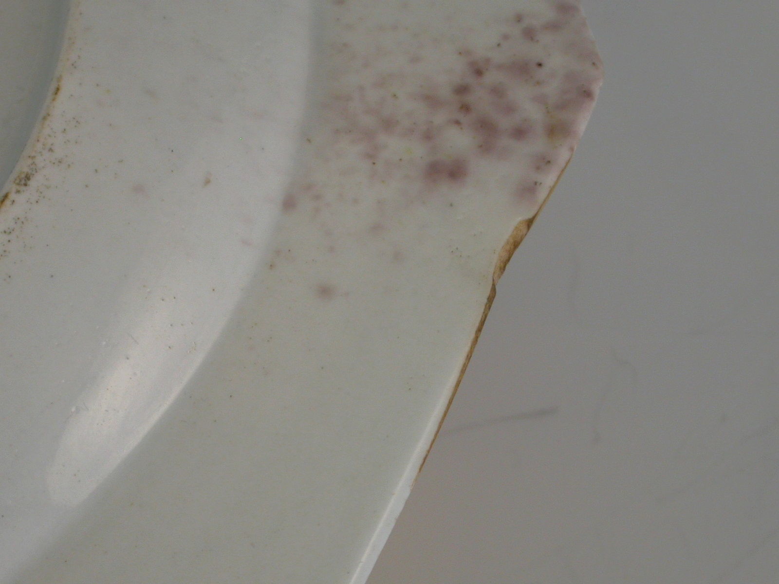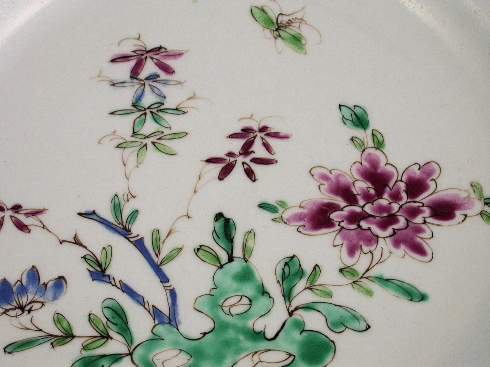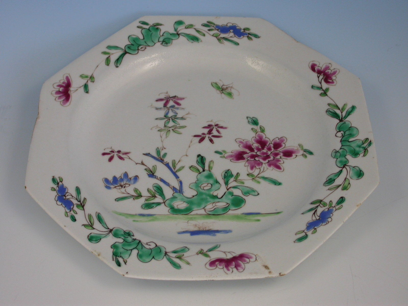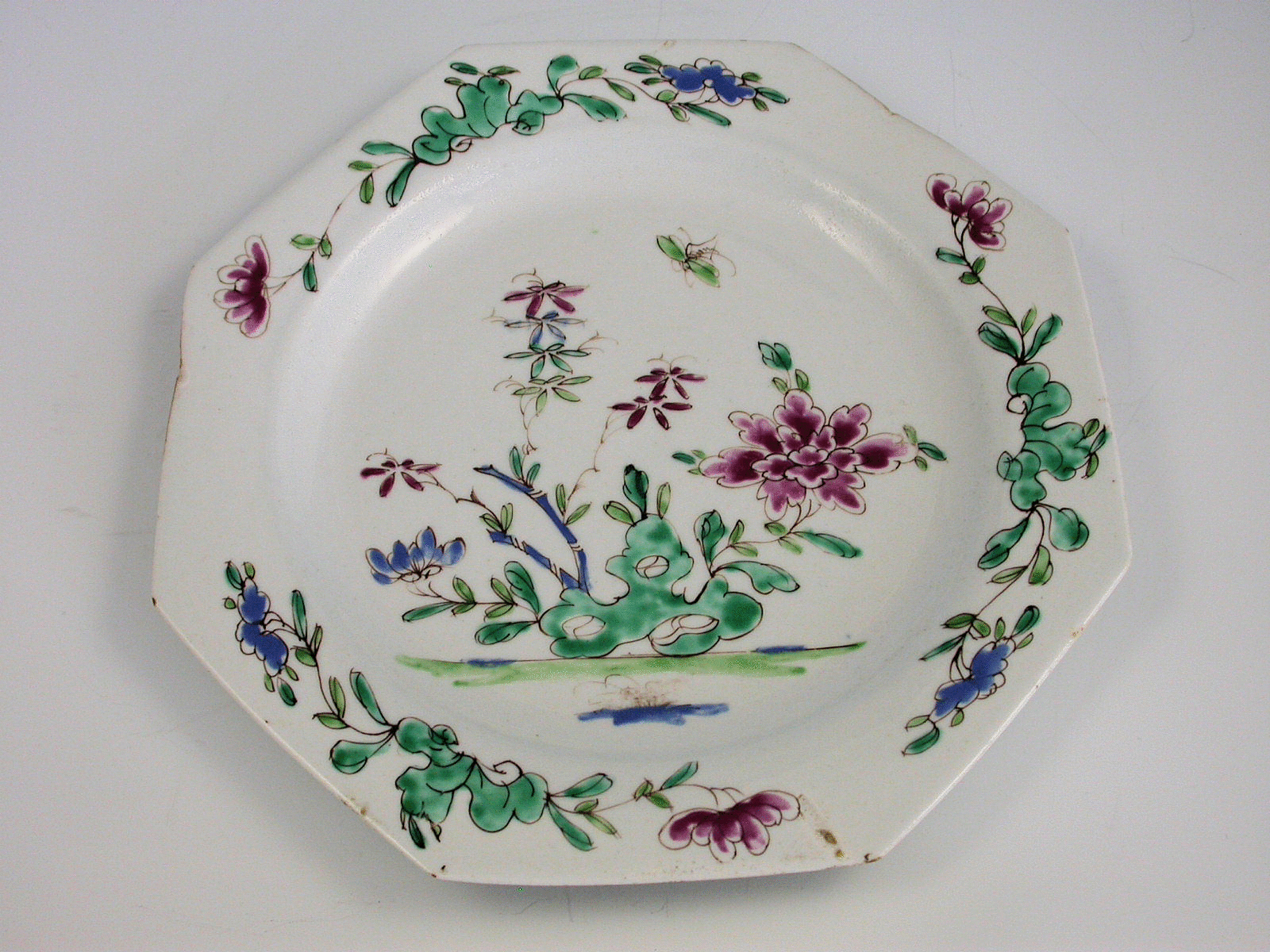 A very rare early Bow famille rose octagonal plate painted in typical style but with a green painted three holed rock.