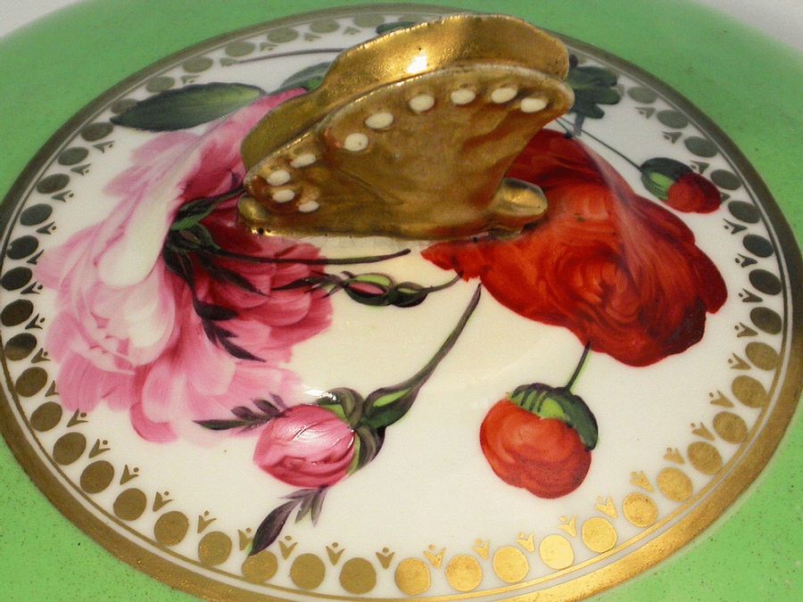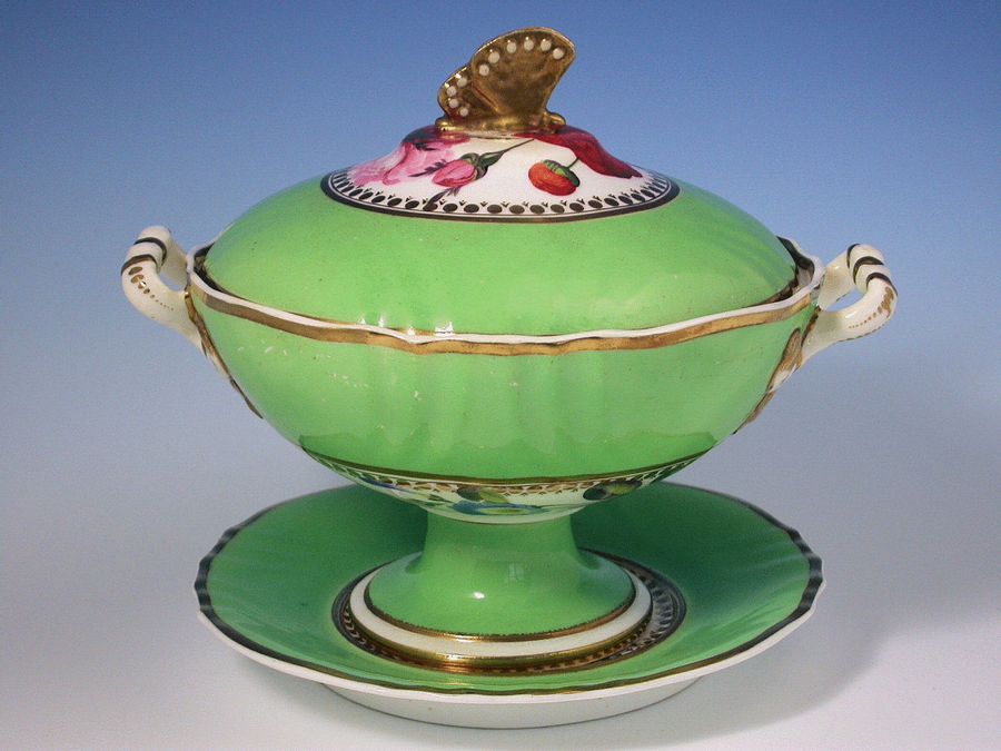 A good H & R Daniel circular cream Tureen, Cover and Stand, with gilt butterfly finial, painted with botanical flowers on a green ground, gilt line rims.