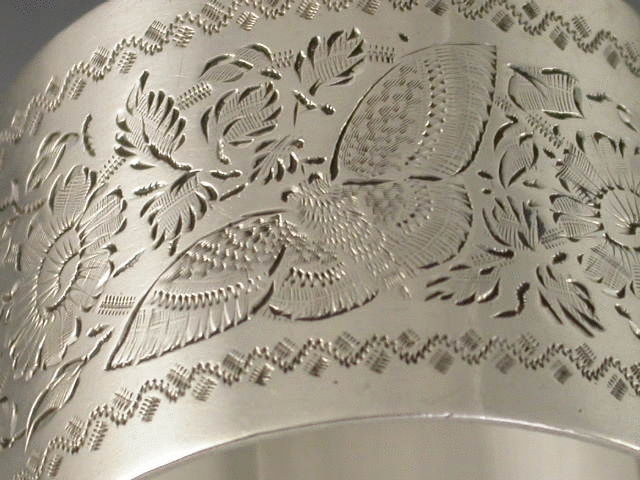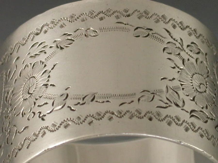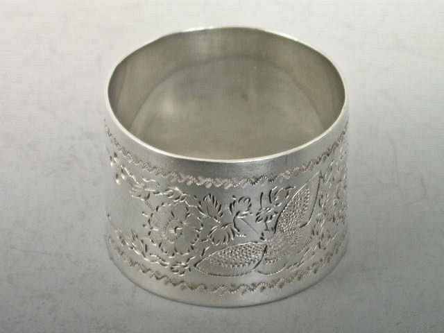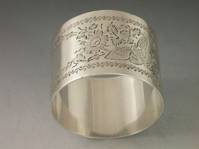 A good heavy Victorian silver Napkin Ring, chased and engraved with flowers, leaves and Moths or Butterflies. Two vacant cartouches.