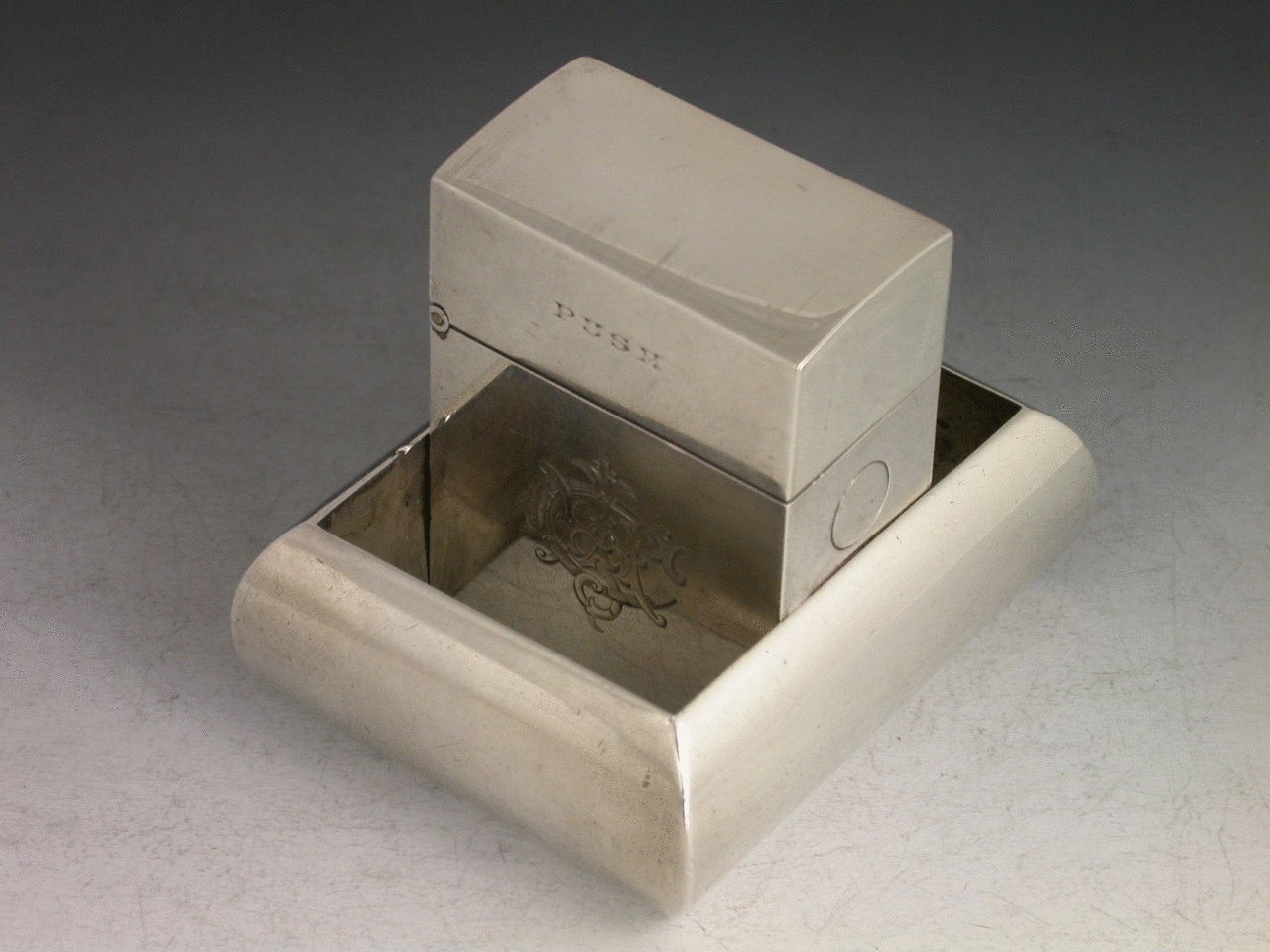 An ingenious Victorian silver Travelling Inkwell, of plain rounded rectangular form when closed. The inkwell is opened by pushing one end down so that the central section swivels on an axis and can stand upright where it locks in place. Pushing the button opens the catch to reveal a snug fitting inner glass ink bottle. The lid is corked to form a seal to prevent leakage. The face engraved with a contemporary cipher and the word ‘push’.